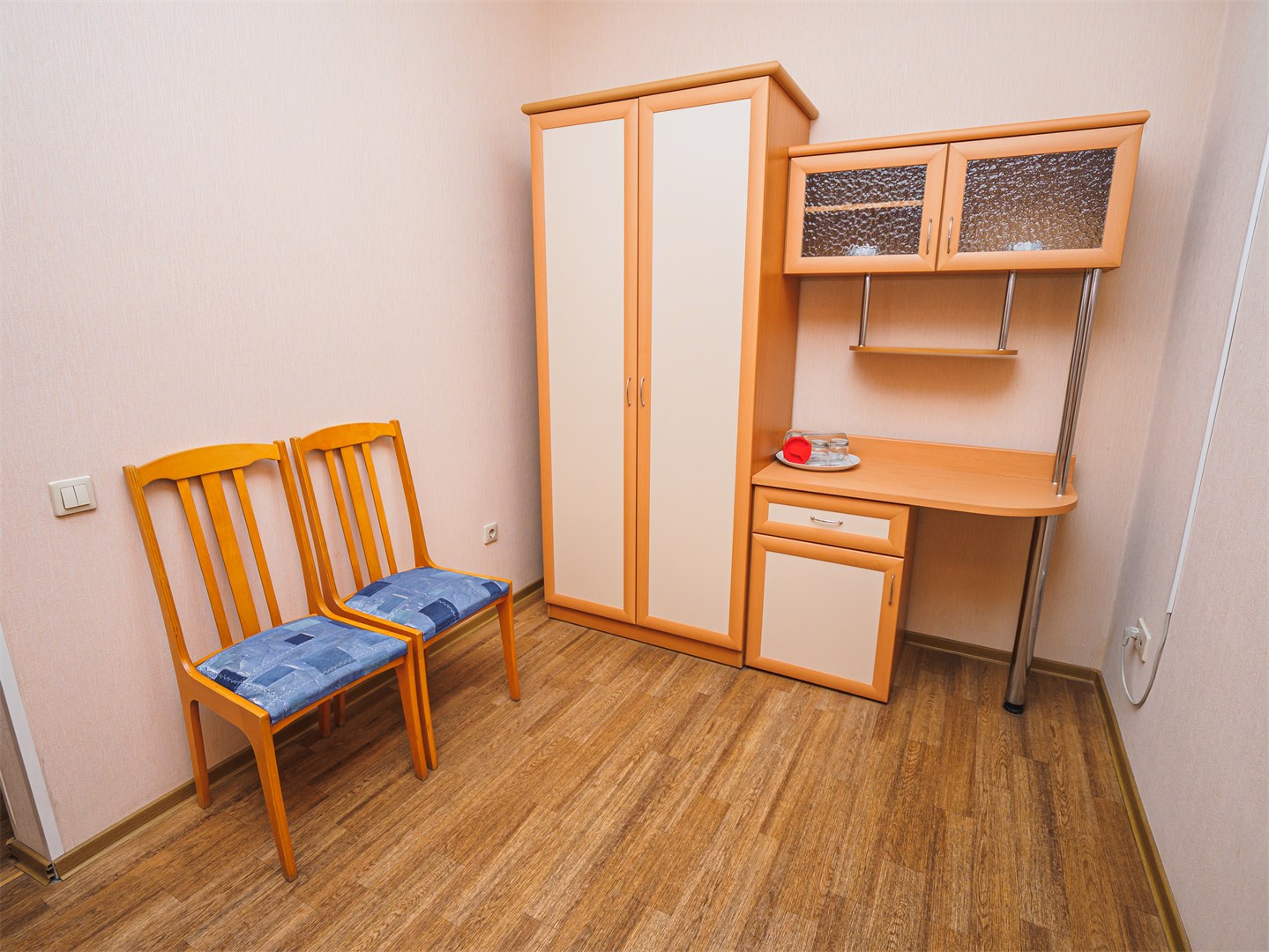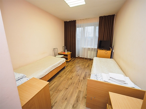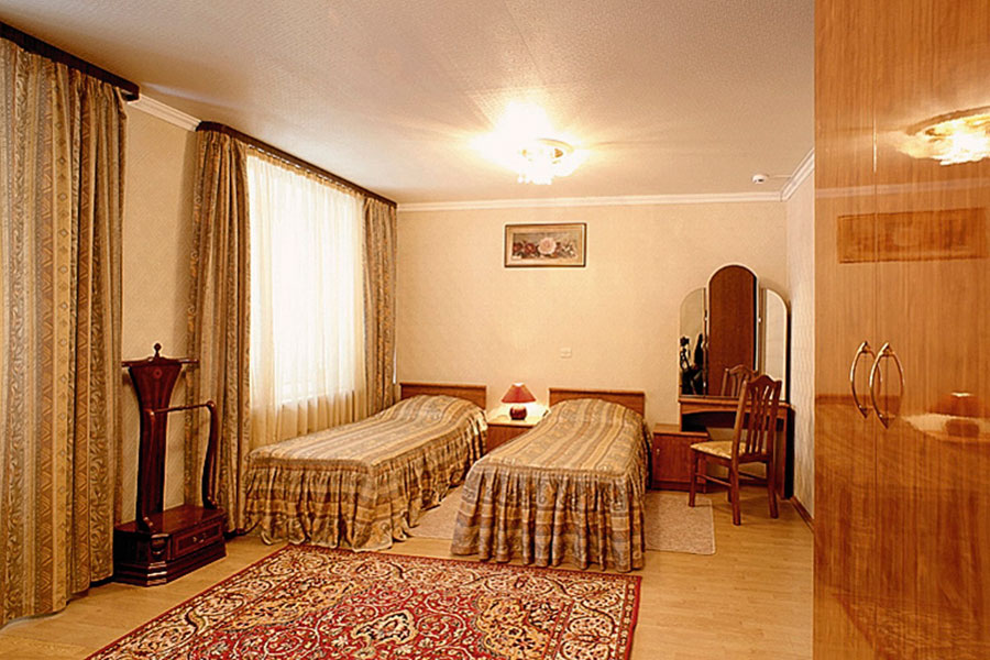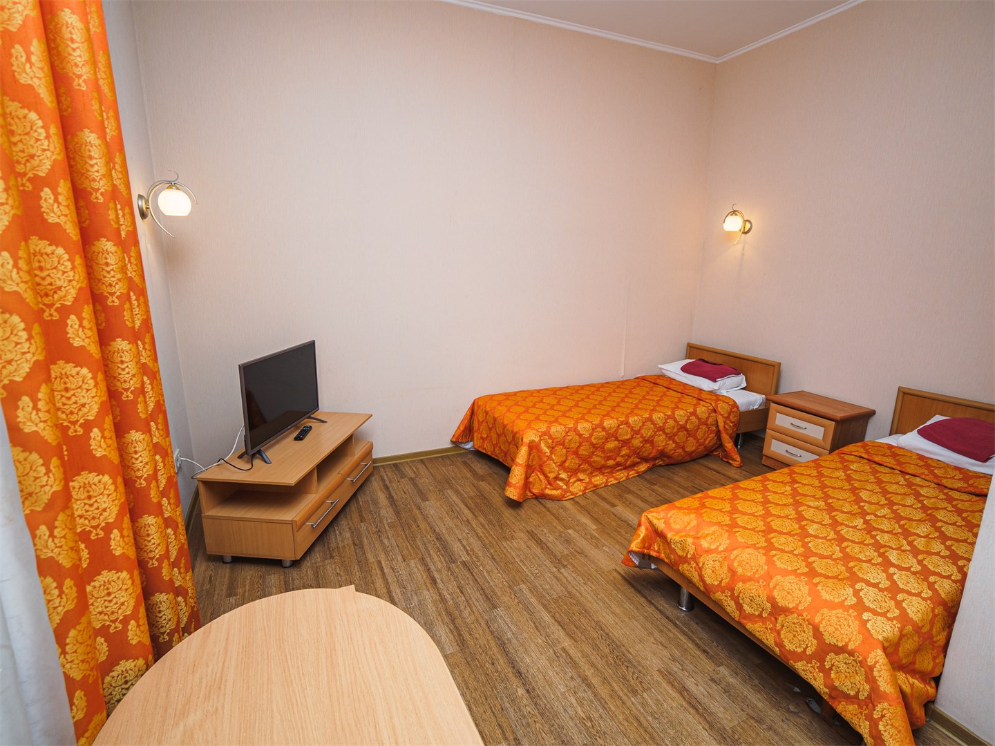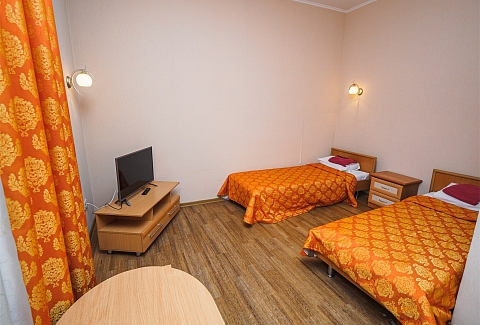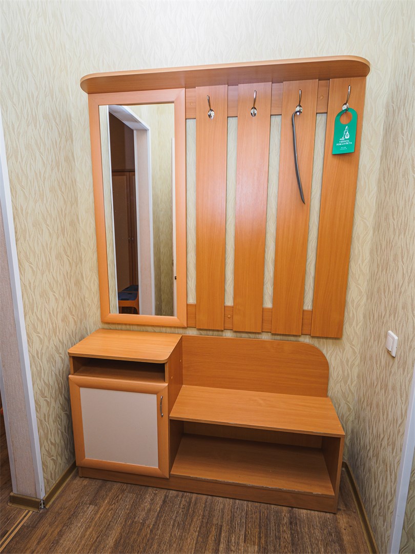 В номере: вешалка, зеркало, кровати односпальные, прикроватные тумбочки, столик журнальный, стулья, шкаф, мини-холодильник, телевизор ЖК