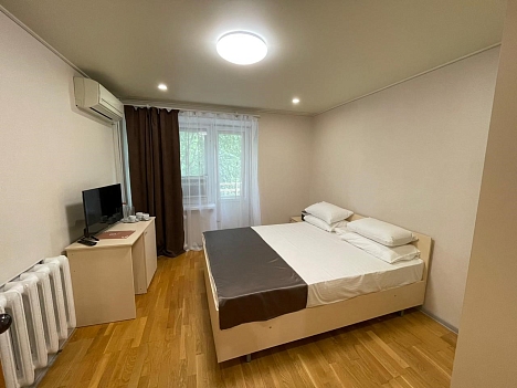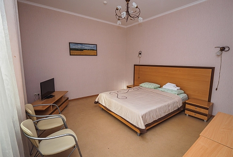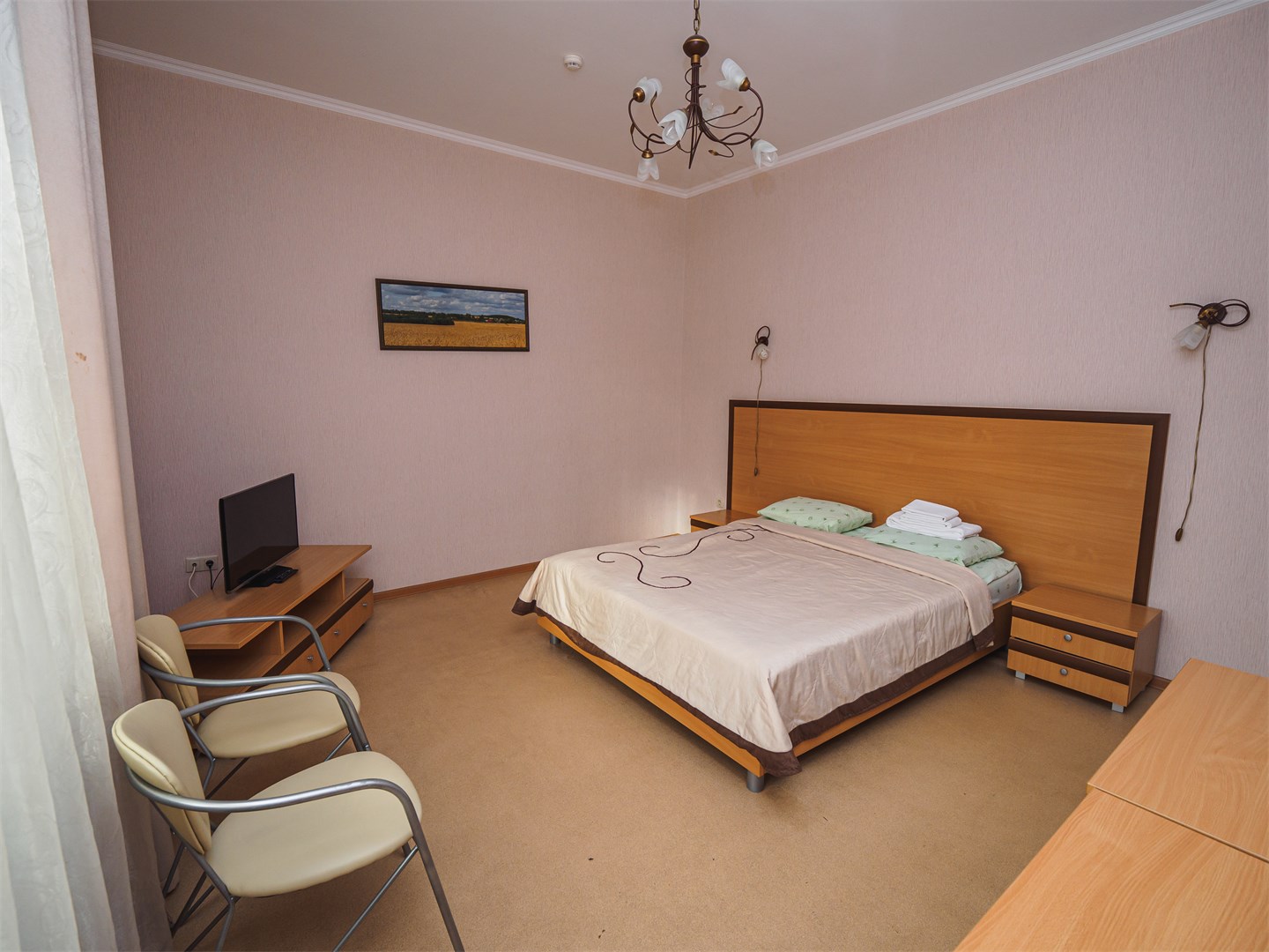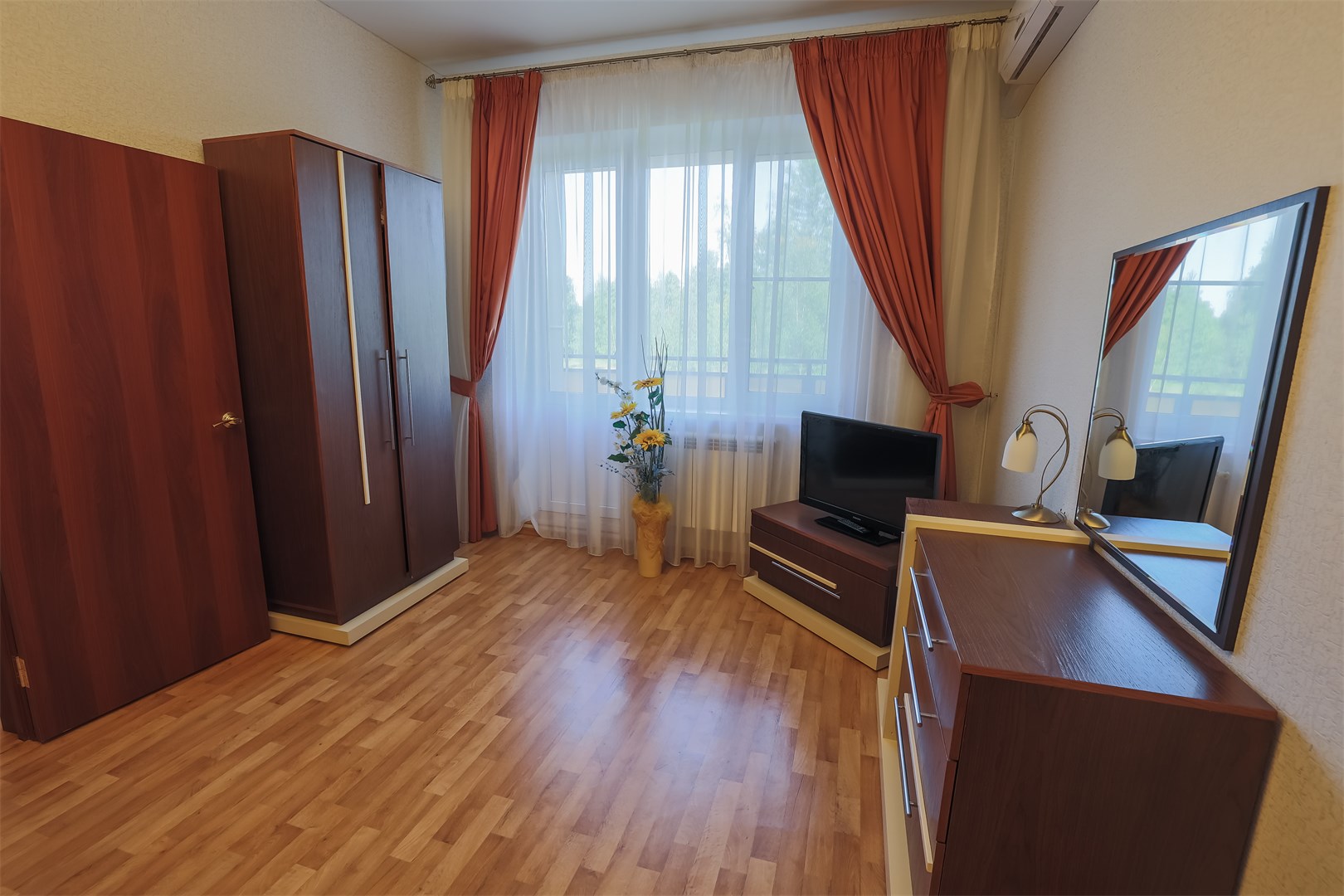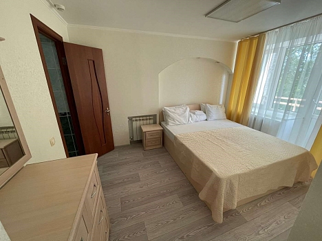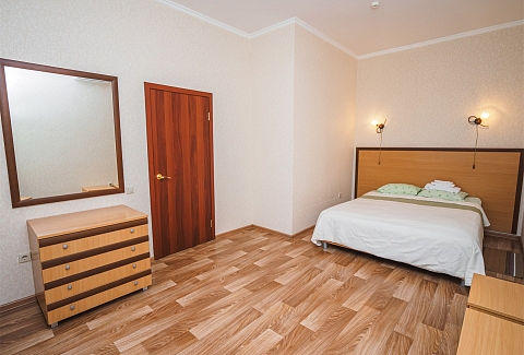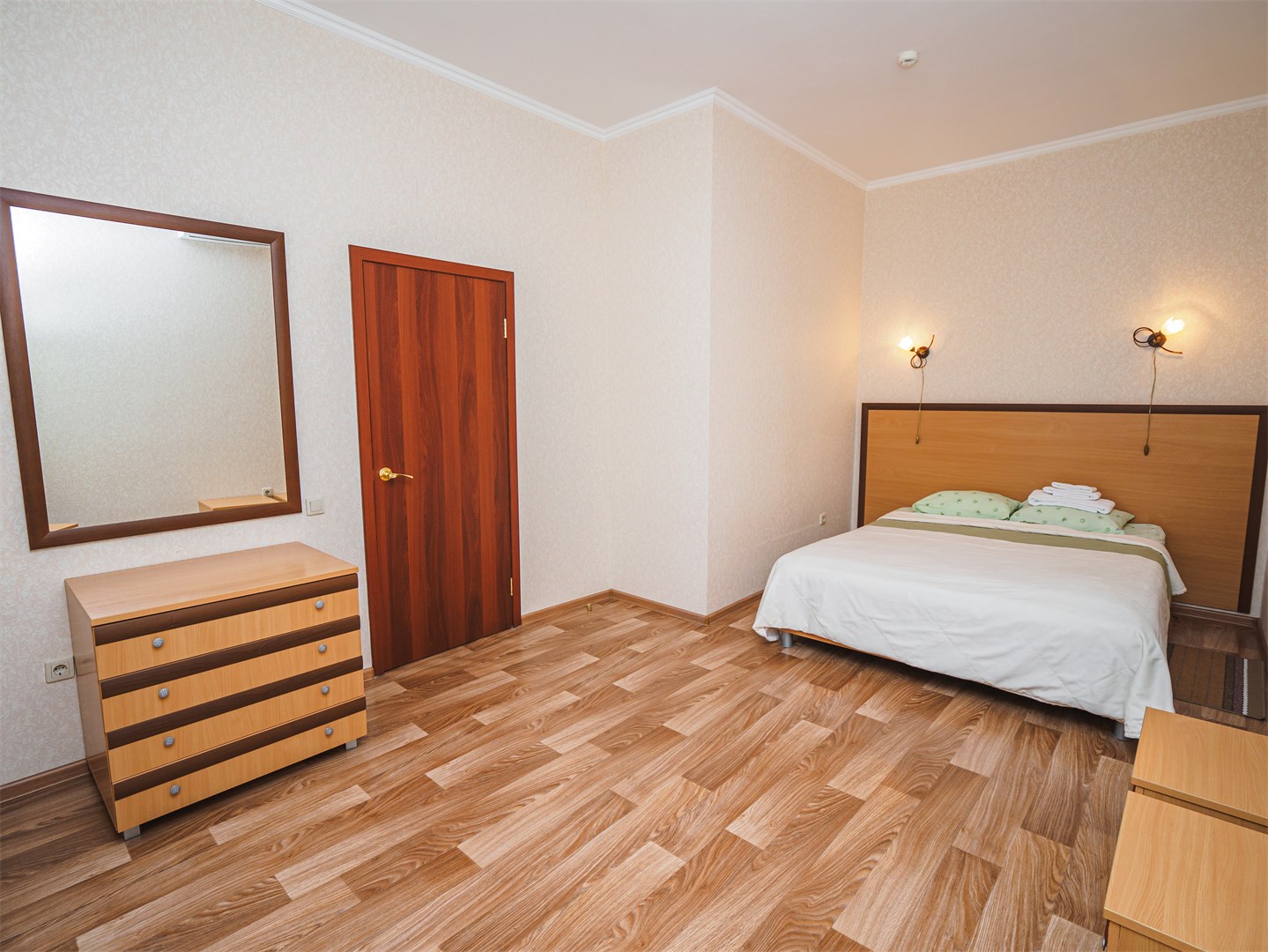 В номере: вешалка, диван, зеркало, комод, кровать двуспальная, прикроватные тумбочки, стол, стулья, шкаф, мини-холодильник, набор посуды, телевизор ЖК