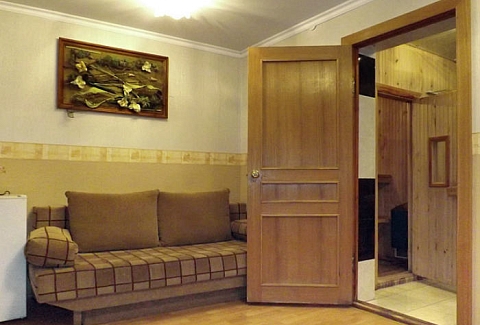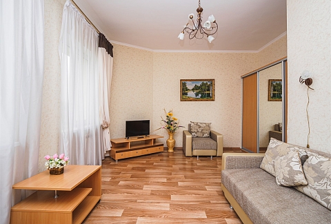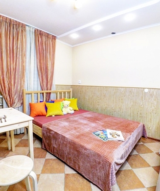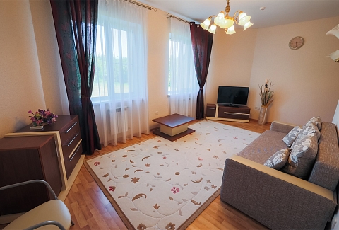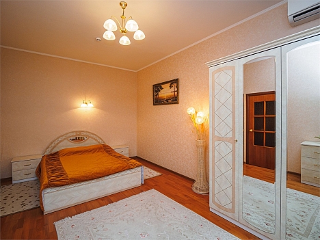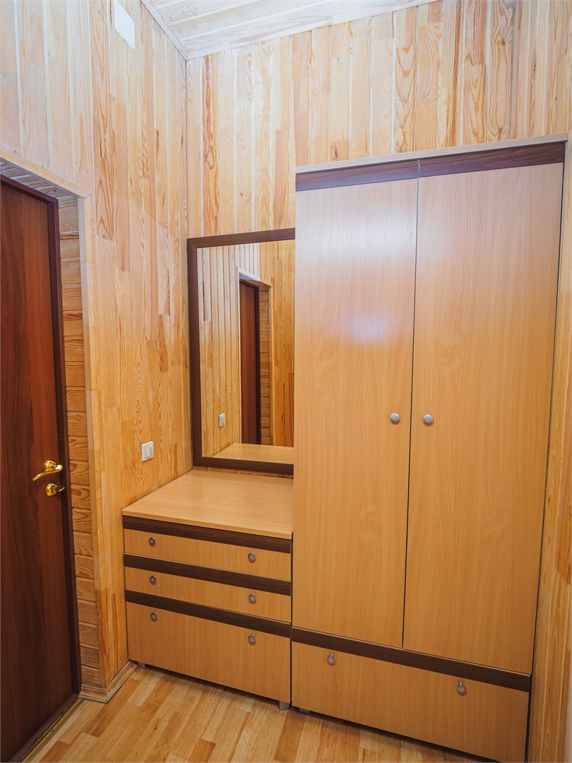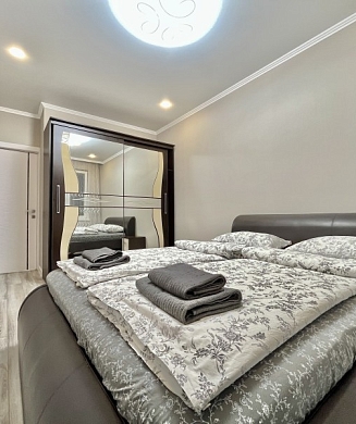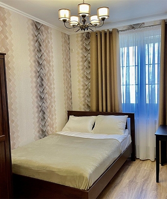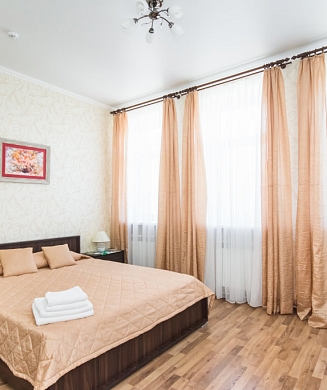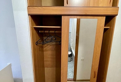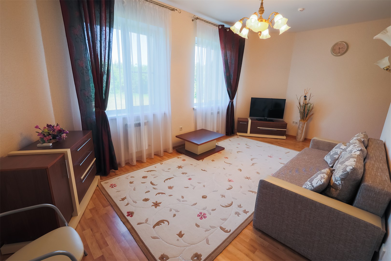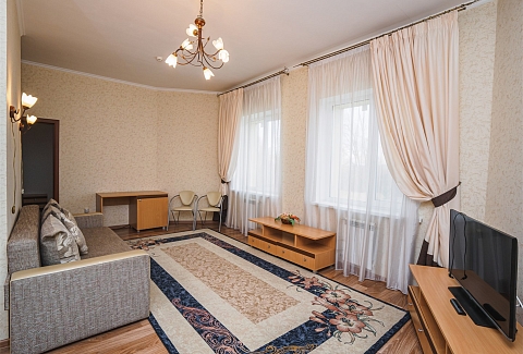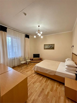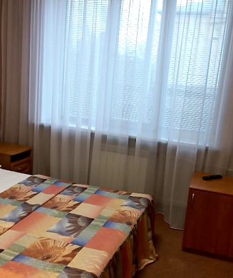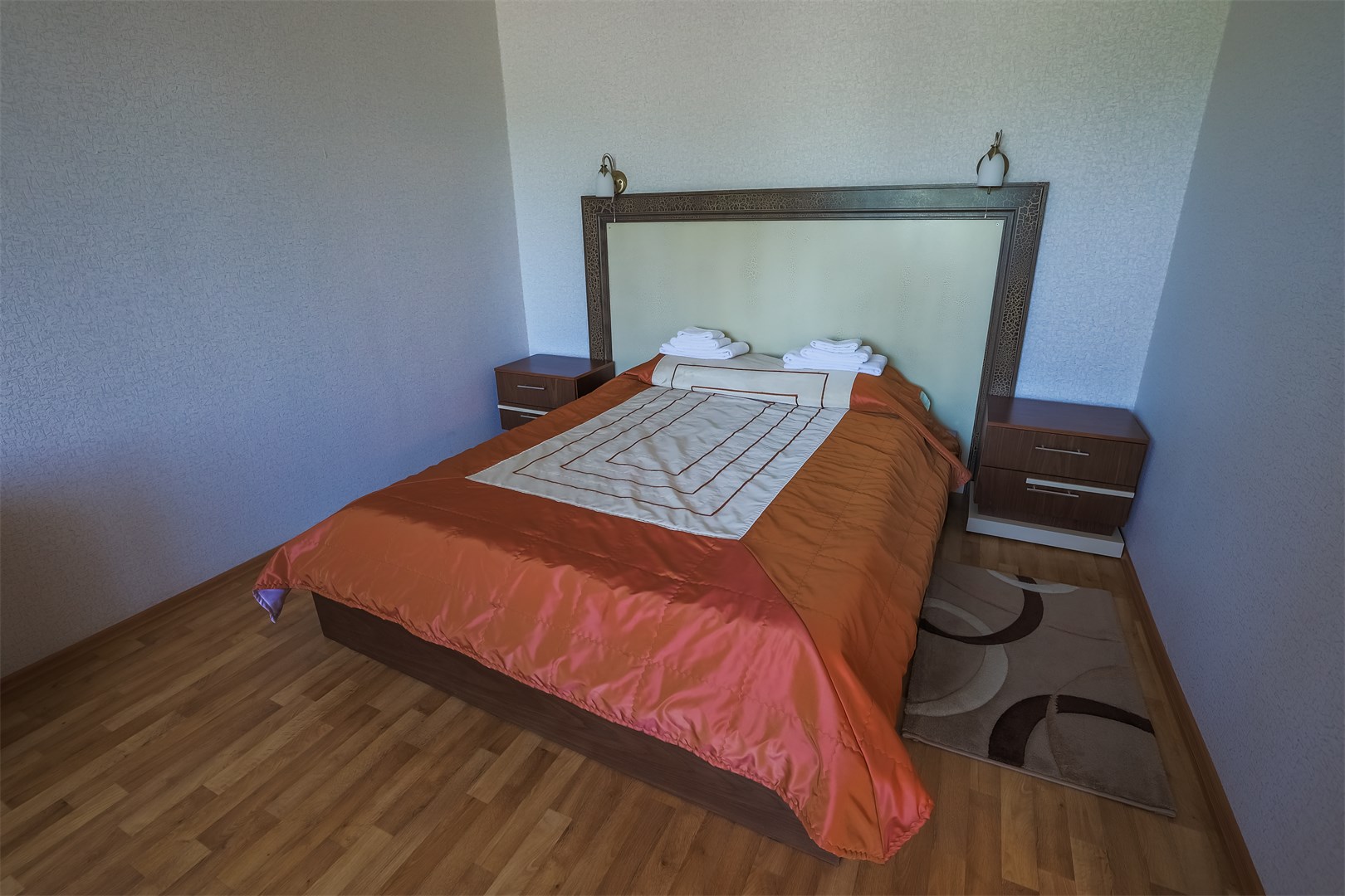 В номере: вешалка, диван, зеркало, комод, кровать двуспальная, прикроватные тумбочки, стол, стулья, шкаф, мини-холодильник, набор посуды, телевизор ЖК