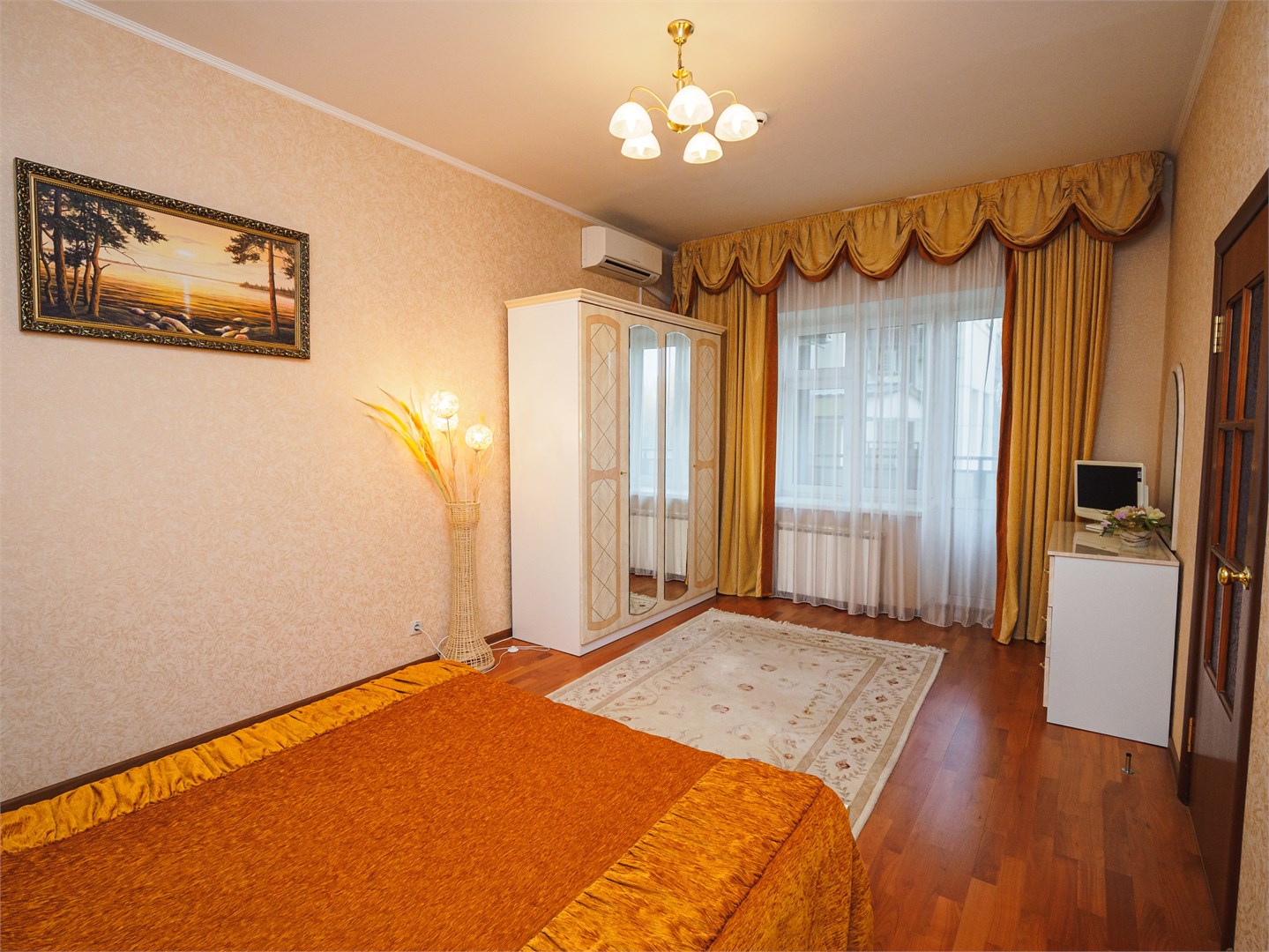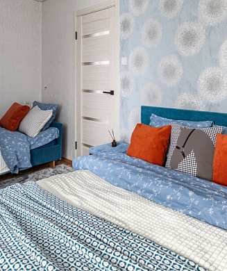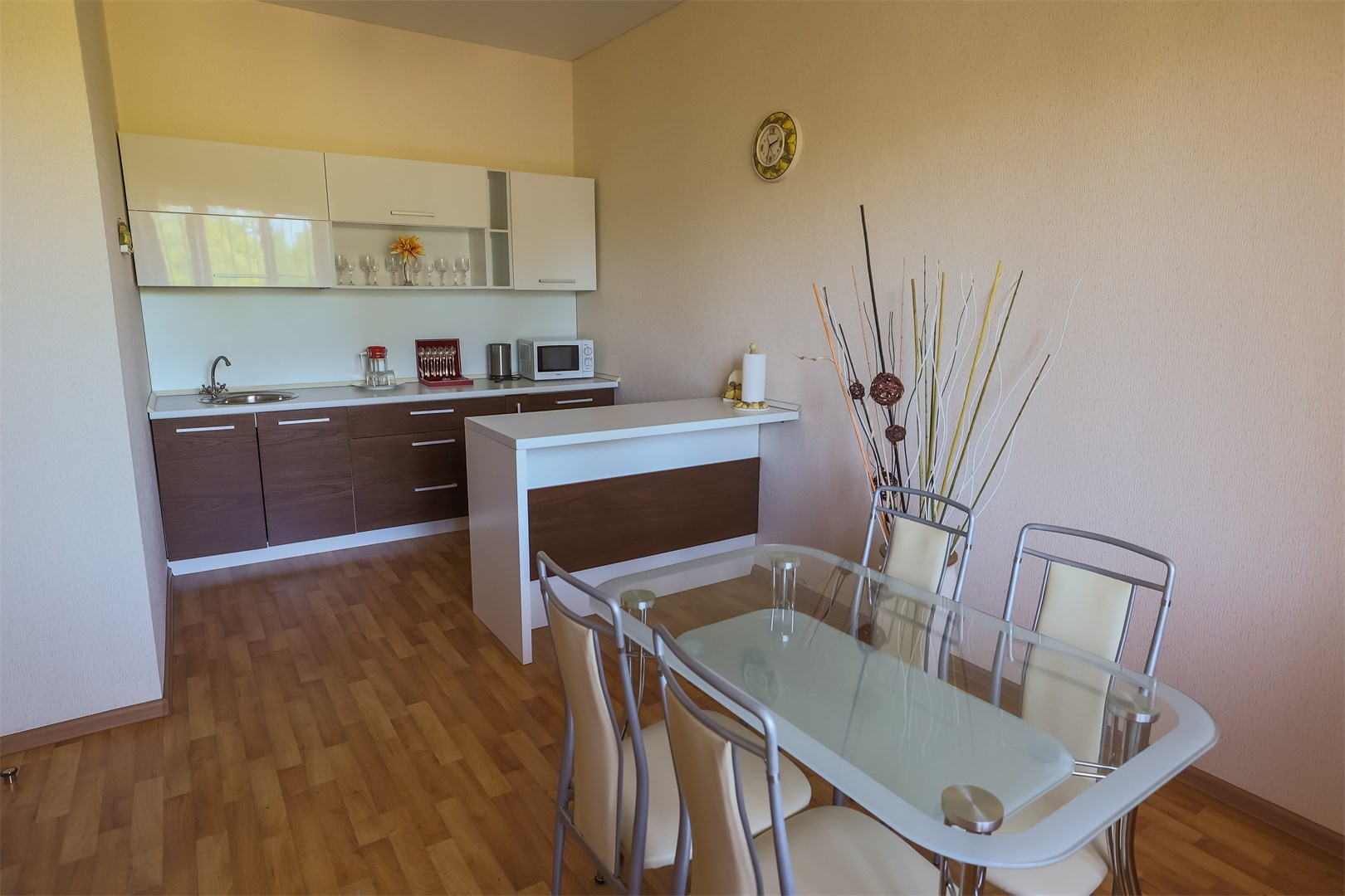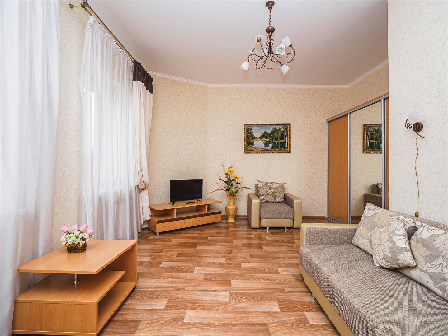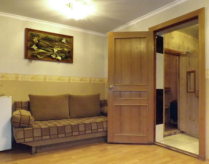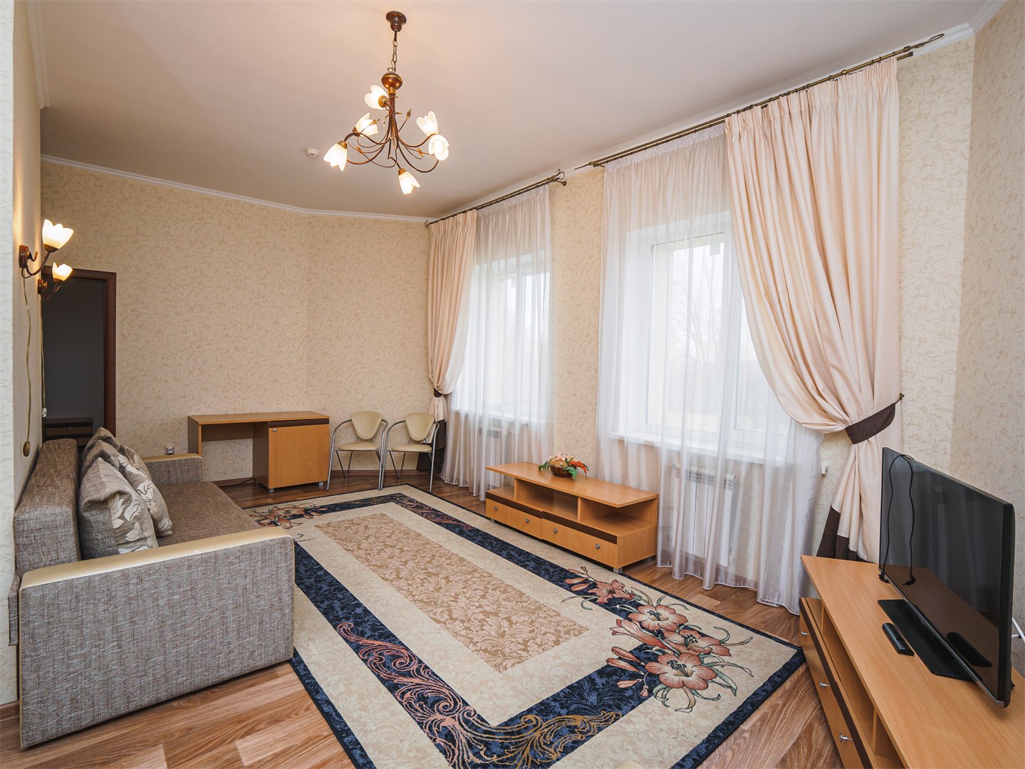 В номере: вешалка, диван, зеркало, комод, кровать двуспальная, прикроватные тумбочки, стол, стулья, шкаф, мини-холодильник, набор посуды, телевизор ЖК