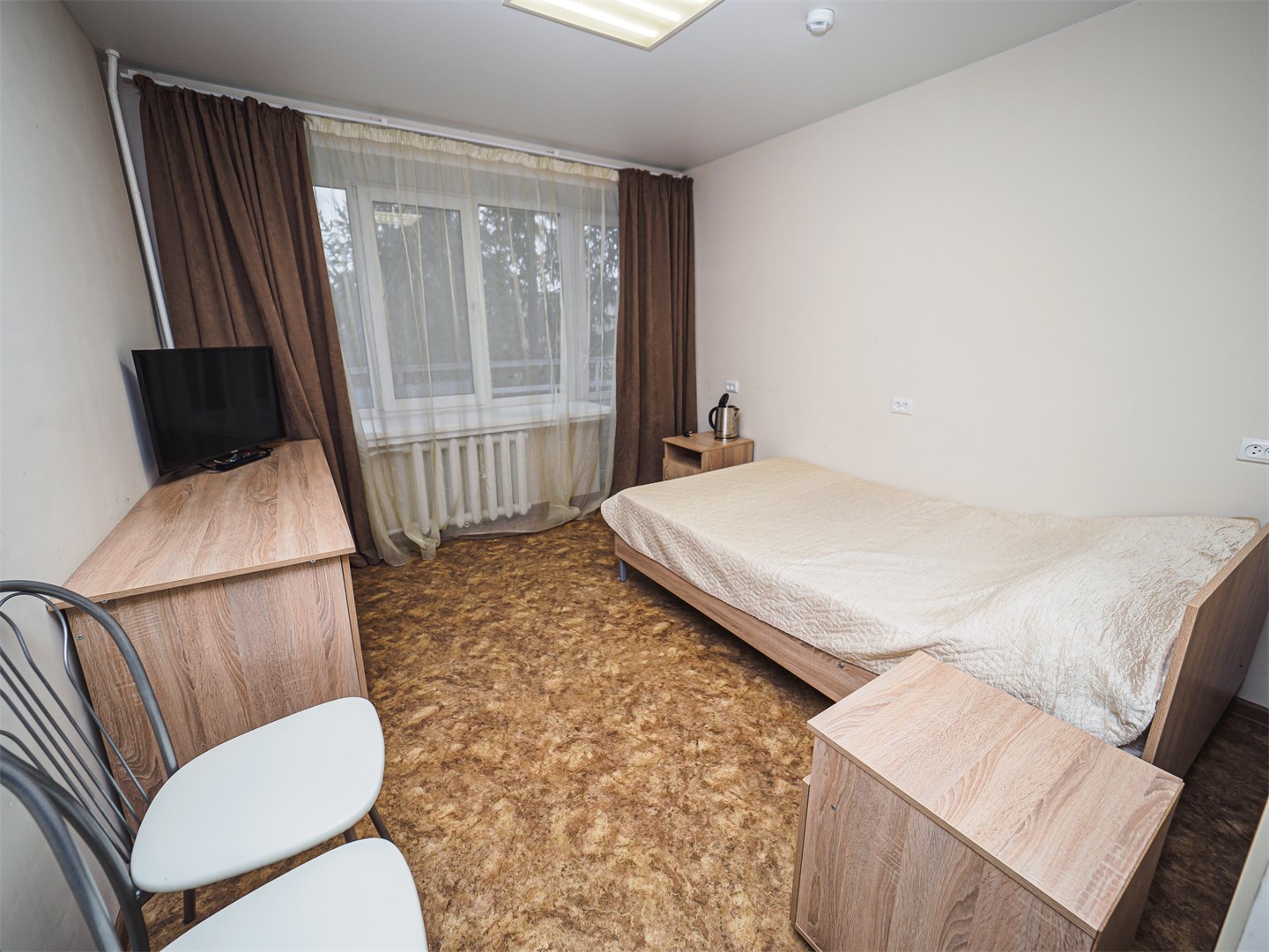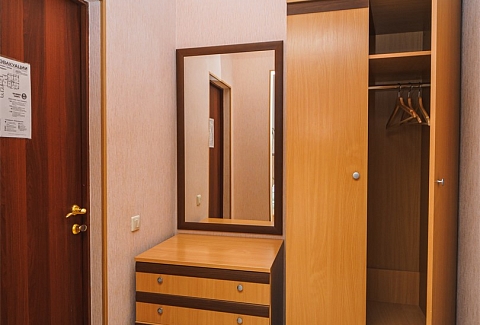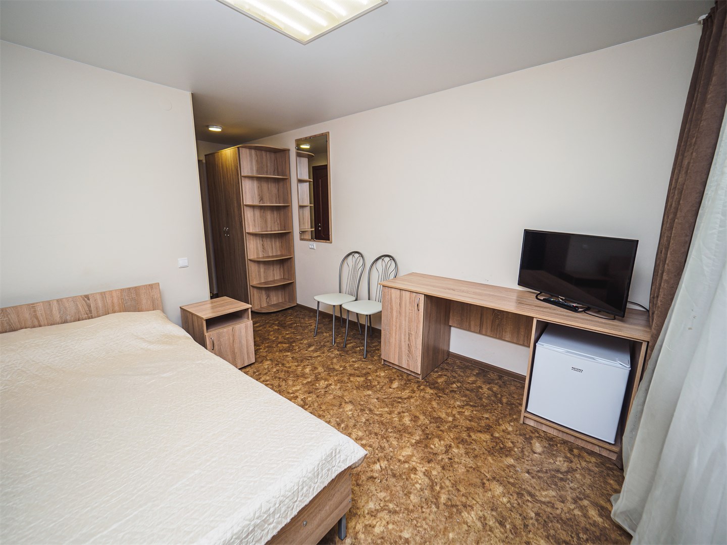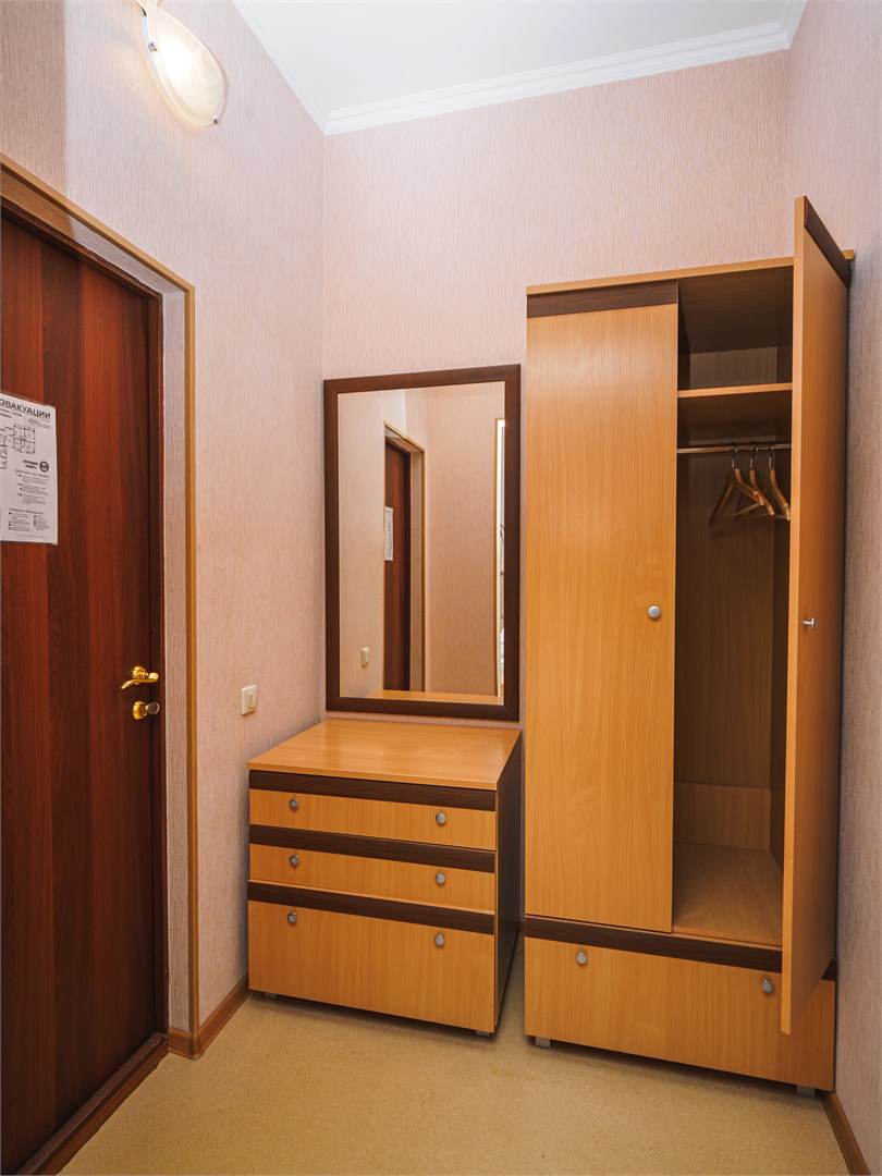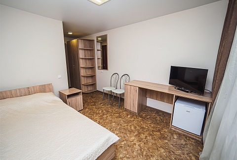В номере: вешалка, комод, кресло, кровать полутороспальная, прикроватные тумбочки, столик журнальный, тумба, шкаф, мини-холодильник, набор посуды, телевизор ЖК, чайный набор посуды, электрочайник