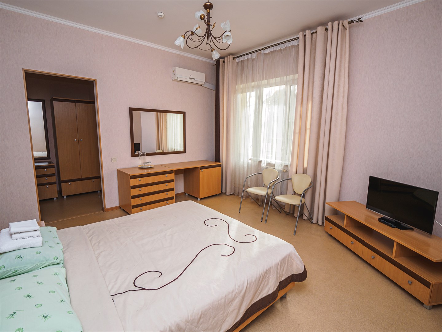 В номере: зеркало, комод, кресло, кровать двуспальная, прикроватные тумбочки, столик журнальный, стулья, тумба, кондиционер, мини-холодильник, телевизор ЖК