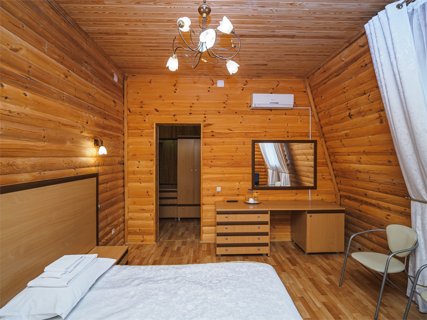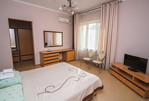 В номере: диван, зеркало, кровать двуспальная, прикроватные тумбочки, стол, стулья, шкаф, гладильная доска, кондиционер, микроволновая печь, мини-холодильник, набор посуды, телевизор ЖК, утюг, чайный набор посуды, электрочайник