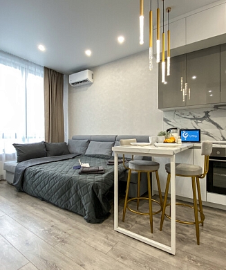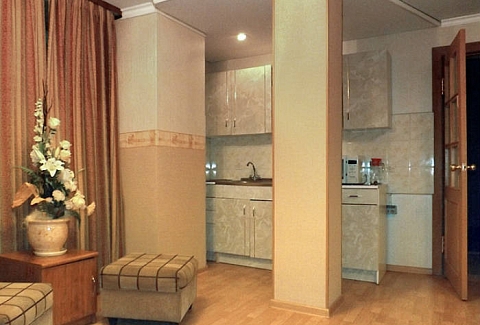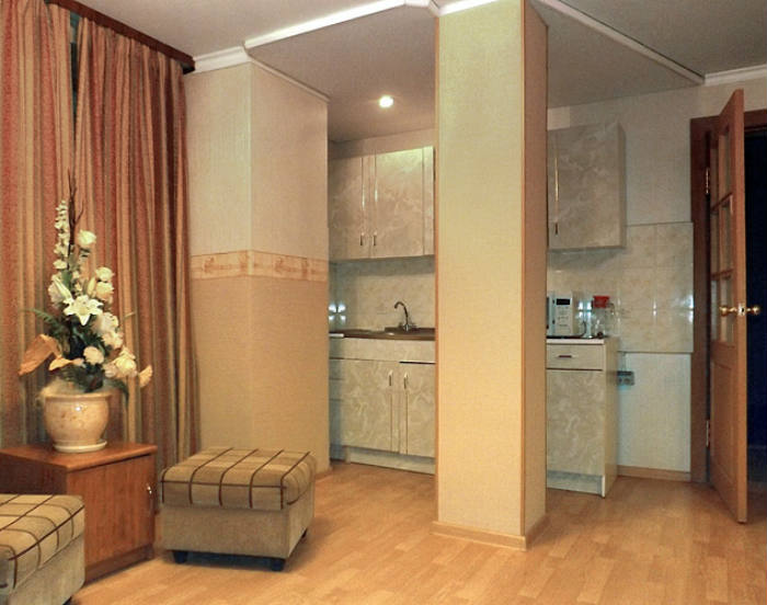 В номере: вешалка, диван, зеркало, комод, кровать двуспальная, прикроватные тумбочки, стол, столик журнальный, стулья, тумба, шкаф, кондиционер, микроволновая печь, мини-холодильник, набор посуды, телевизор ЖК, утюг, чайный набор посуды, электрочайник