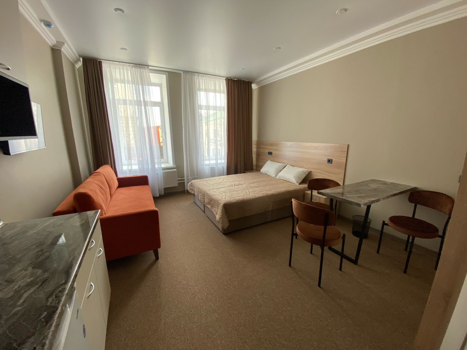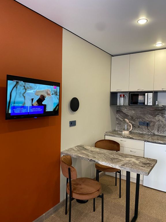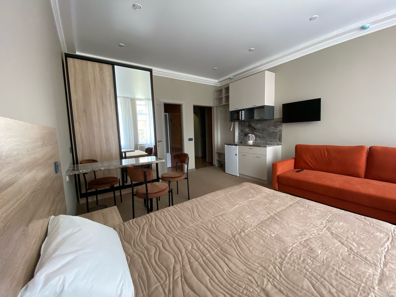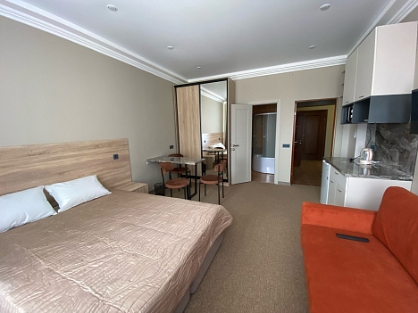 В номере: диван раскладной, кровать двуспальная, прикроватные тумбочки, стол, стулья, шкаф-купе, кондиционер, микроволновая печь, мини-холодильник, телевизор, чайник