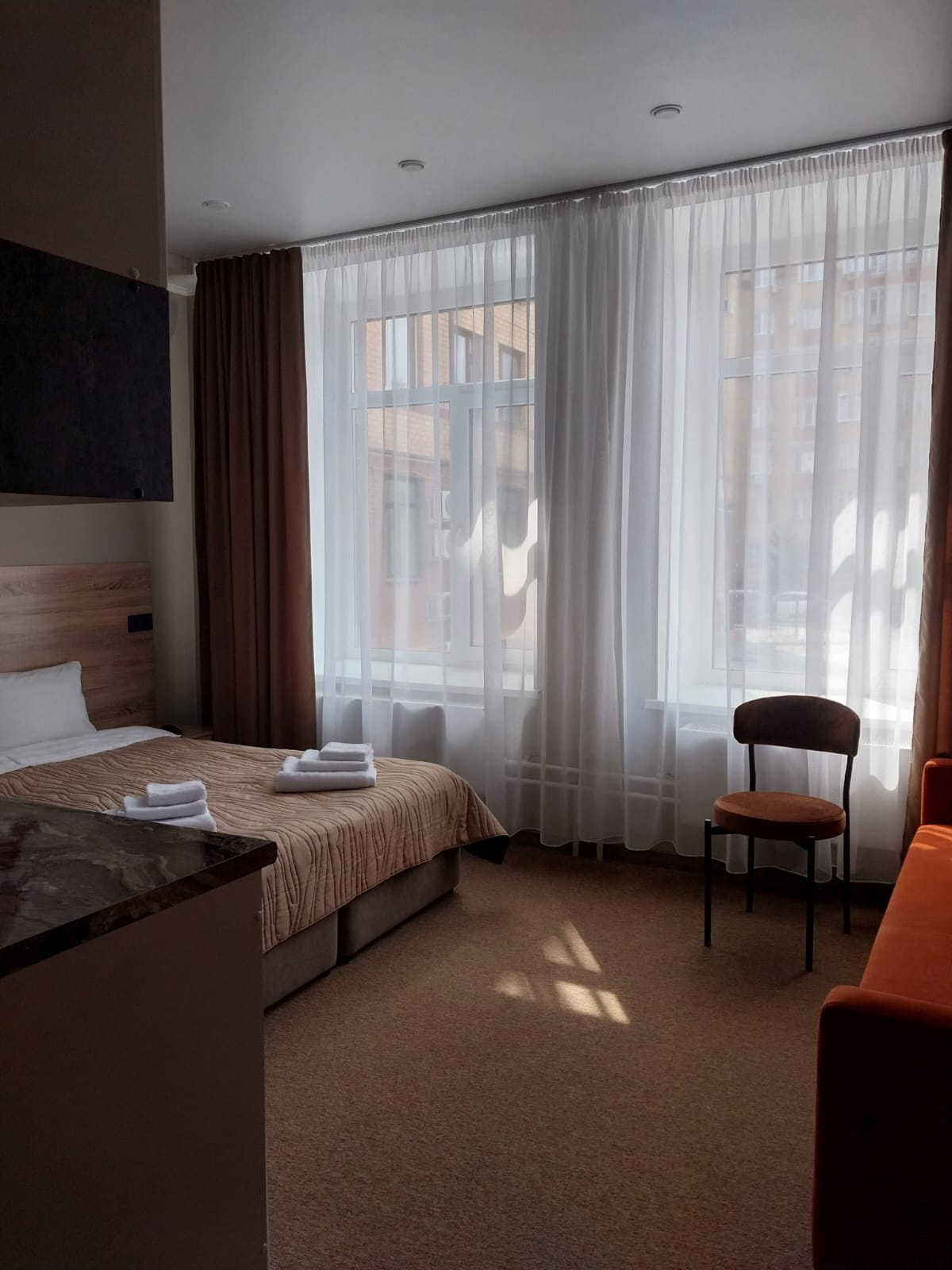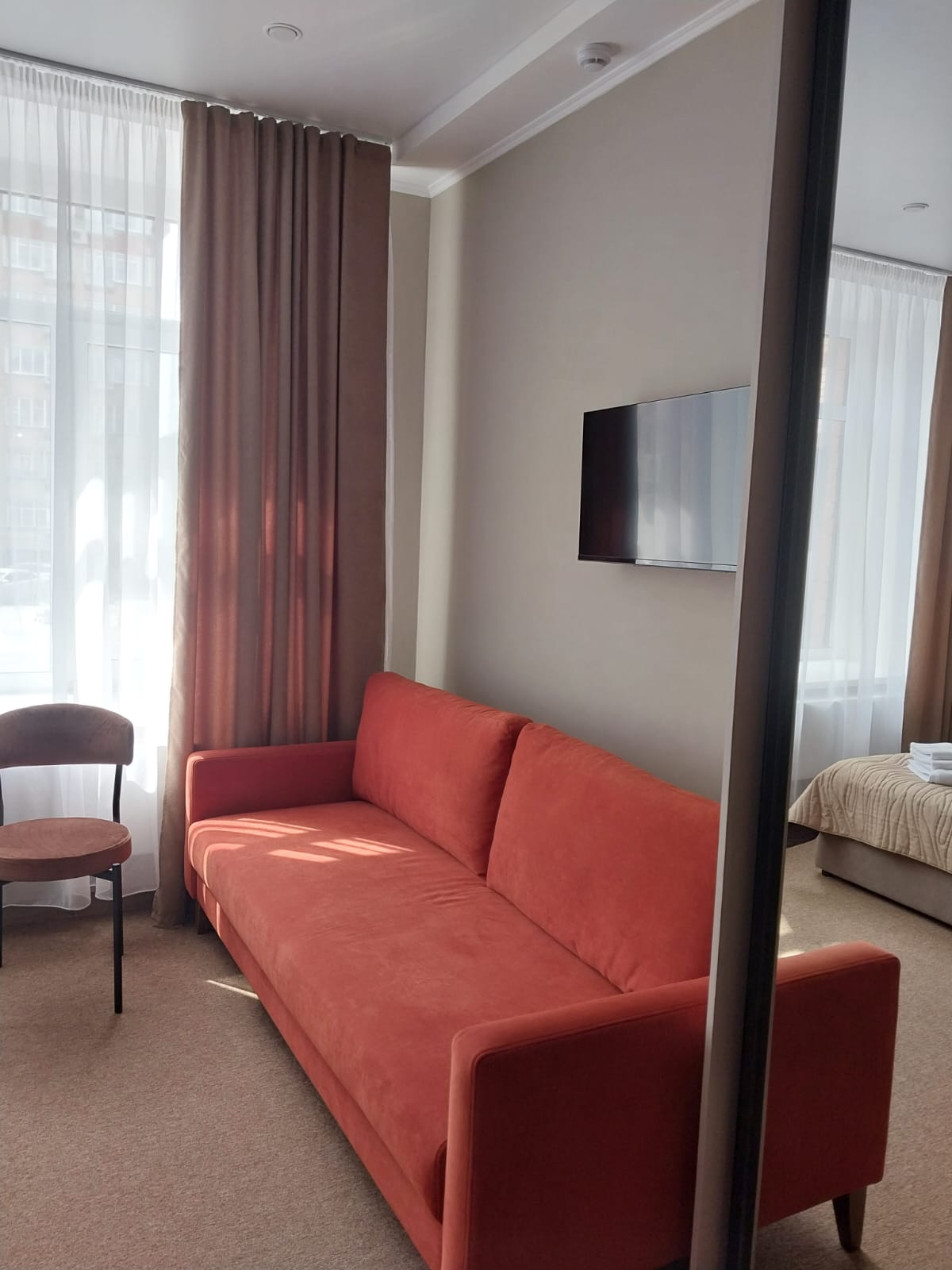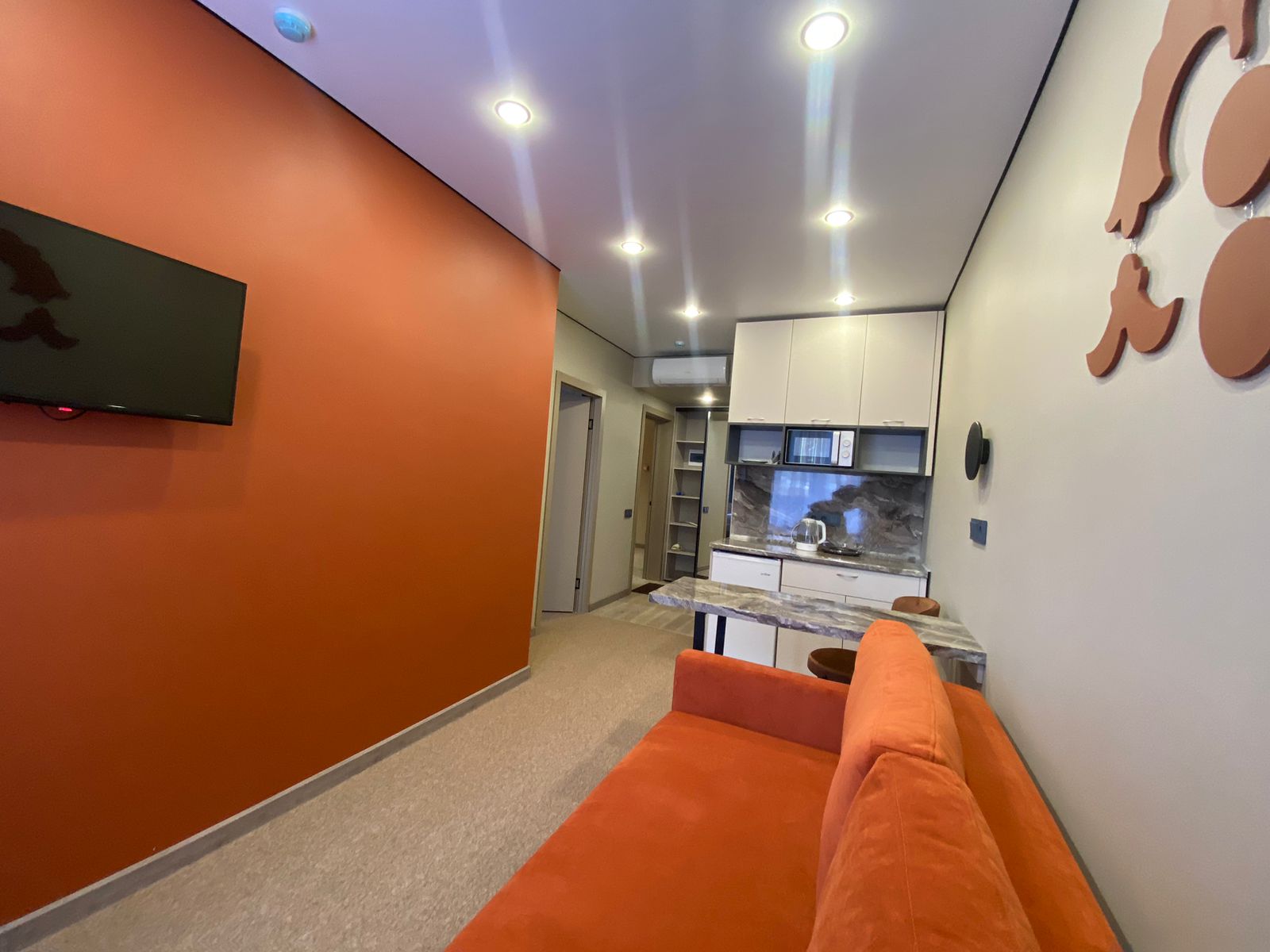В номере: диван раскладной, кровать двуспальная, прикроватные тумбочки, стол, стулья, шкаф-купе, кондиционер, микроволновая печь, мини-холодильник, телевизор, чайник