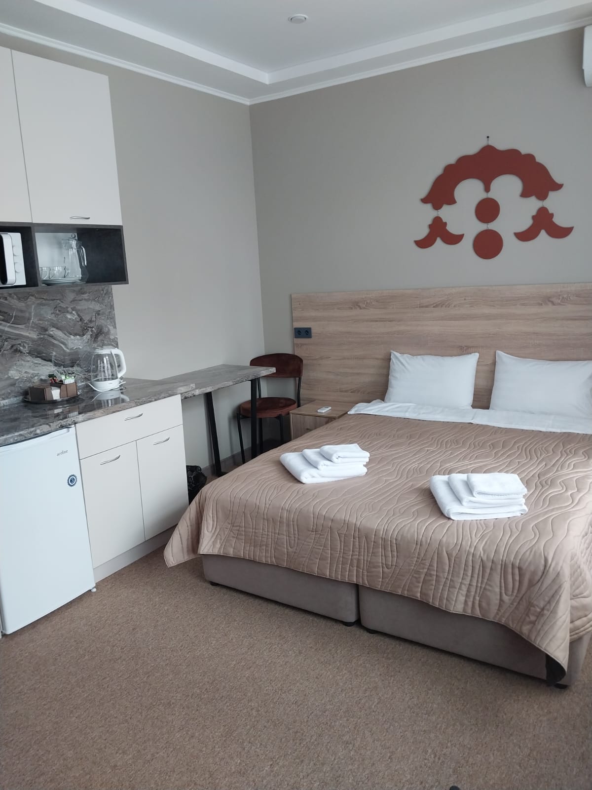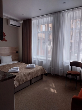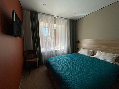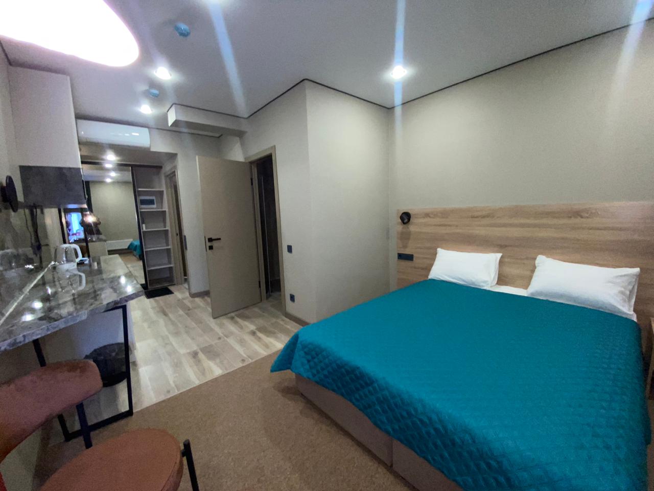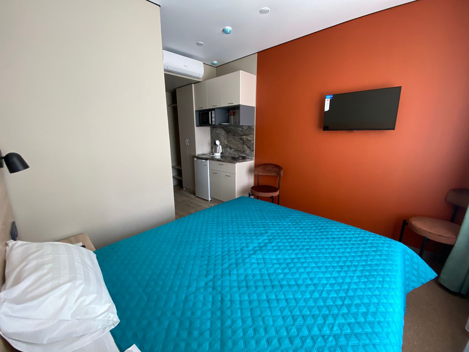 В номере: кровать двуспальная, прикроватные тумбочки, стол, стулья, шкаф, кондиционер, микроволновая печь, мини-холодильник, телевизор, чайник