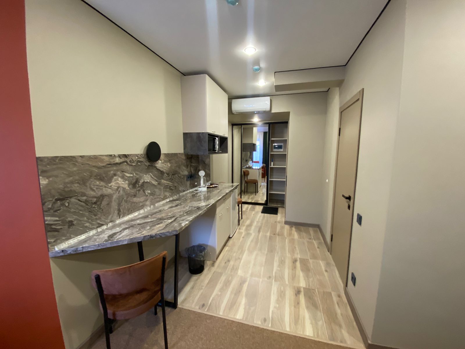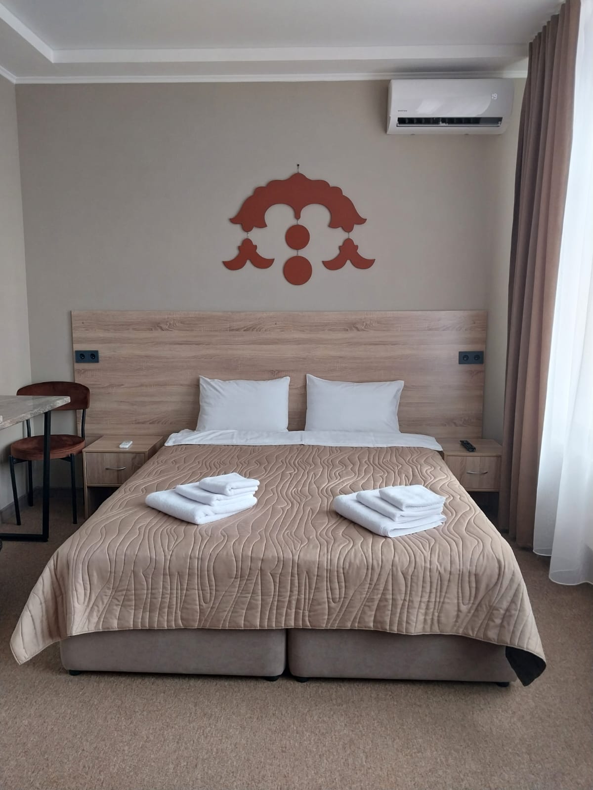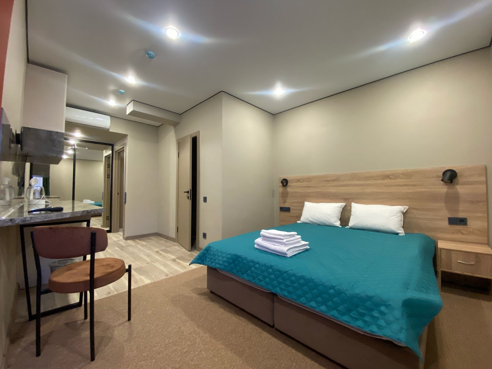 В номере: кровать двуспальная, прикроватные тумбочки, стол, стулья, шкаф, кондиционер, микроволновая печь, мини-холодильник, телевизор, чайник