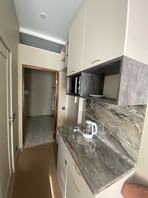 В номере: кресло-кровать, кровать двуспальная, прикроватные тумбочки, стол, стулья, шкаф-купе, кондиционер, микроволновая печь, мини-холодильник, набор посуды, телевизор, чайник