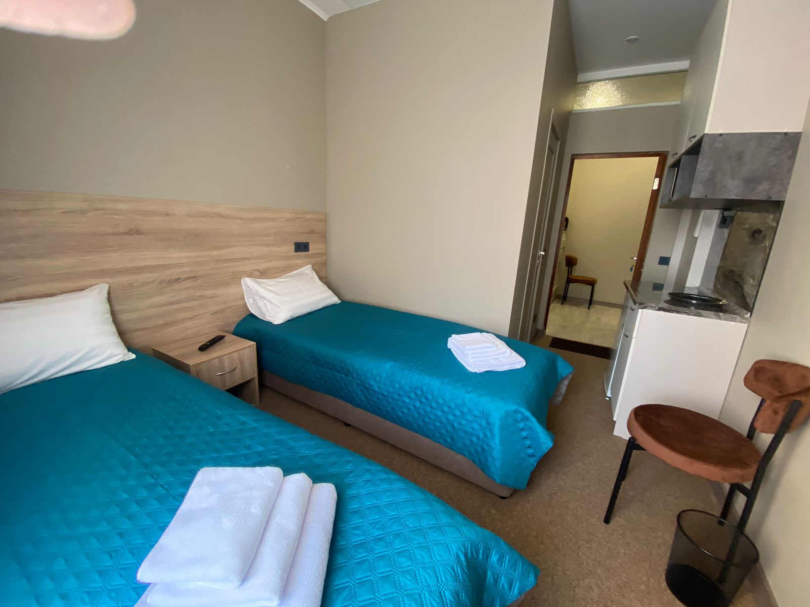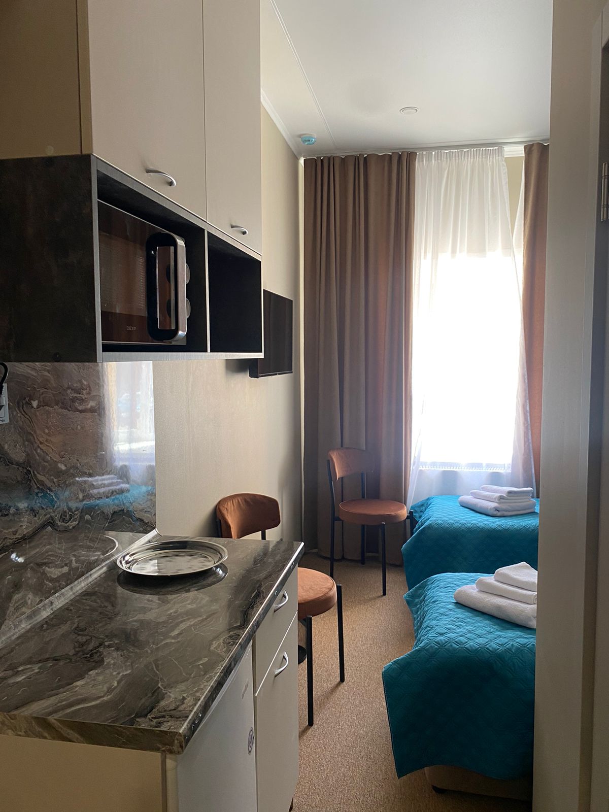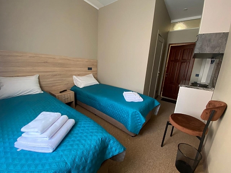В номере: кровати односпальные, прикроватная тумбочка, стол, стулья, шкаф, кондиционер, микроволновая печь, мини-холодильник, набор посуды, телевизор, чайник