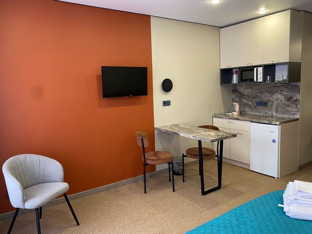 В номере: диван раскладной, кровать двуспальная, прикроватные тумбочки, стол, стулья, шкаф, кондиционер, микроволновая печь, мини-холодильник, телевизор, чайник