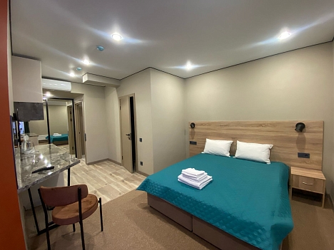 В номере: диван раскладной, кровать двуспальная, прикроватные тумбочки, стол, стулья, шкаф, кондиционер, микроволновая печь, мини-холодильник, набор посуды, телевизор, чайник