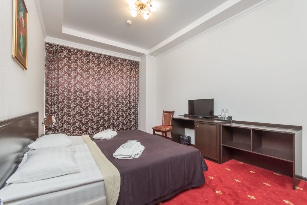 В номере: вешалка, зеркало, кровать двуспальная, прикроватные тумбочки, стул, шкаф-купе, мини-холодильник, сейф, сплит-система, телевизор, телефон