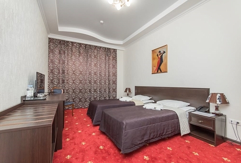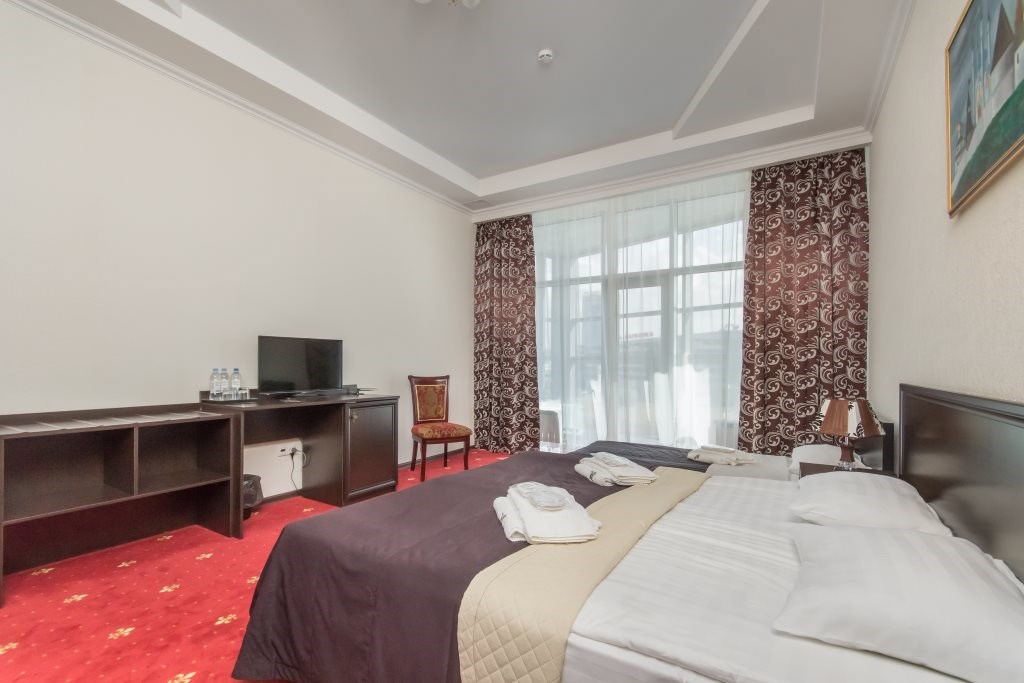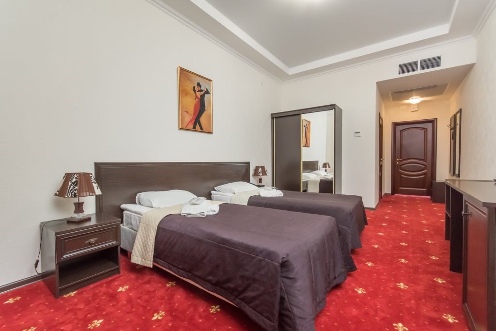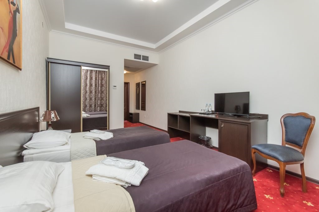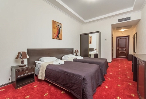 В номере: вешалка, зеркало, кровати односпальные /одна двуспальная кровать, прикроватные тумбочки, стул, шкаф-купе, мини-холодильник, сплит-система, телевизор, телефон