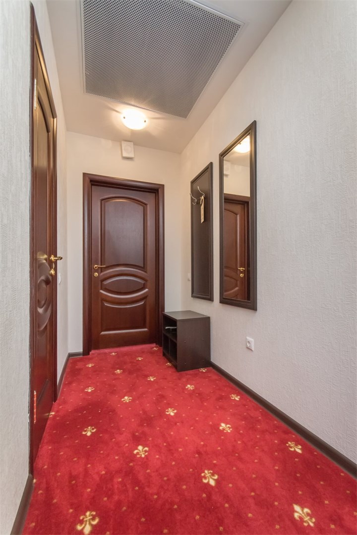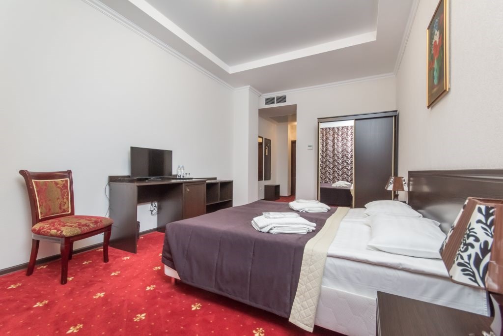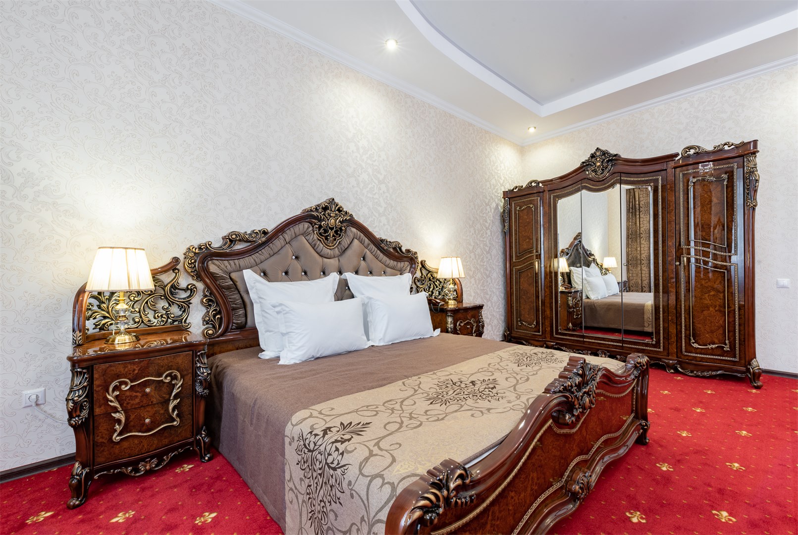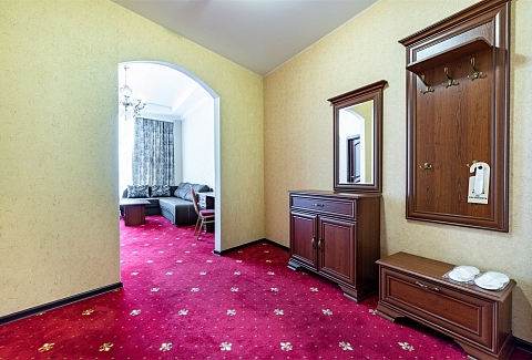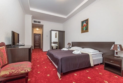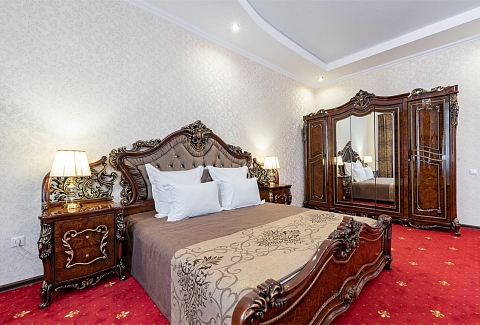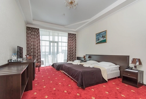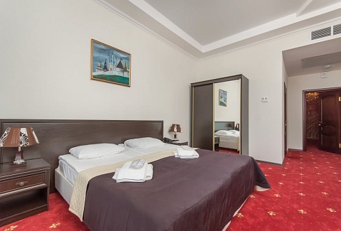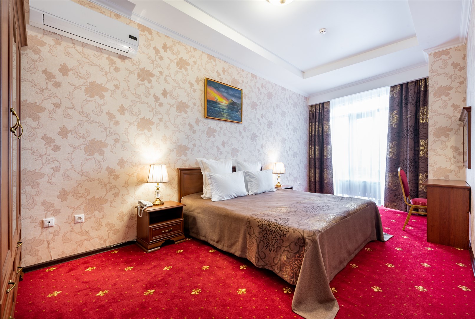 В номере: вешалка, зеркало, кровать двуспальная, набор мягкой мебели, прикроватные тумбочки, столик журнальный, стул, шкаф, мини-холодильник, сейф, сплит-система, телевизор, телефон