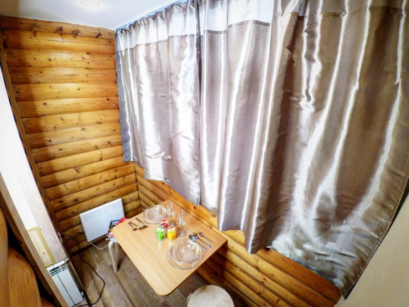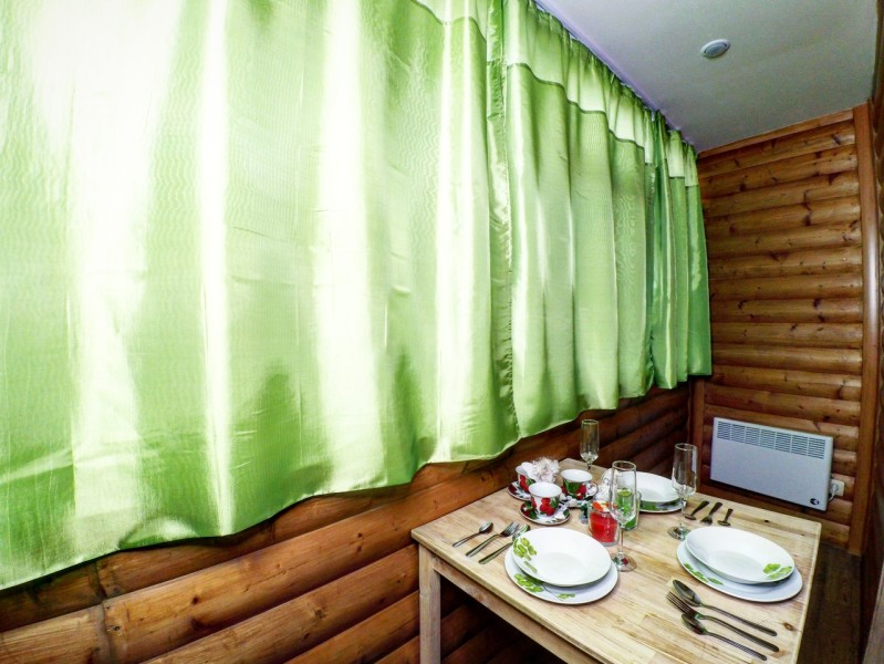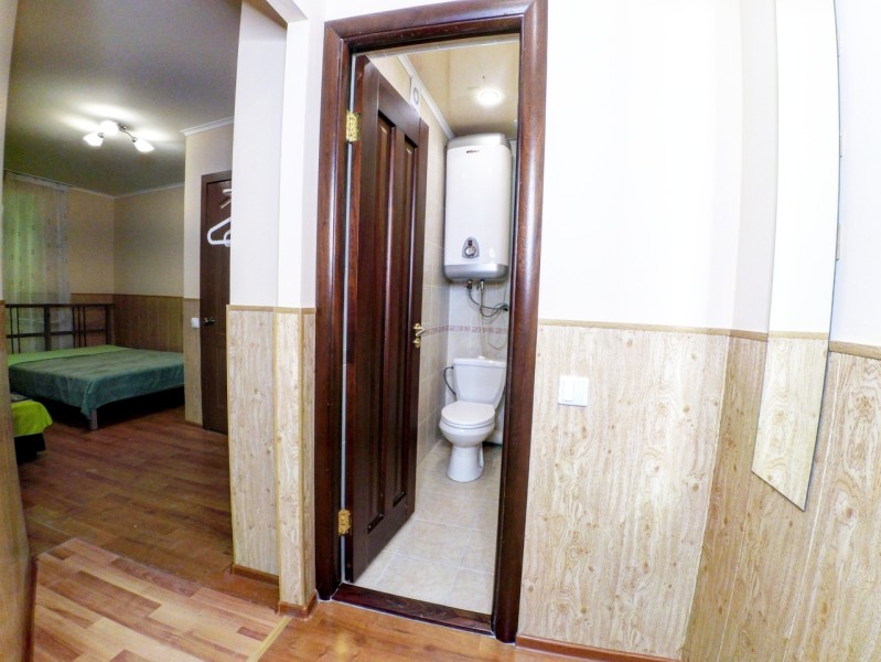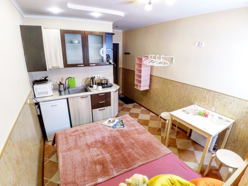 В номере: вешалка, зеркало, кровать двуспальная, стол, стулья, шкаф, вентилятор, гладильная доска, микроволновая печь, мини-холодильник, набор посуды, плита электрическая, стиральная машина, телевизор ЖК, утюг, чайный набор посуды, электрочайник