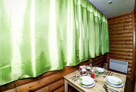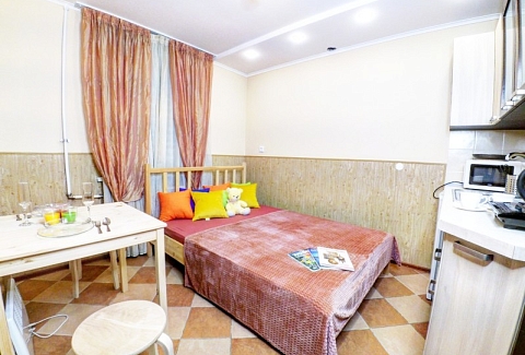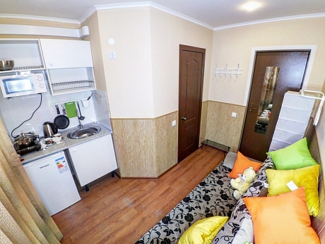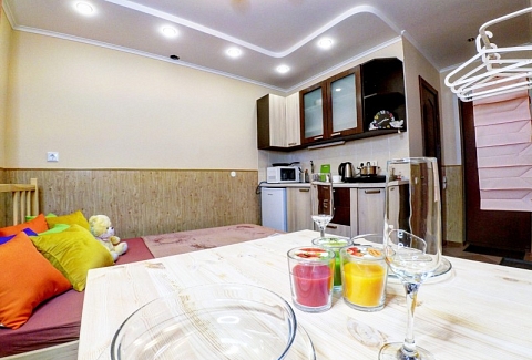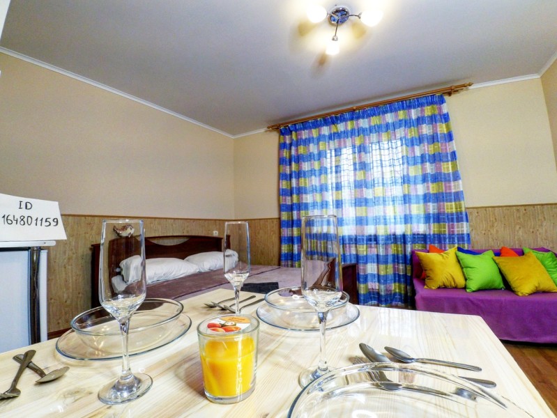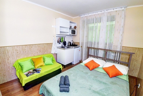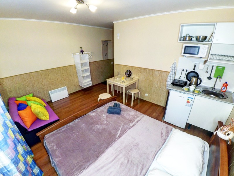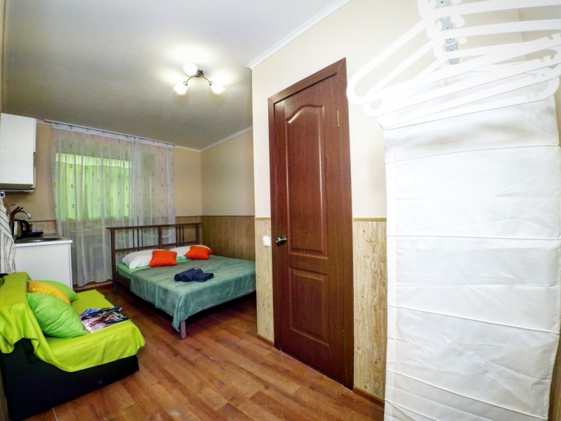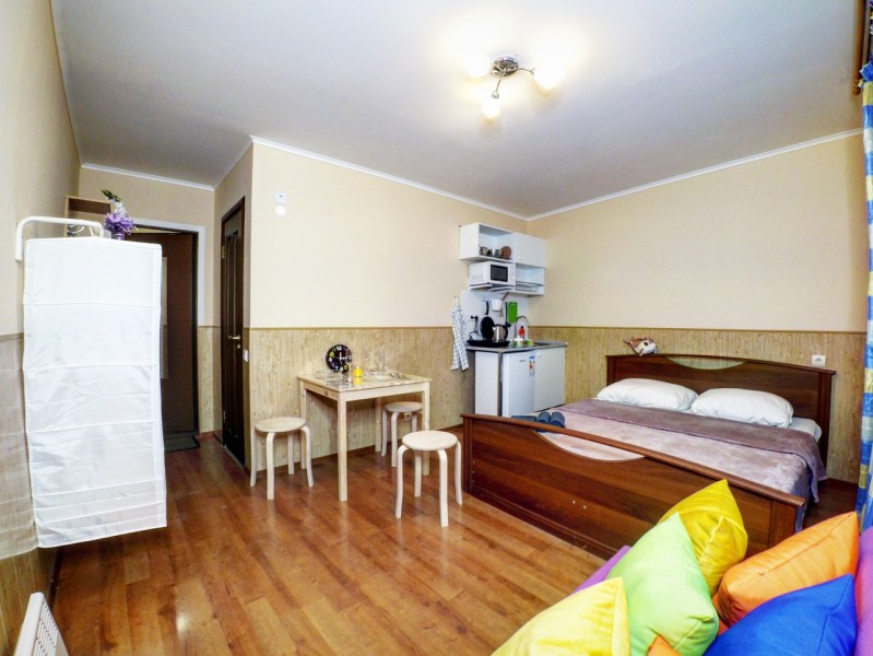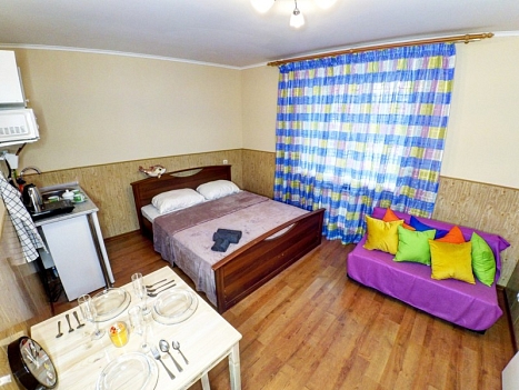 В номере: вешалка, диван, зеркало, кровать двуспальная, стол, стулья, вентилятор, гладильная доска, микроволновая печь, мини-холодильник, набор посуды, плита электрическая, стиральная машина, телевизор ЖК, утюг, чайный набор посуды, электрочайник