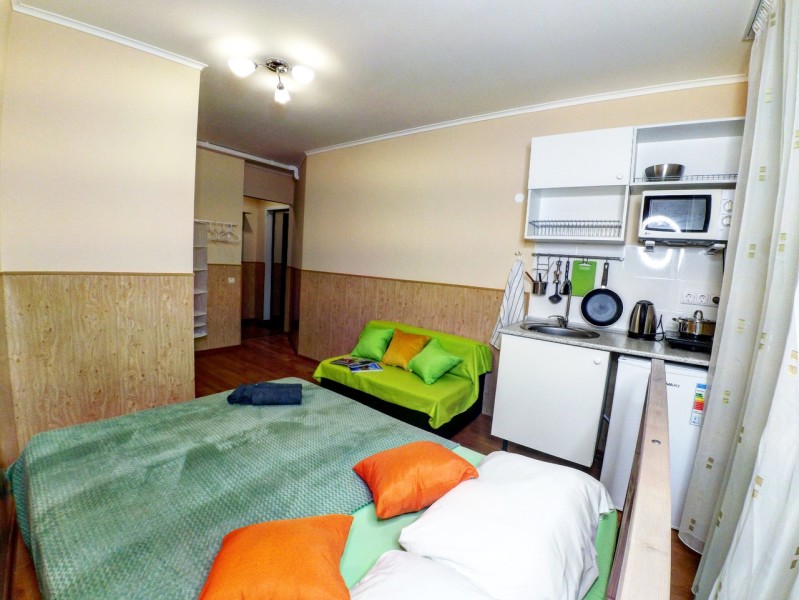 В номере: вешалка, диван раскладной, зеркало, кровать двуспальная, стол, стулья, вентилятор, гладильная доска, микроволновая печь, мини-холодильник, набор посуды, плита электрическая, стиральная машина, телевизор ЖК, утюг, электрочайник