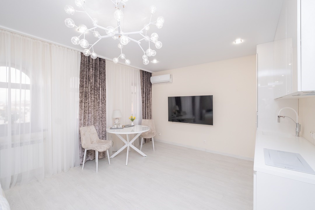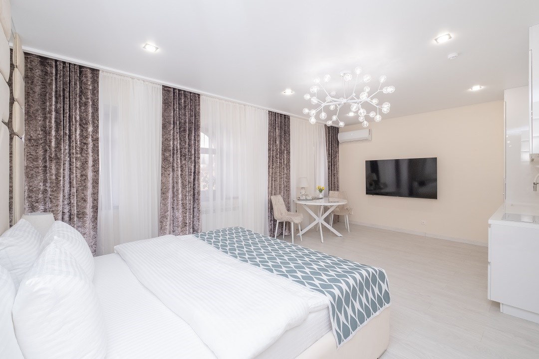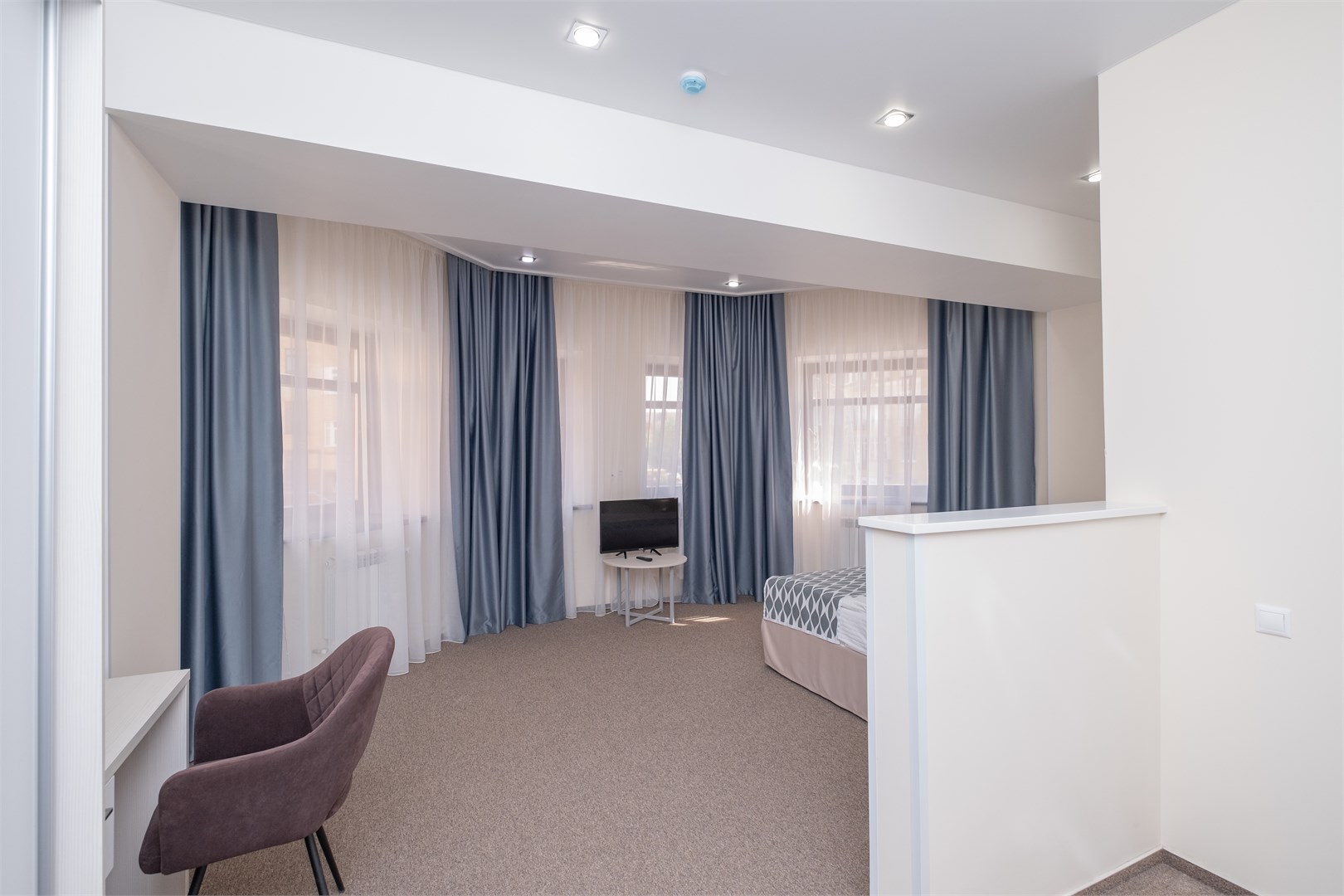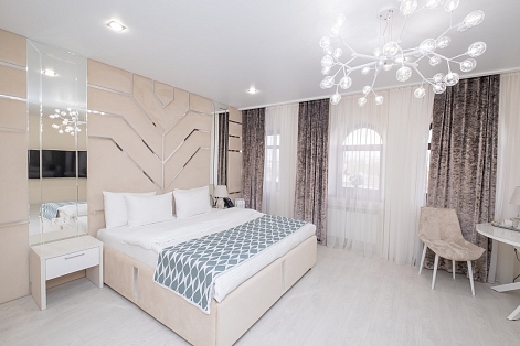 В номере: диван, кровать двуспальная, прикроватные тумбочки, стол, стулья, шкаф, кондиционер, сейф, телевизор, телефон, чайная станция