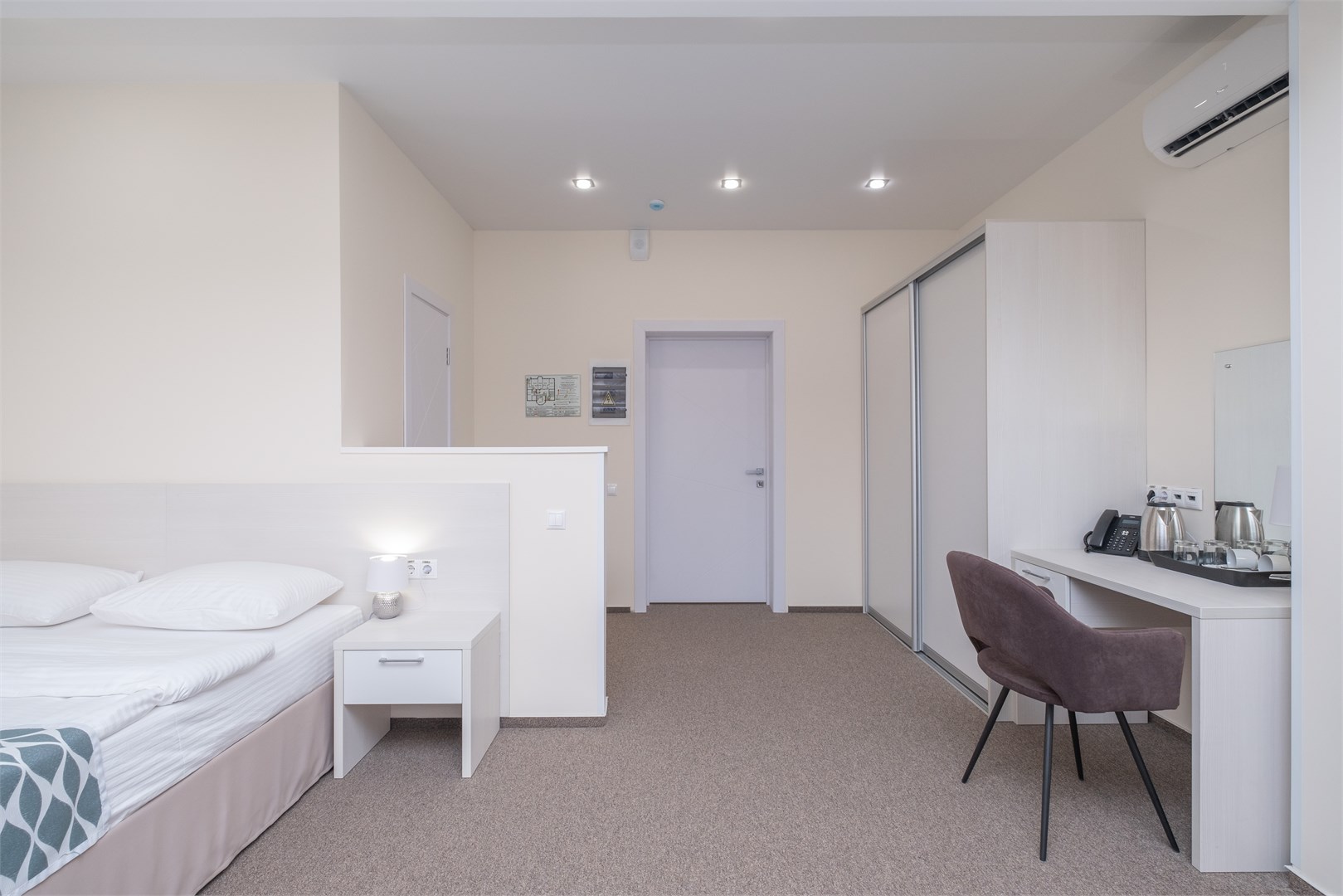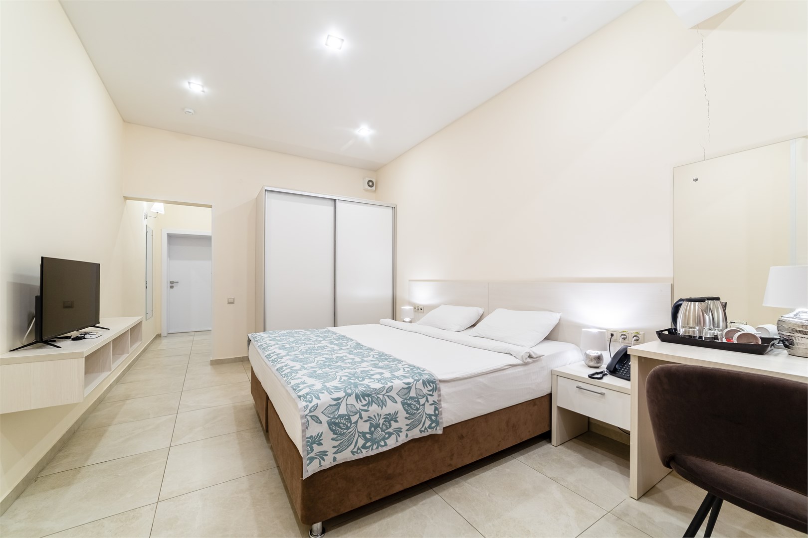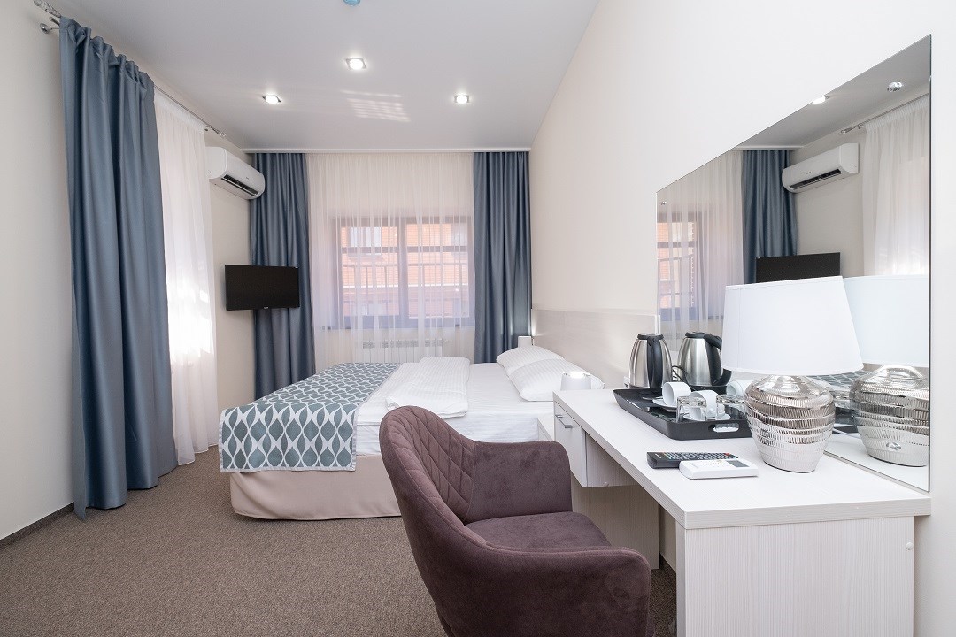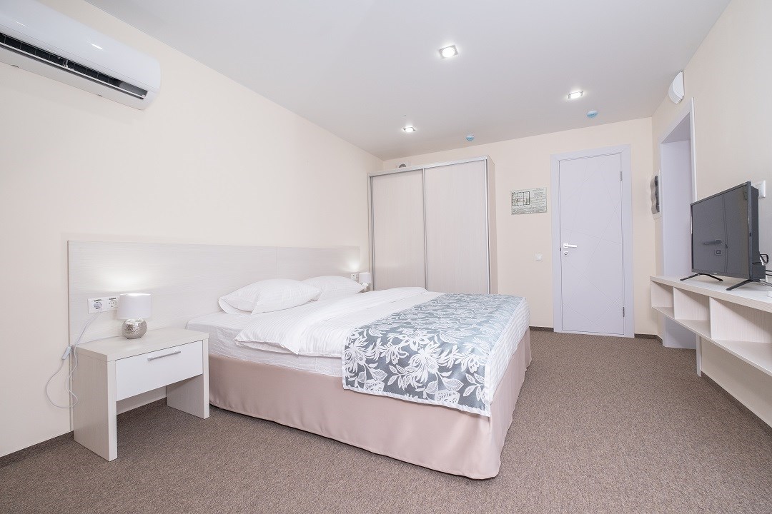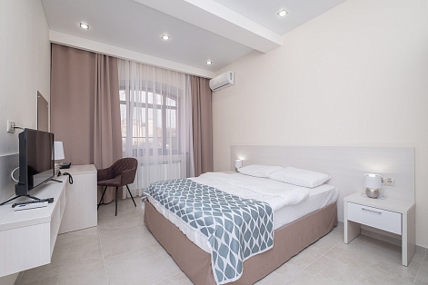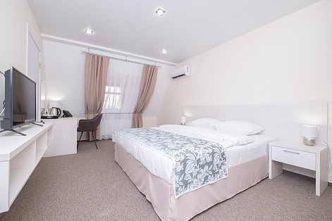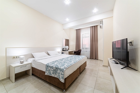 В номере: кровать двуспальная, прикроватные тумбочки, стол, стулья, шкаф, кондиционер, мини-холодильник, сейф, телевизор, телефон, чайная станция