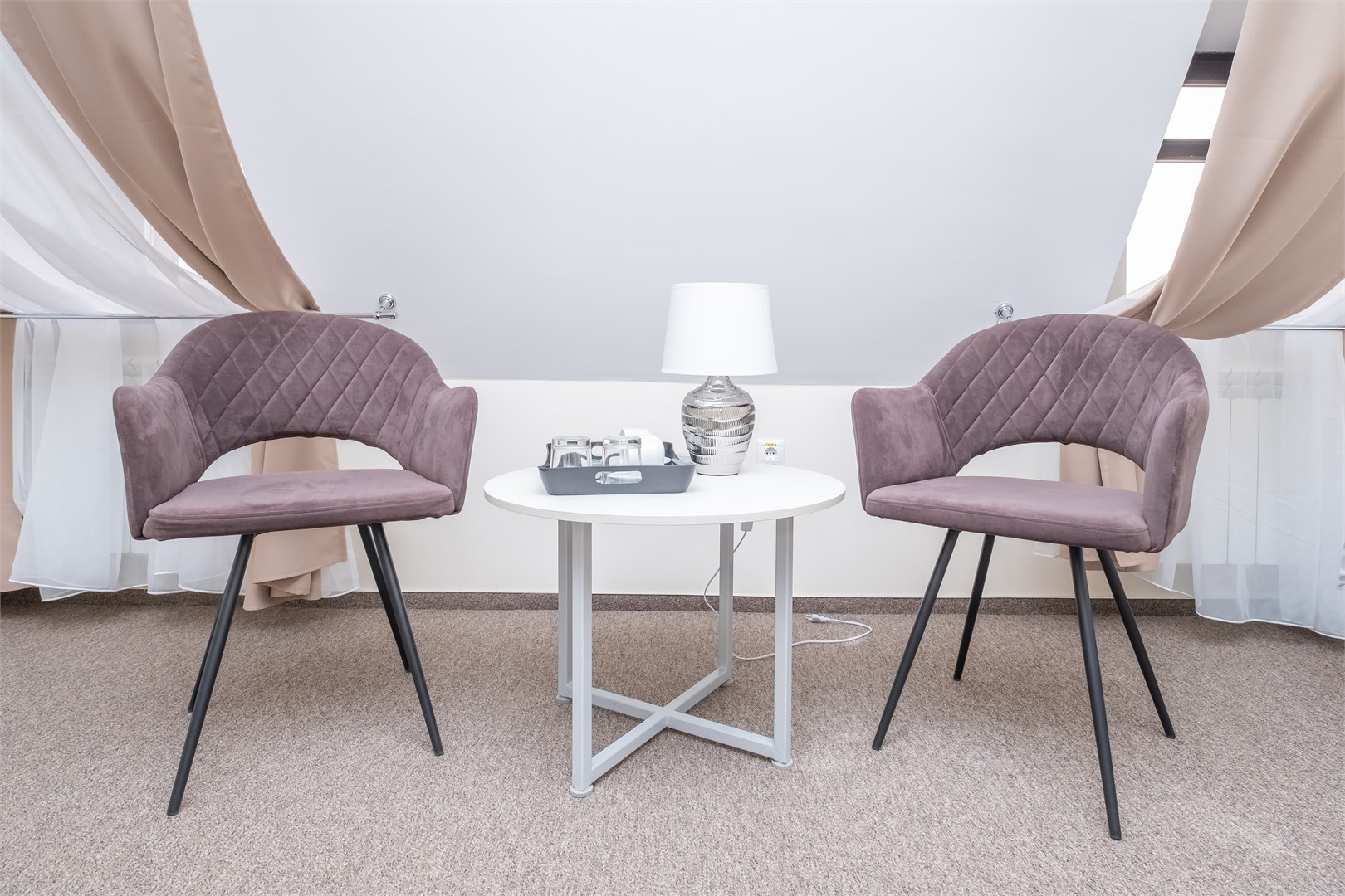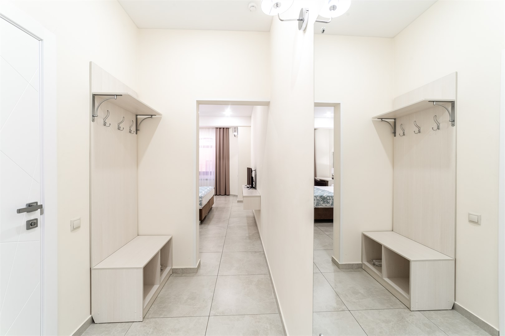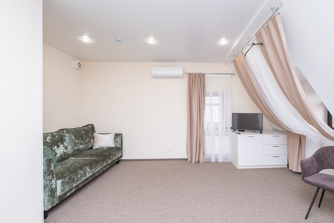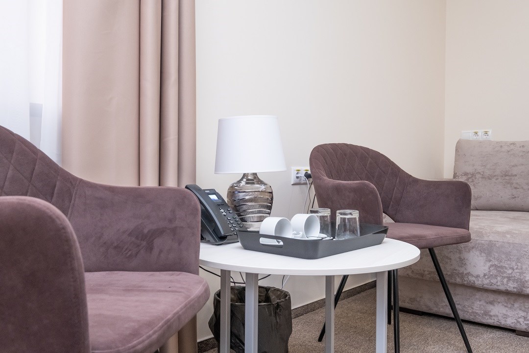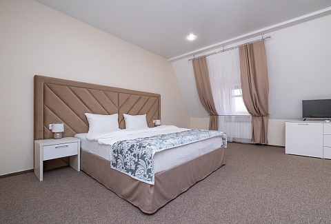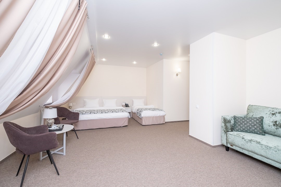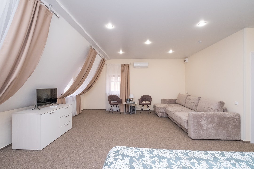 В номере: диван, кровать двуспальная, кровать односпальная, прикроватные тумбочки, стол, стулья, шкаф, кондиционер, мини-холодильник, телевизор, телефон, чайная станция