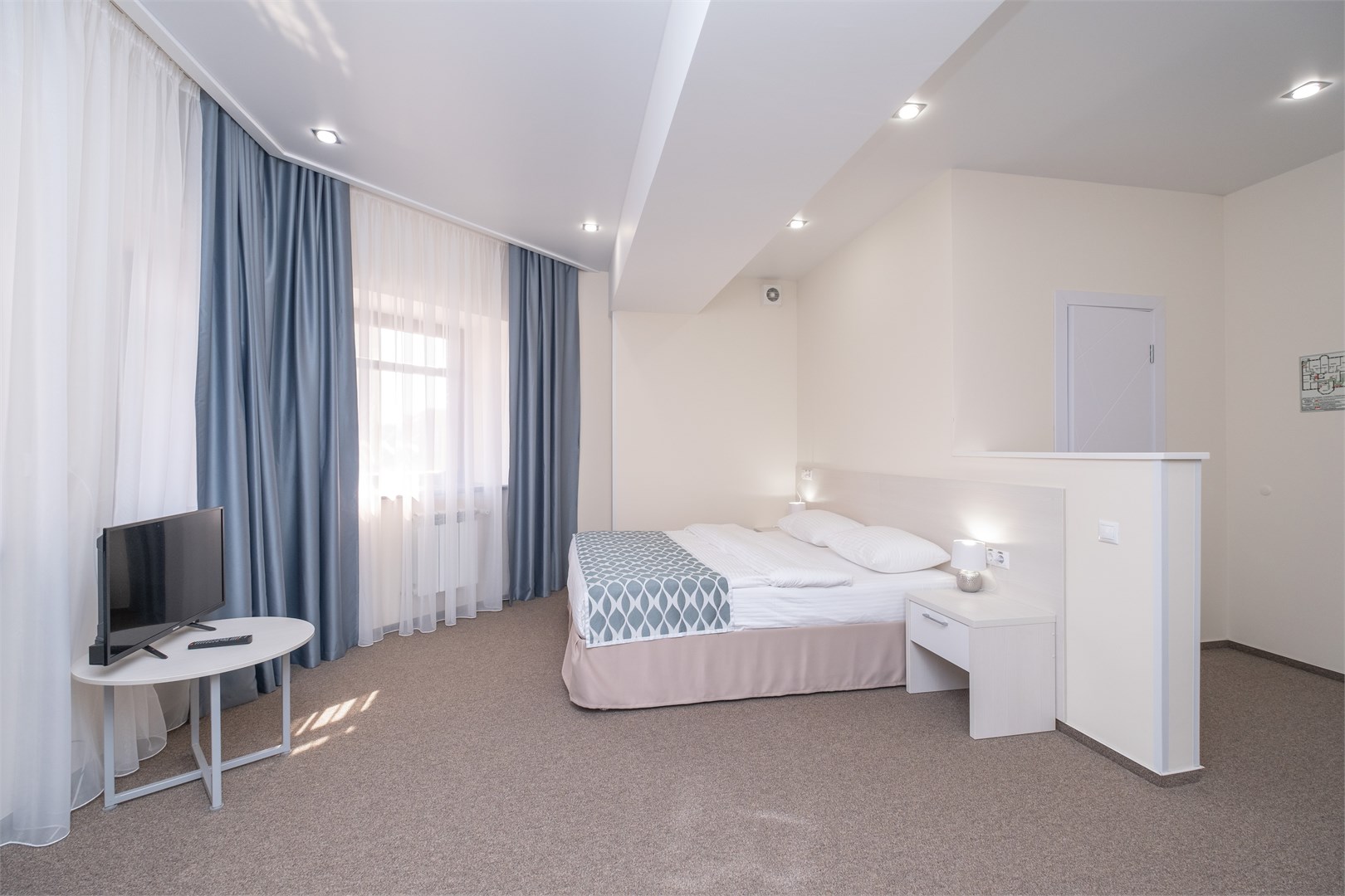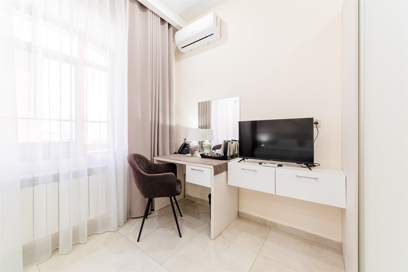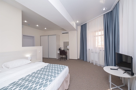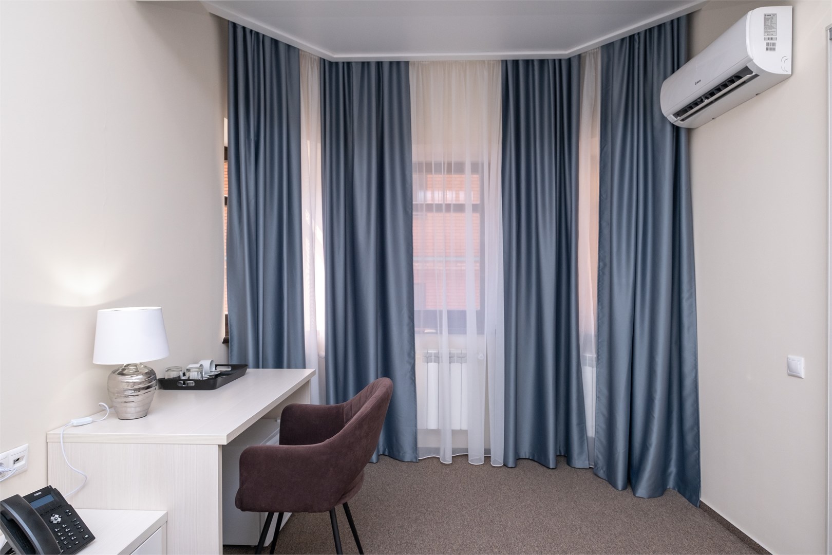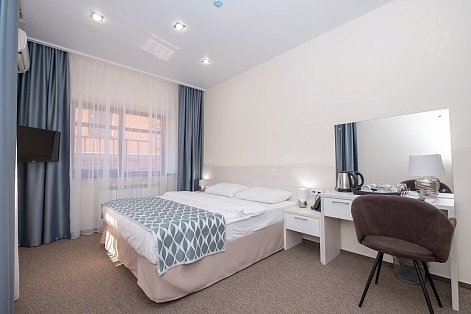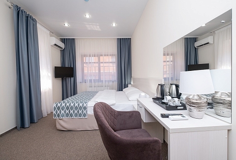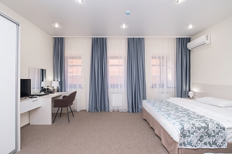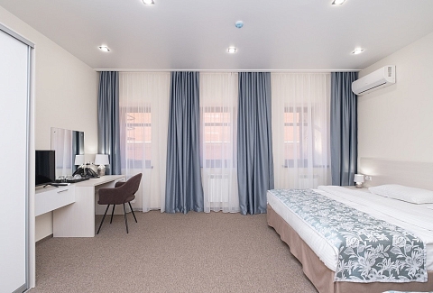 В номере: кровать двуспальная, прикроватные тумбочки, стол, стулья, шкаф, кондиционер, сейф, телевизор, телефон, чайная станция