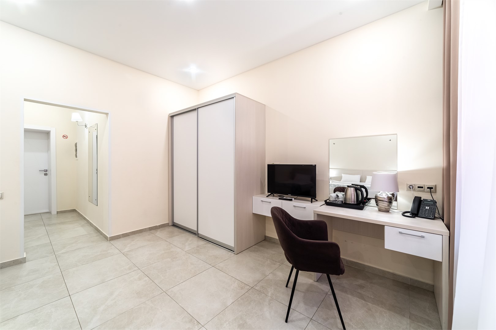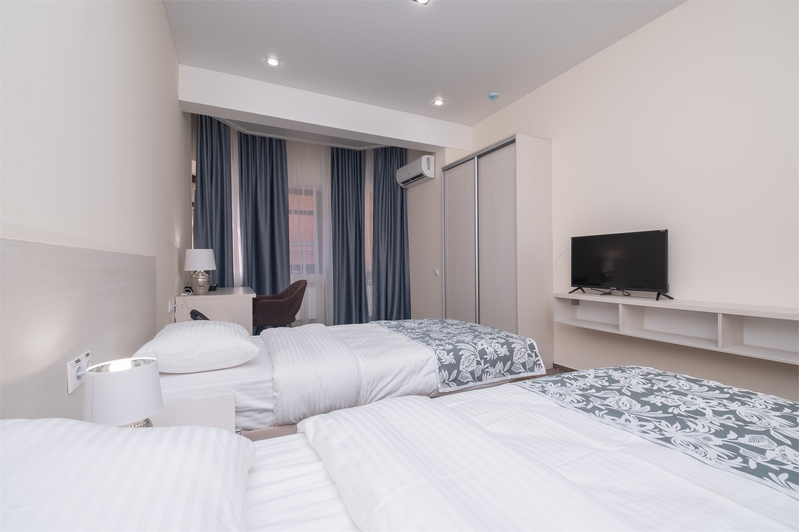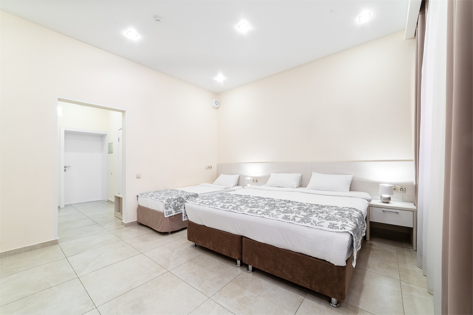 В номере: кровать двуспальная, кровать односпальная, прикроватные тумбочки, стол, стулья, шкаф, кондиционер, мини-холодильник, сейф, телевизор, телефон, чайная станция