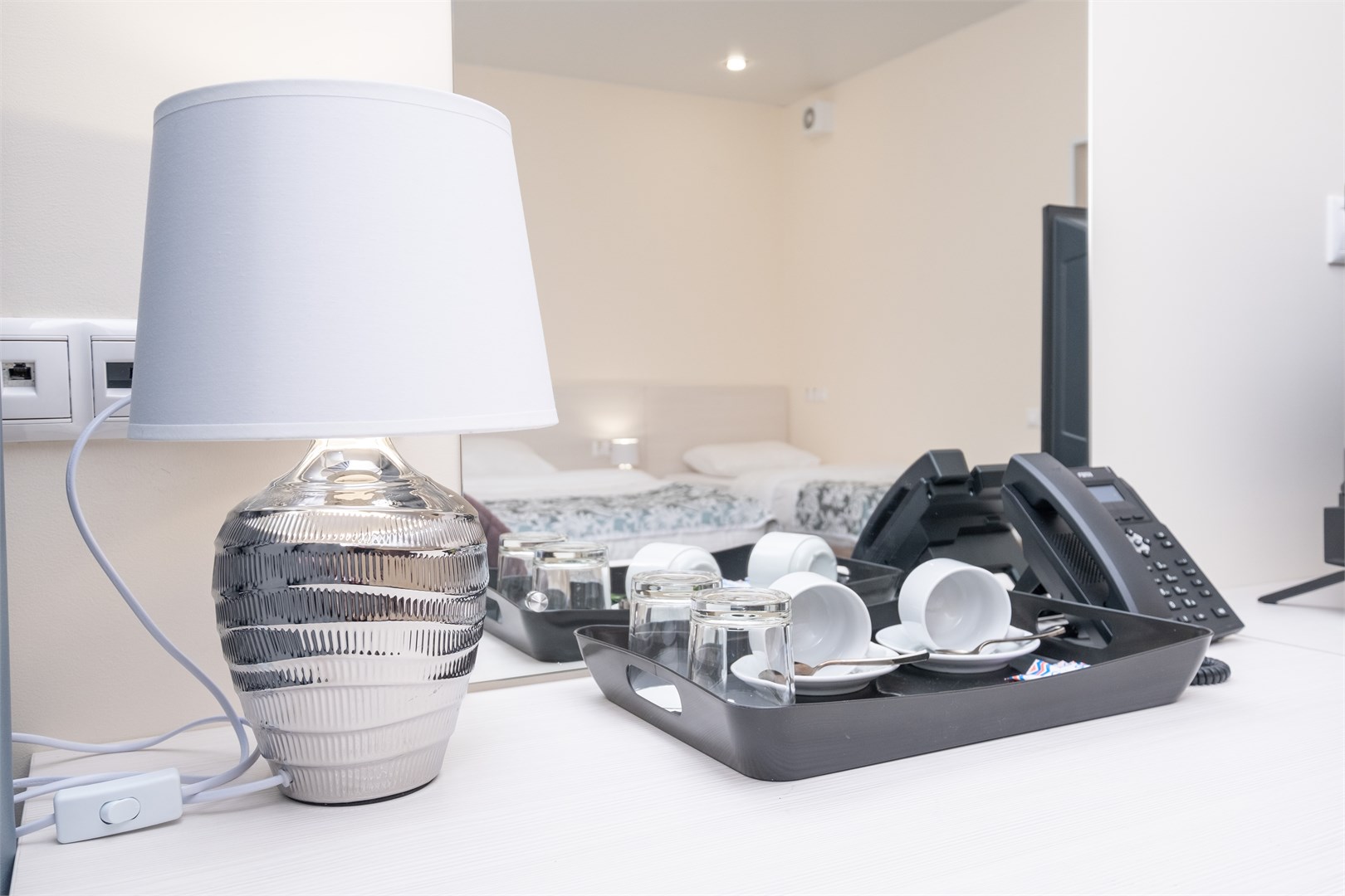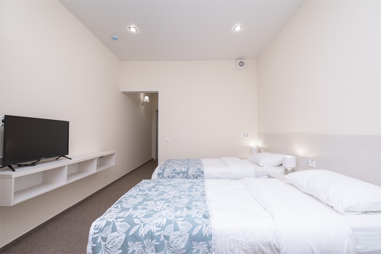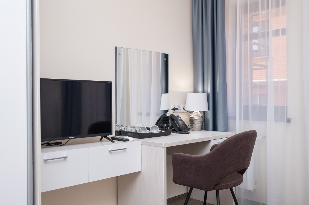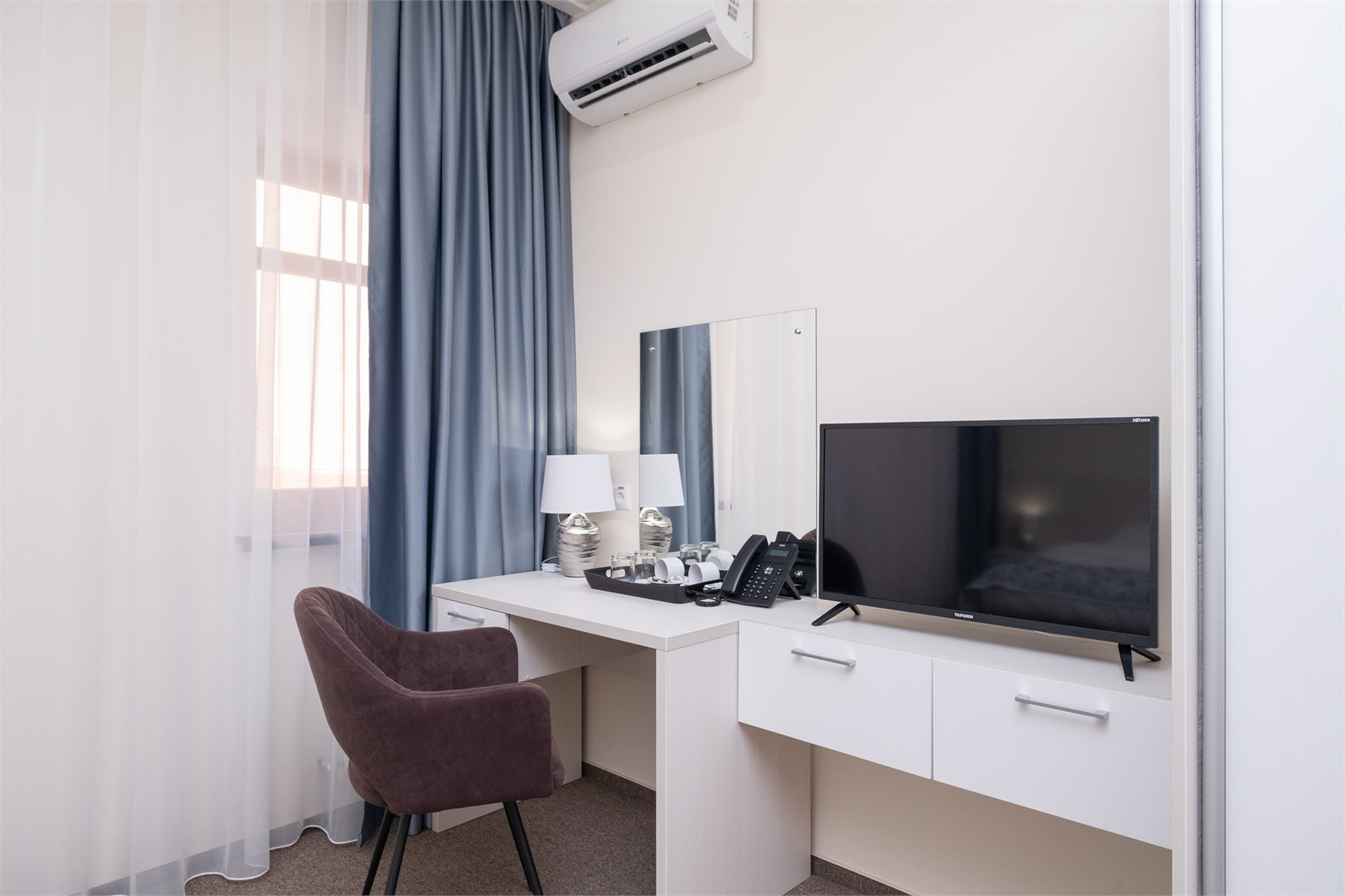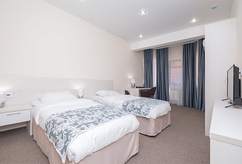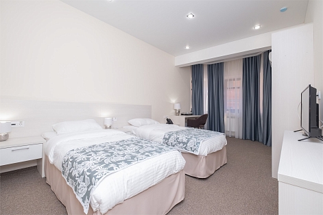 В номере: кровати односпальные, прикроватные тумбочки, стол, стулья, шкаф, кондиционер, мини-холодильник, сейф, телевизор, телефон, чайный набор посуды