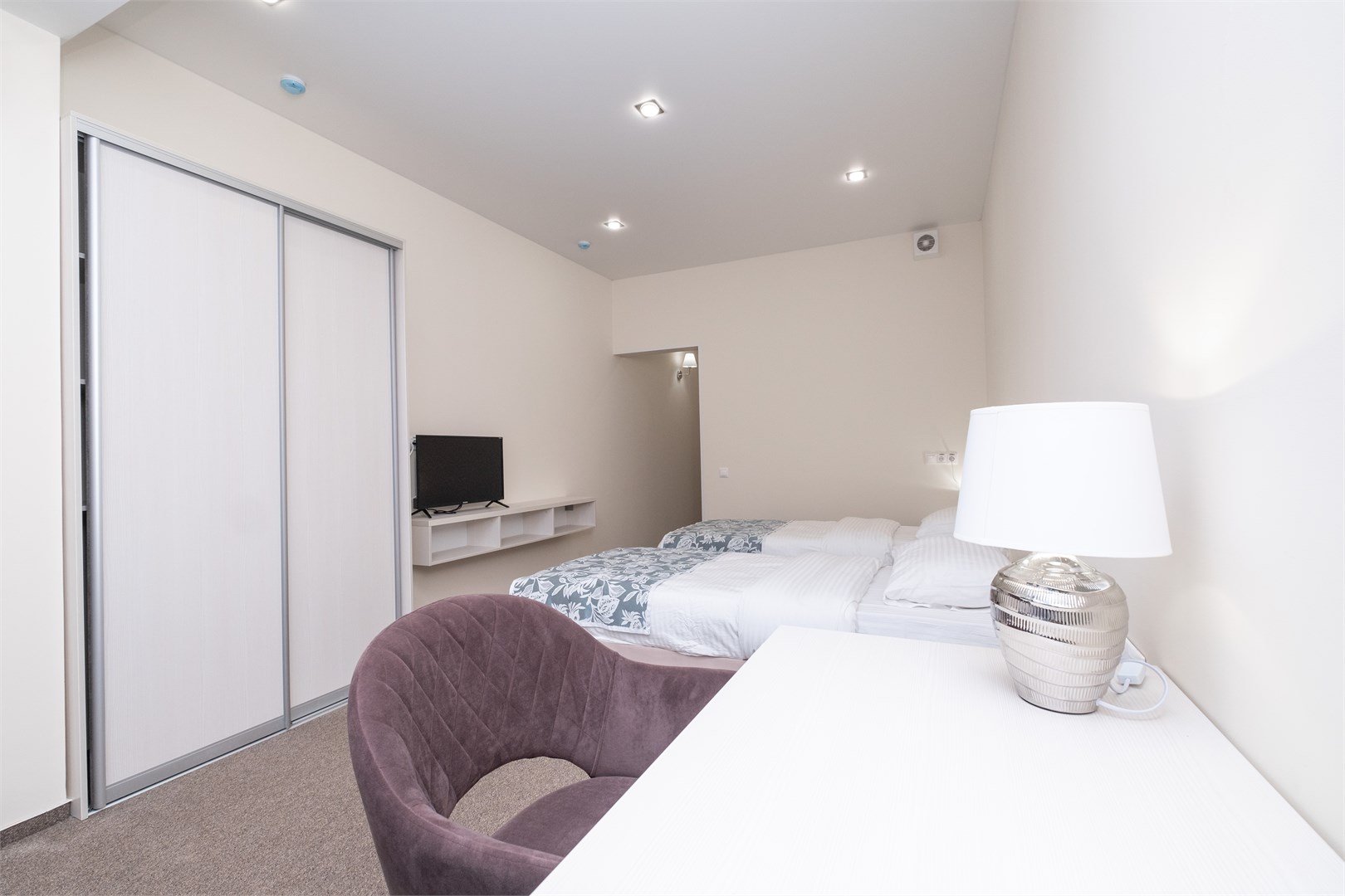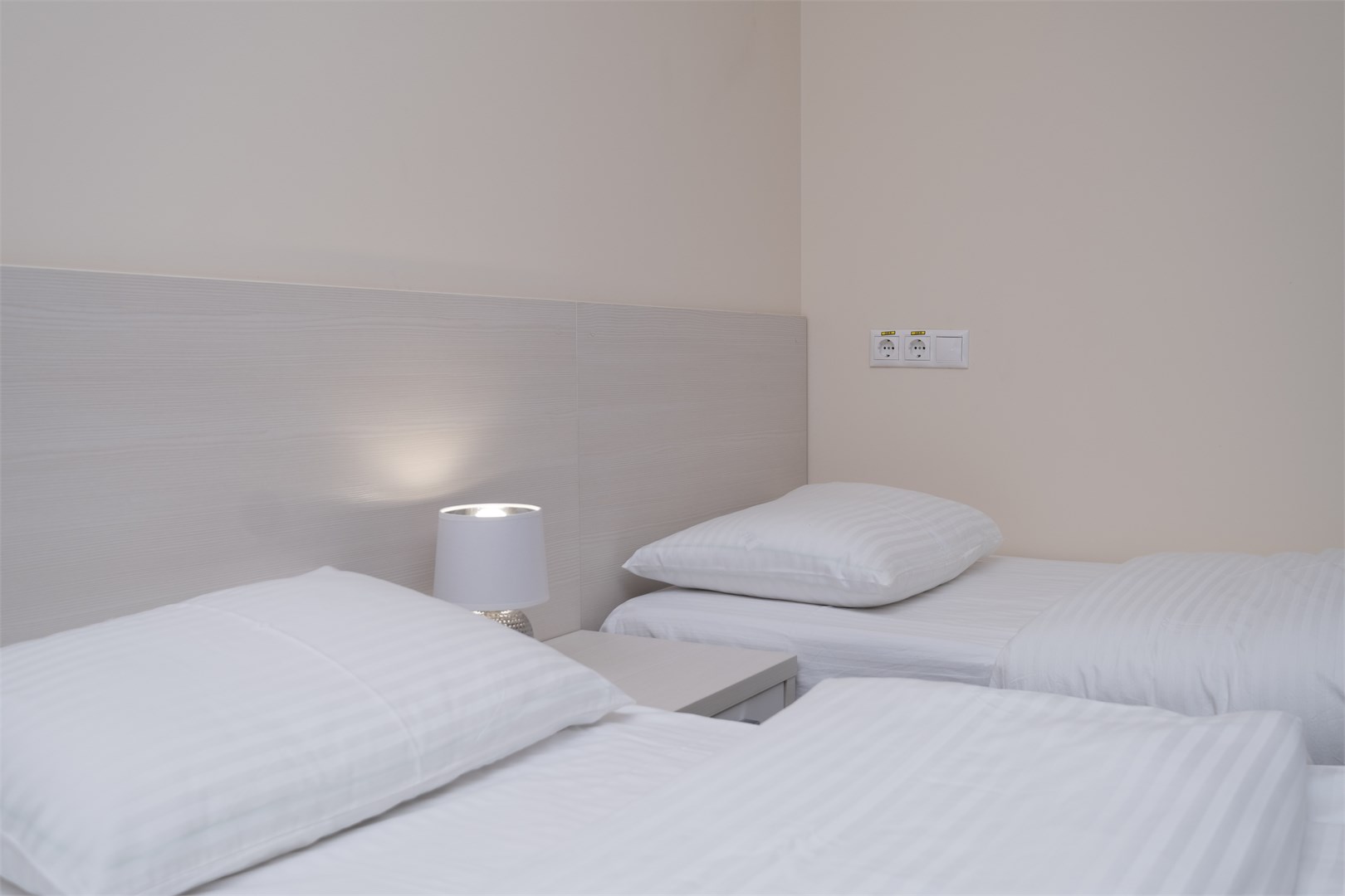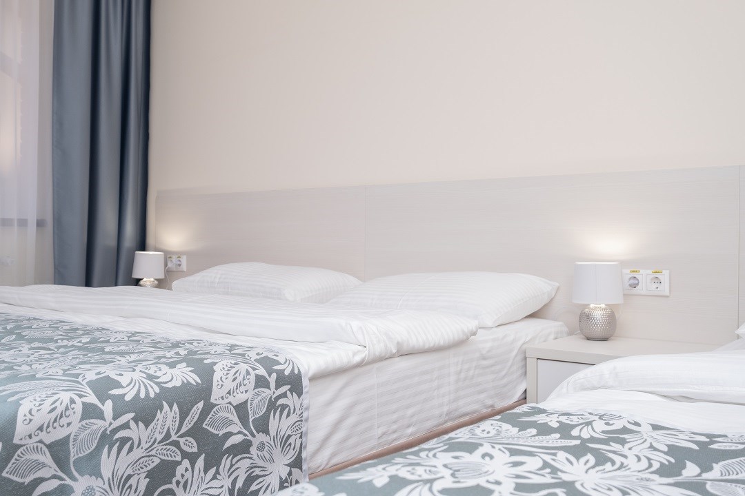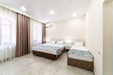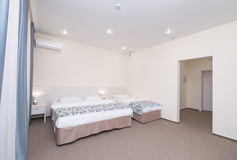 В номере: зеркало, кровать двуспальная, кровать односпальная, прикроватные тумбочки, стол, стулья, шкаф, кондиционер, мини-холодильник, телевизор, телефон, чайная станция