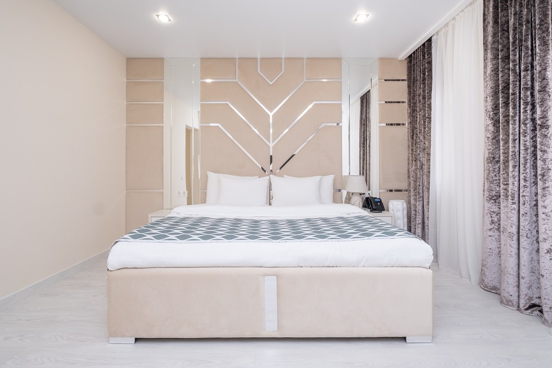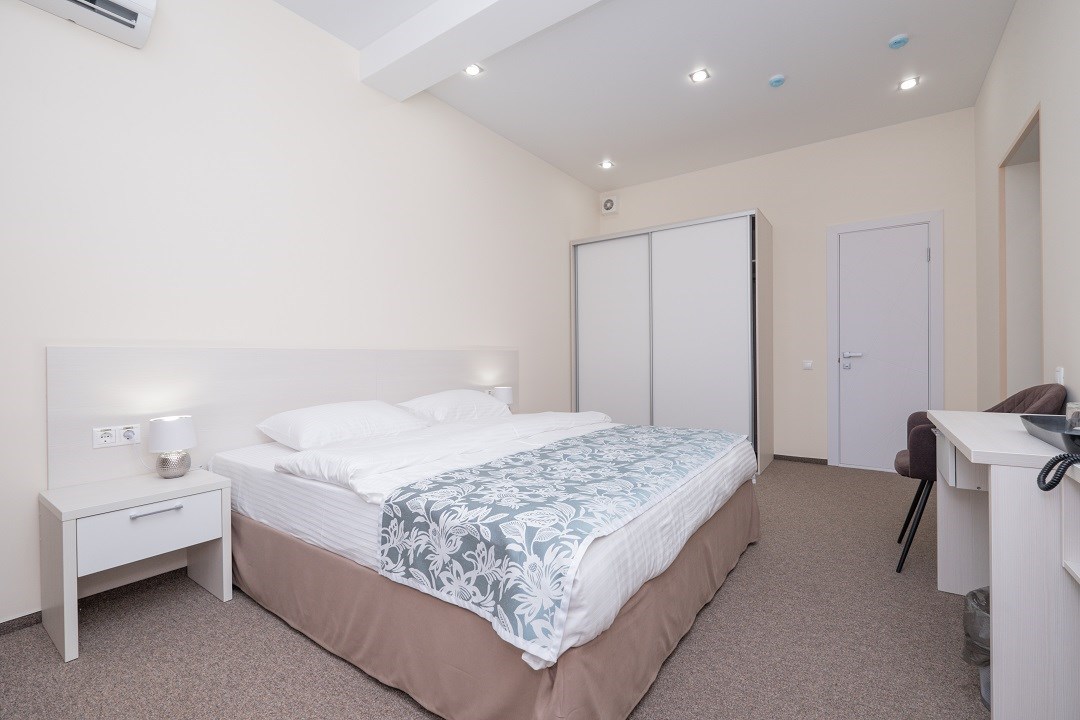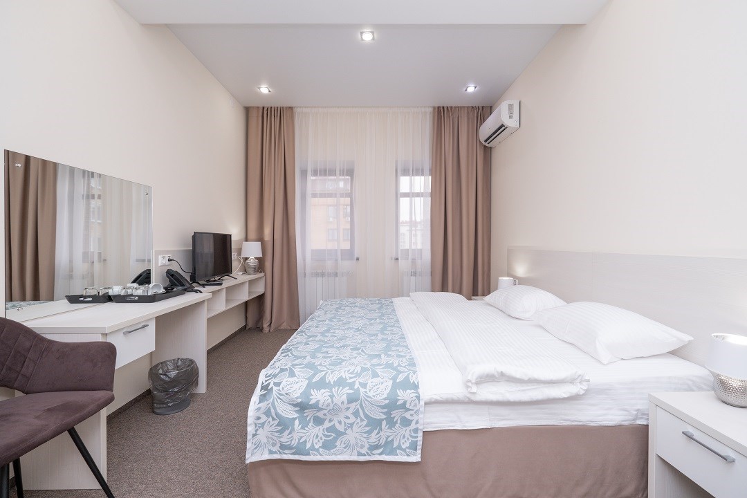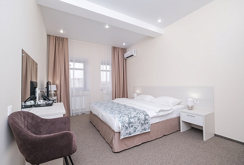 В номере: кровать двуспальная, прикроватные тумбочки, стол, стулья, шкаф, кондиционер, сейф, телевизор, телефон