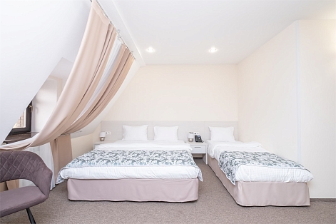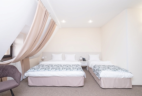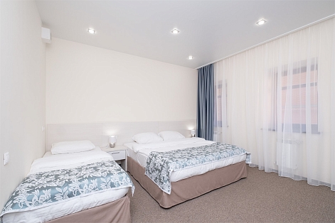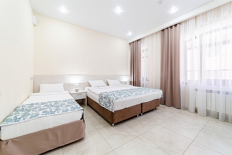 В номере: кровати односпальные, кровать двуспальная, прикроватные тумбочки, стол, стулья, шкаф, кондиционер, мини-холодильник, сейф, телевизор, телефон, чайная станция