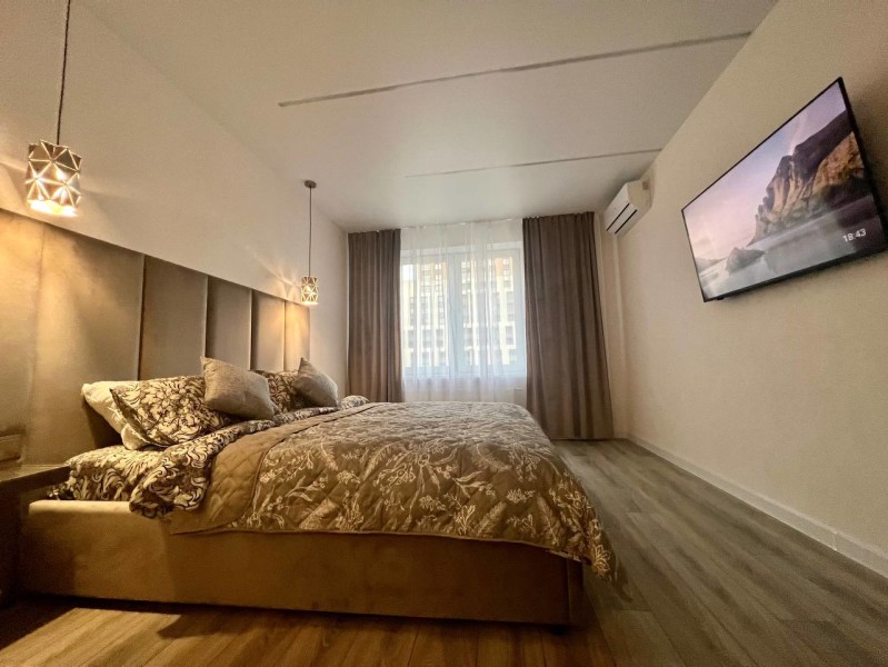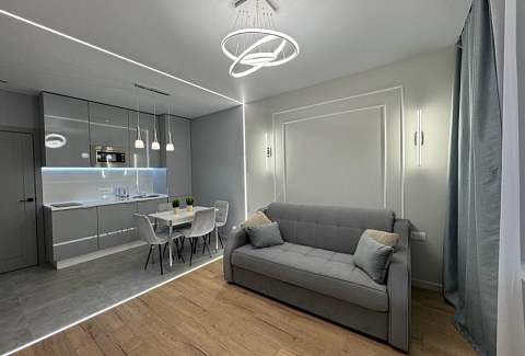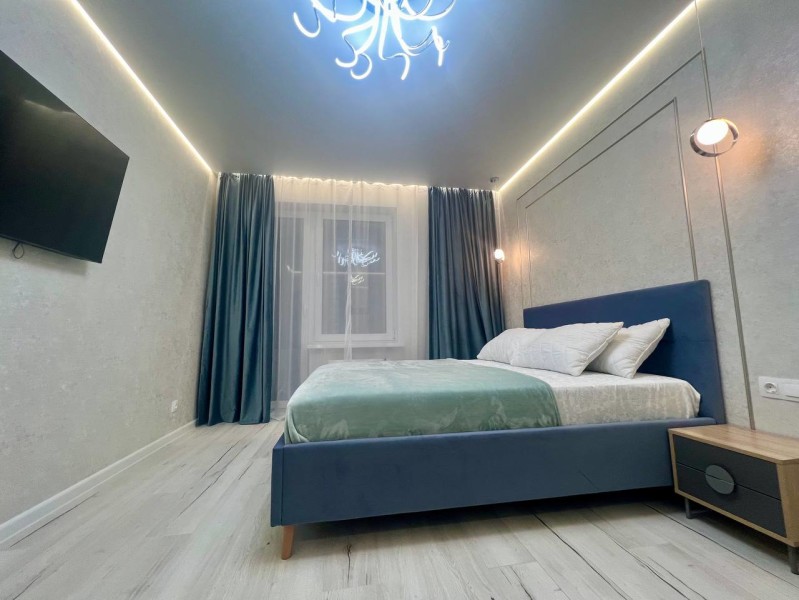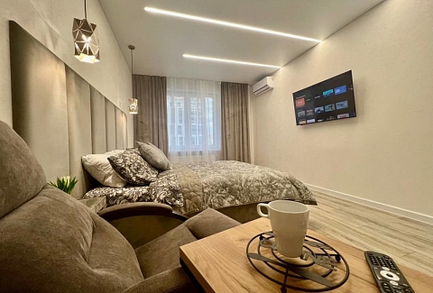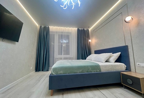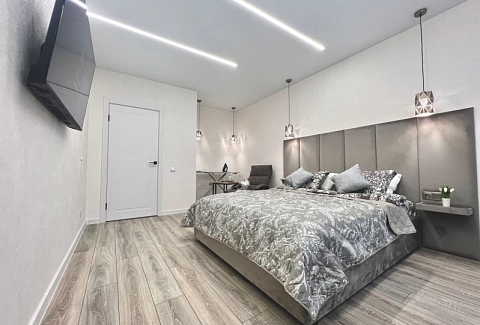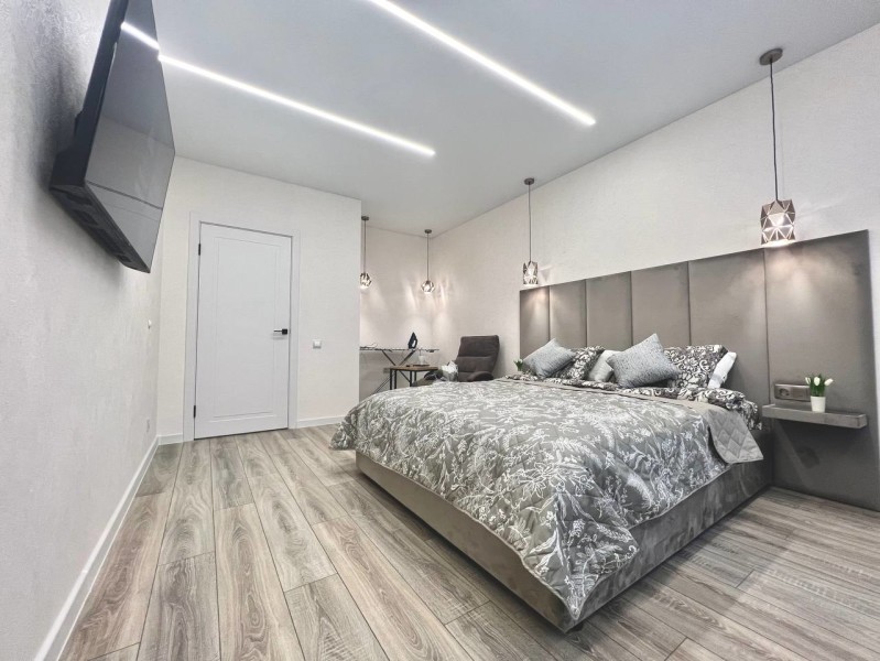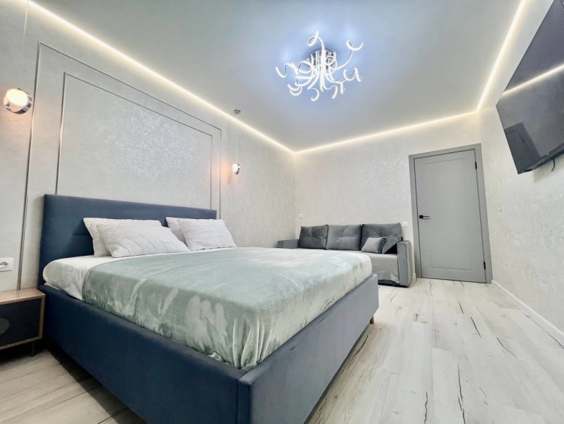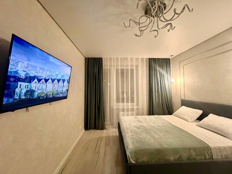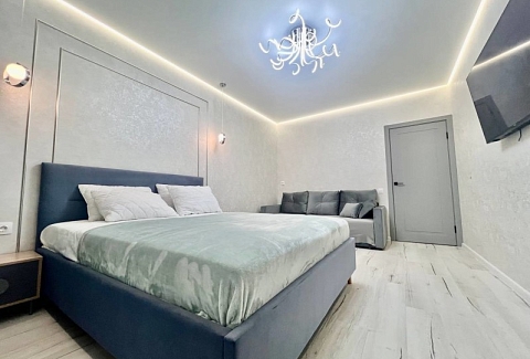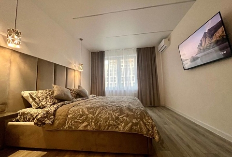 В номере: диван раскладной, кровать двуспальная, стол, стулья, шкаф, гладильная доска, кондиционер, микроволновая печь, набор посуды, плита электрическая, стиральная машина, телевизор, утюг, чайник