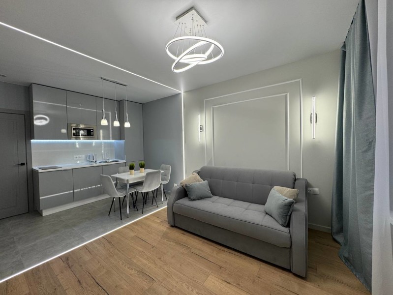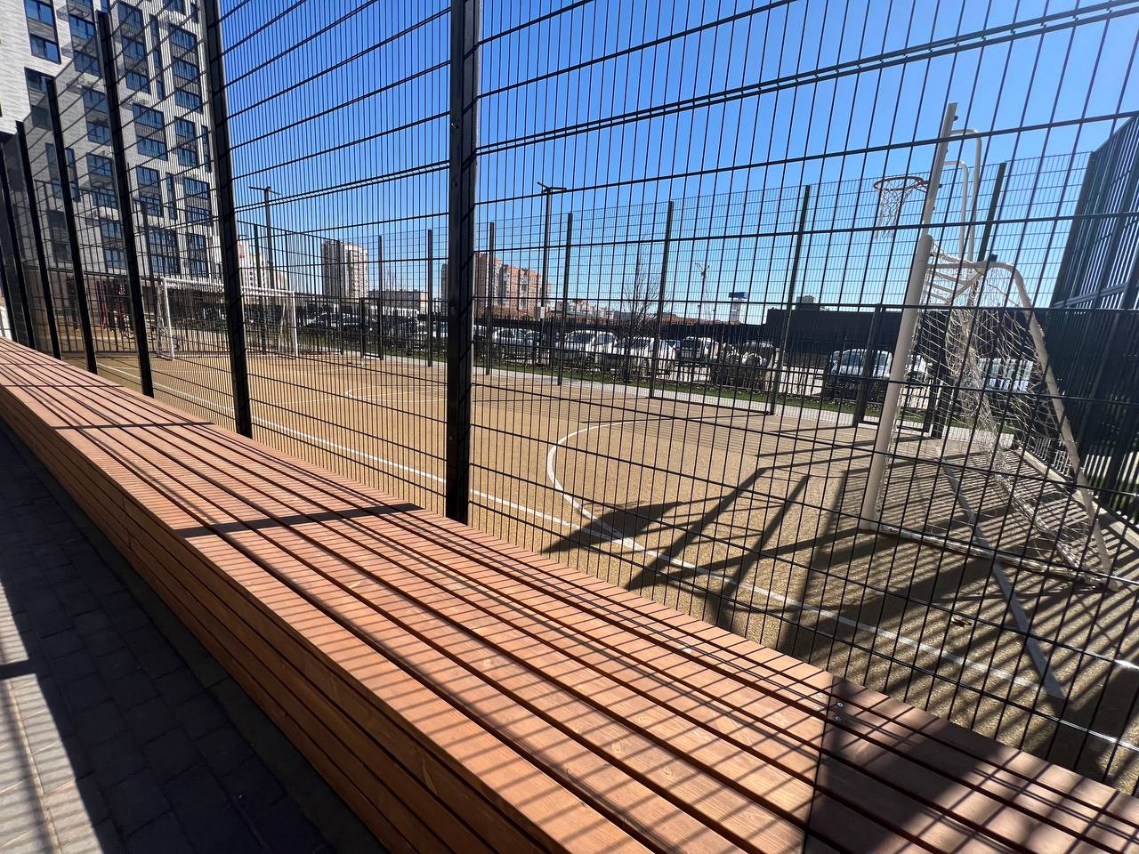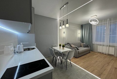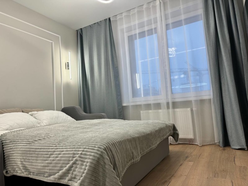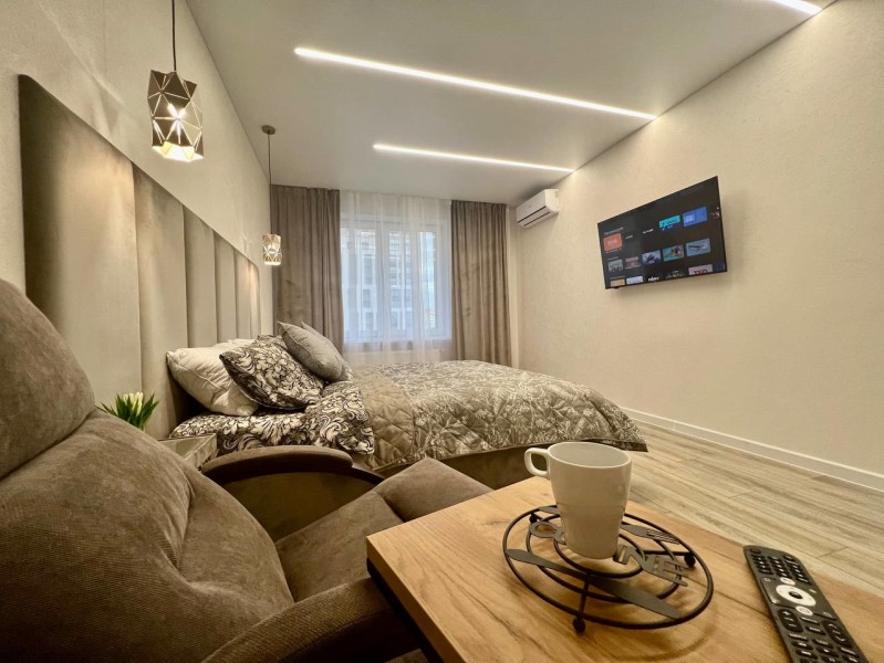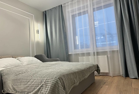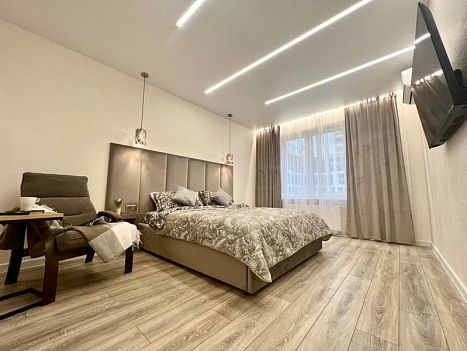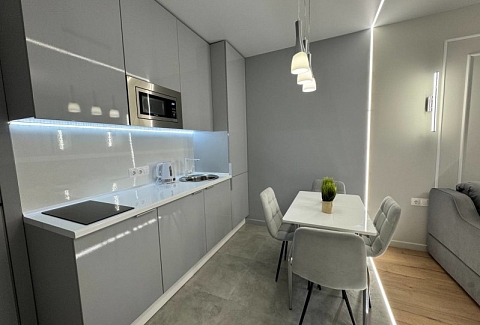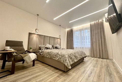 В номере: диван раскладной, кровать двуспальная, стол, стулья, шкаф, гладильная доска, кондиционер, микроволновая печь, набор посуды, плита электрическая, стиральная машина, телевизор, утюг, чайник