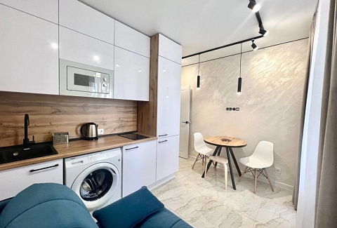 В номере: кровать двуспальная, прикроватные тумбочки, стол, стулья, шкаф, гладильная доска, кондиционер, кофемашина, микроволновая печь, набор посуды, плита электрическая, стиральная машина, телевизор, чайник