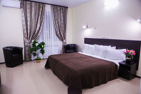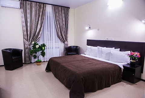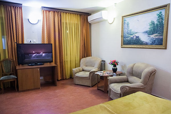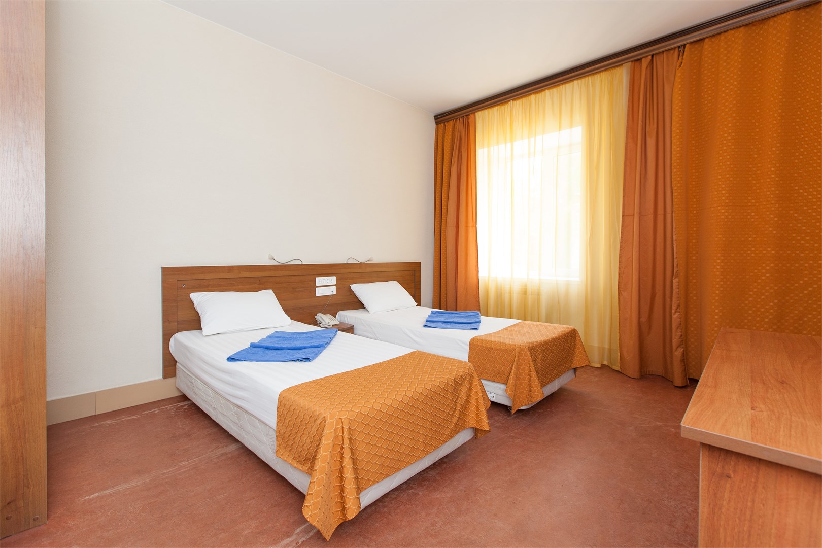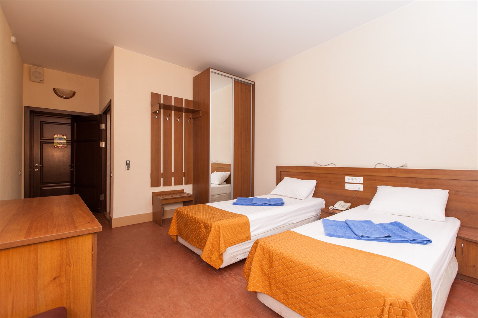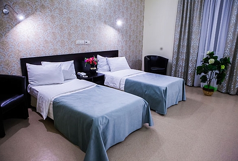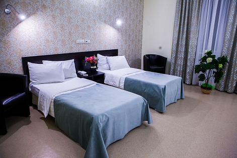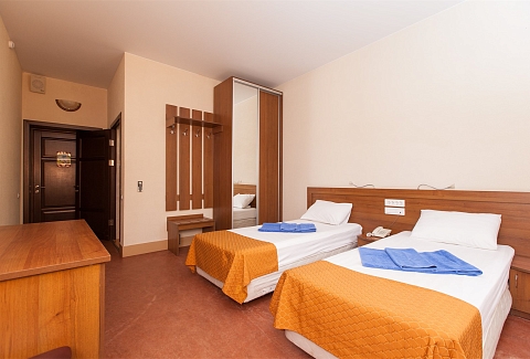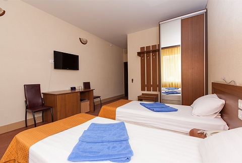 В номере: вешалка, зеркало, кровати односпальные /одна двуспальная кровать, прикроватные тумбочки, стол, стулья, шкаф, кондиционер, мини-холодильник, телевизор, телефон