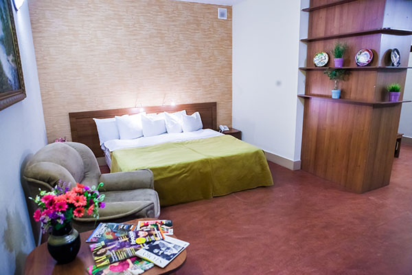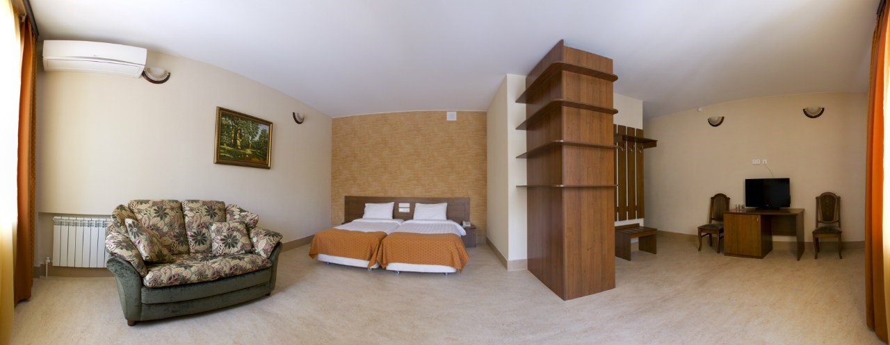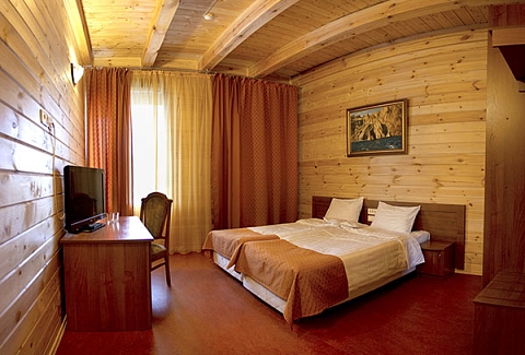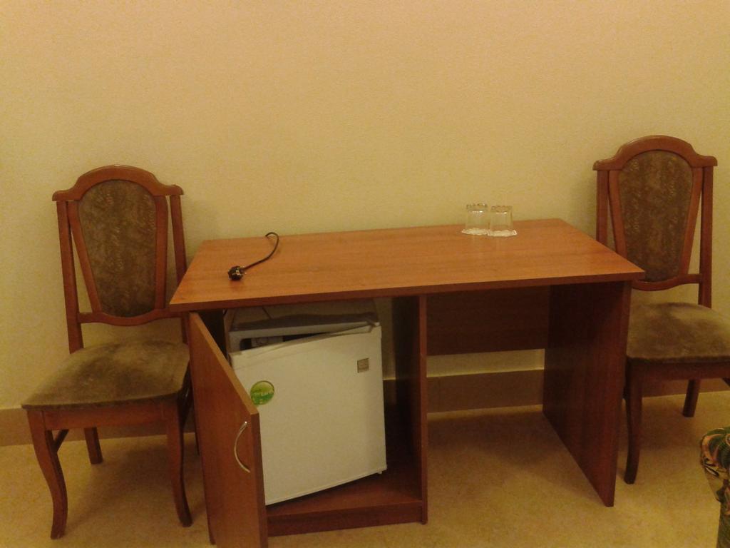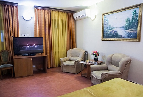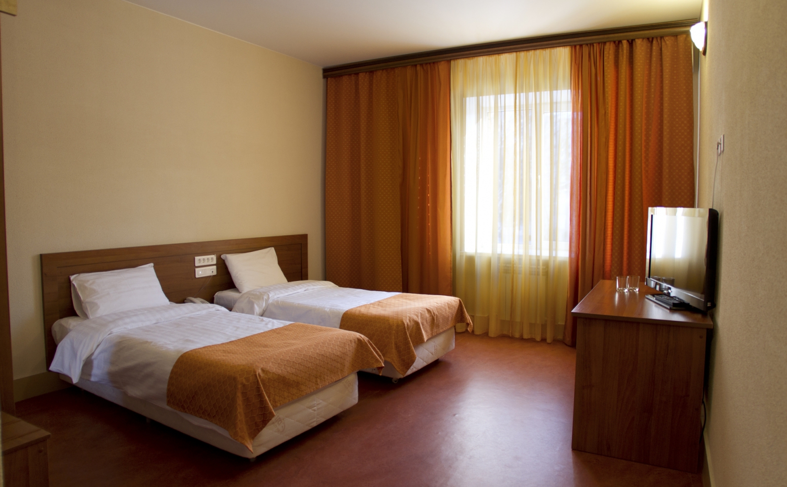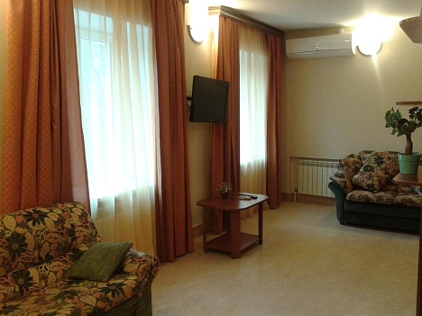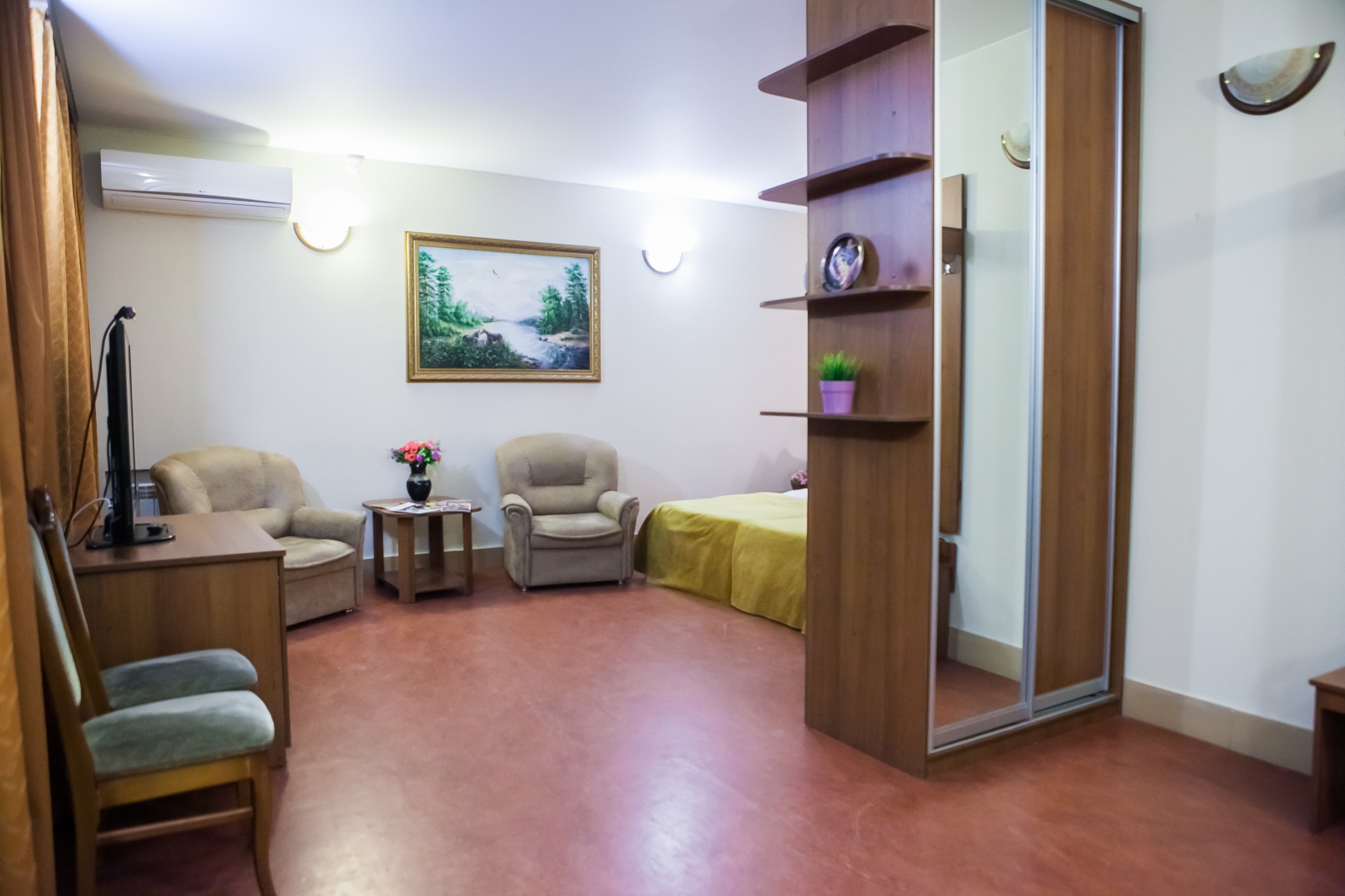 В номере: вешалка, зеркало, кровати односпальные /одна двуспальная кровать, прикроватные тумбочки, стол, стулья, шкаф, кондиционер, мини-холодильник, телевизор, телефон