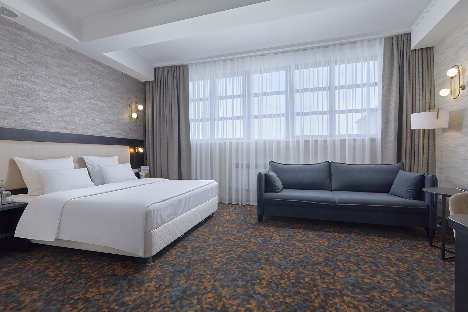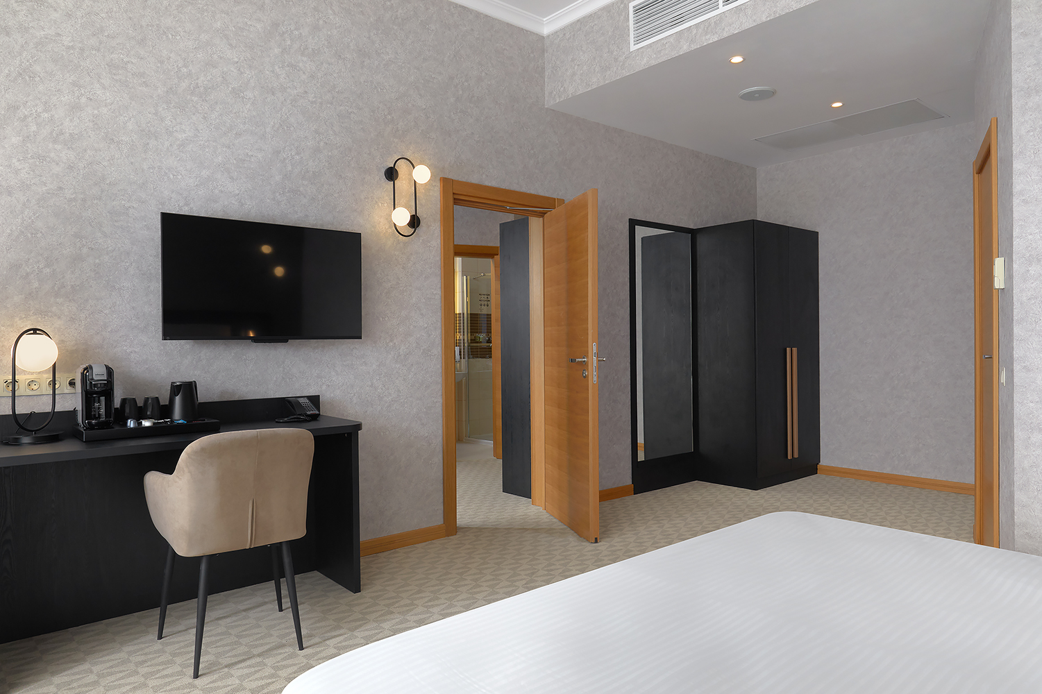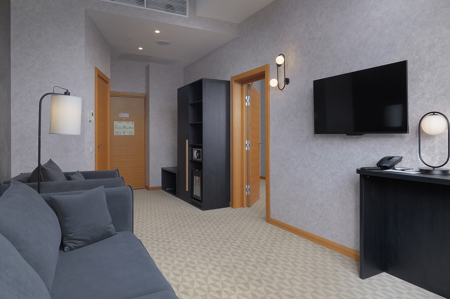В номере: вешалка, диван раскладной, кровать двуспальная, прикроватные тумбочки, стол, стул, шкаф, кондиционер, сейф, телевизор, телефон, чайный набор посуды