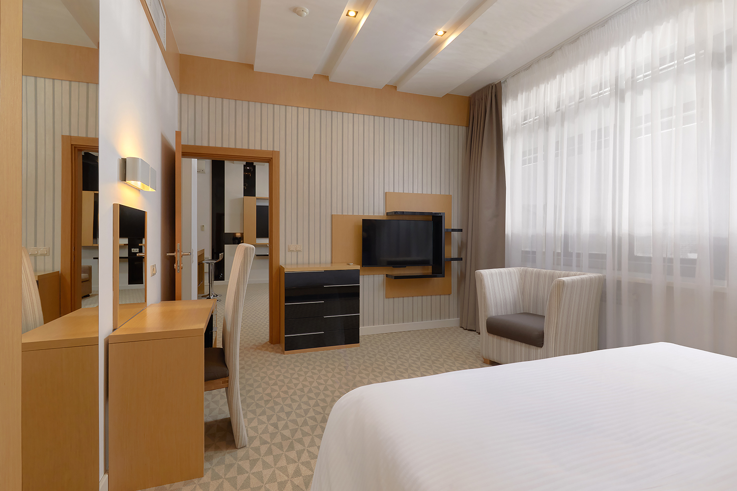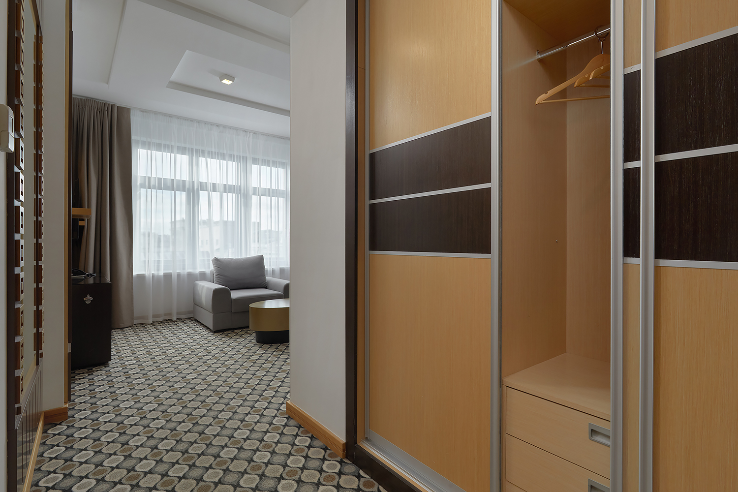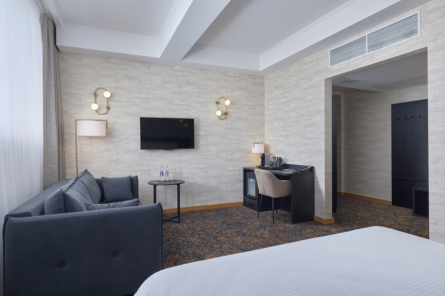 В номере: вешалка, диван раскладной, кровать двуспальная, прикроватные тумбочки, стол, стул, шкаф, кондиционер, сейф, телевизор, телефон, чайный набор посуды