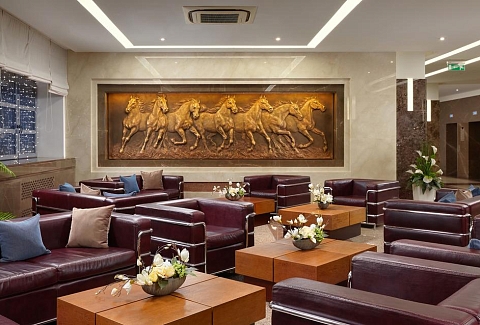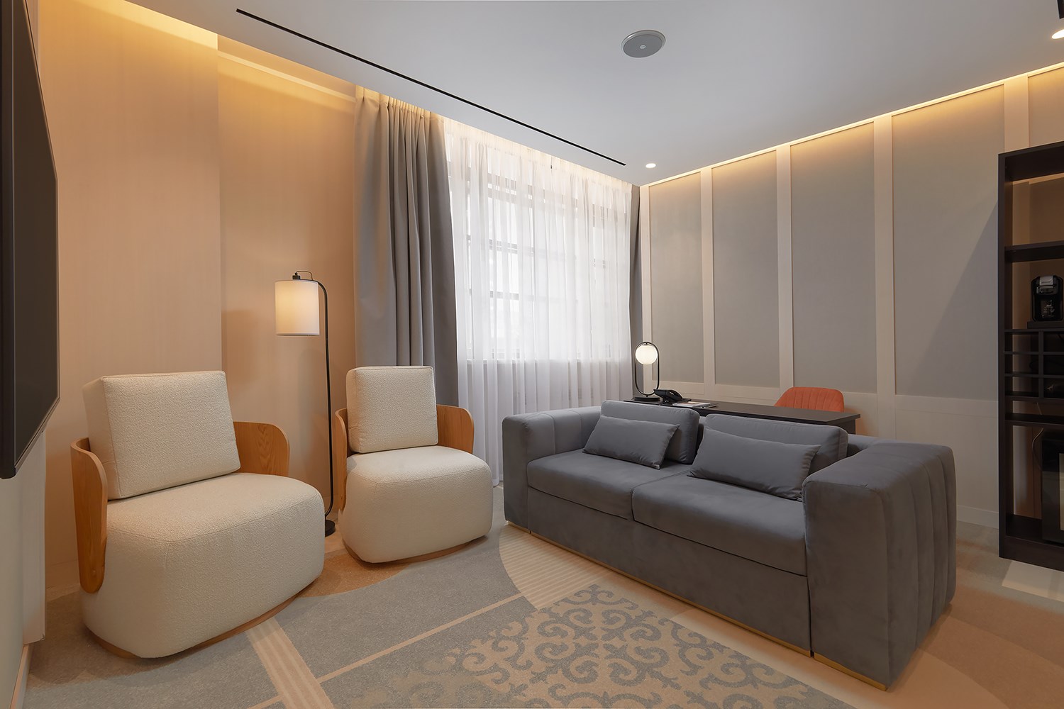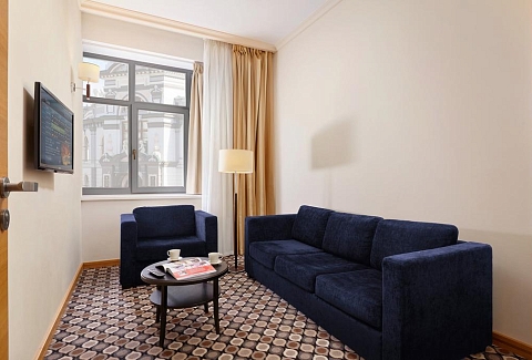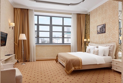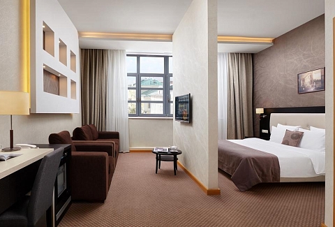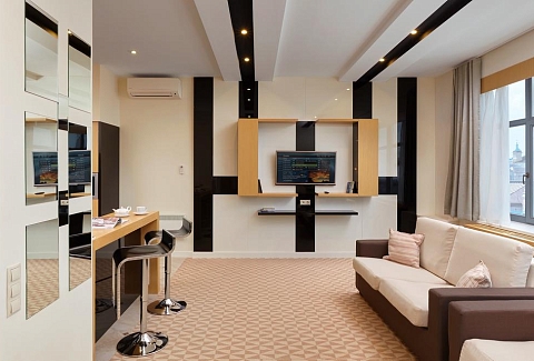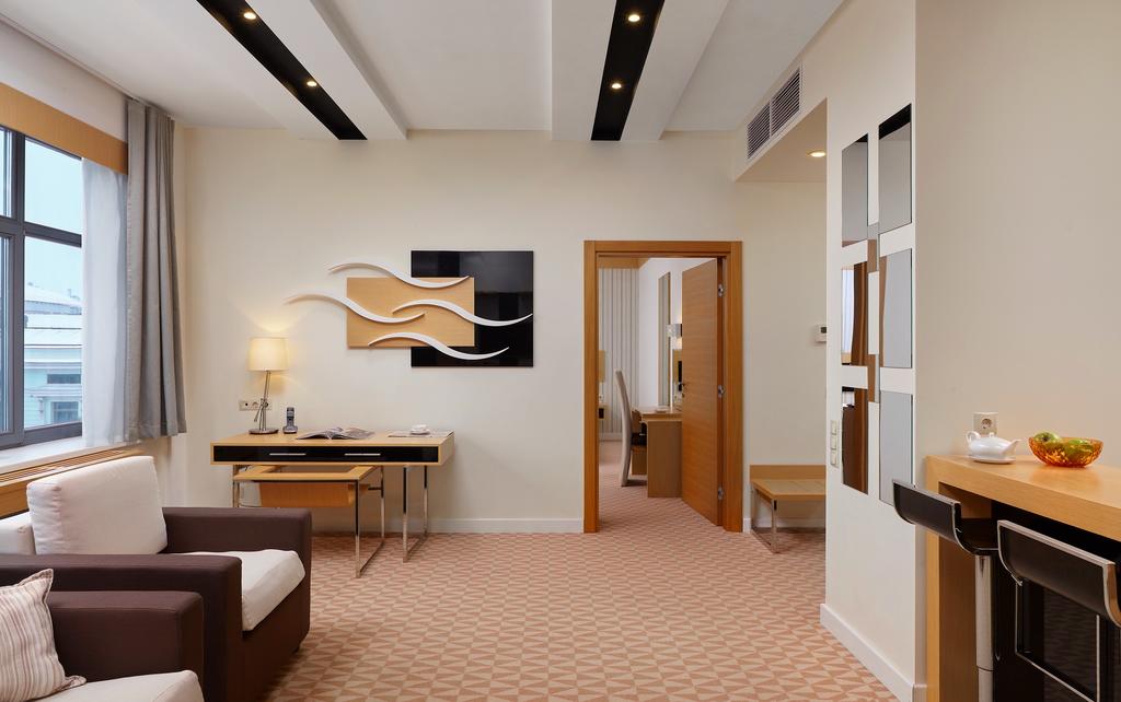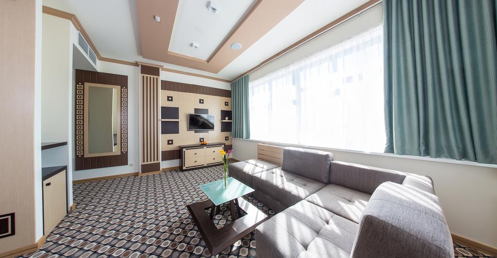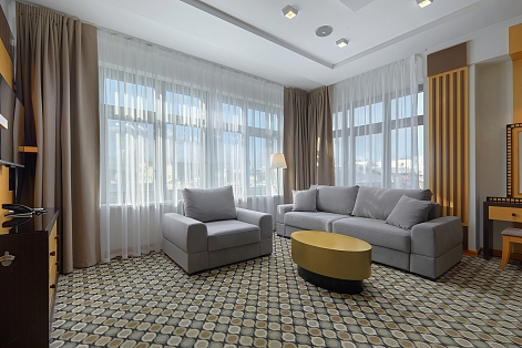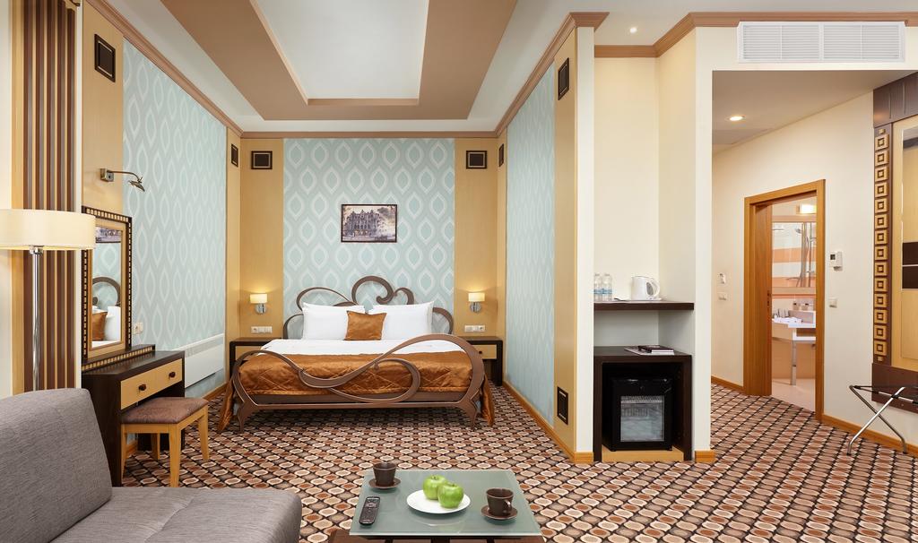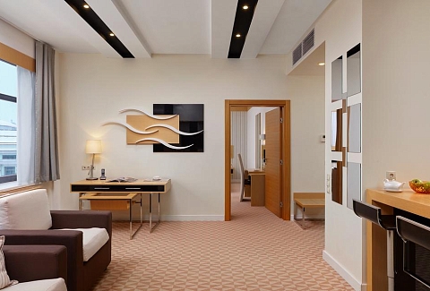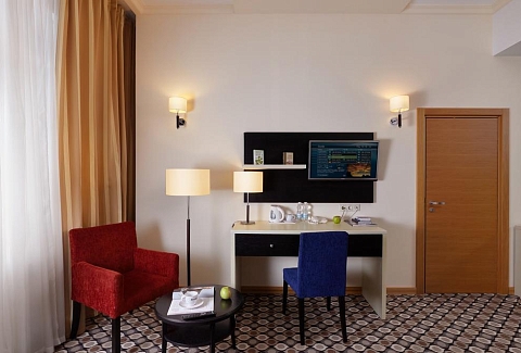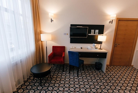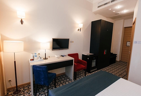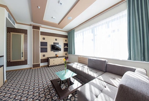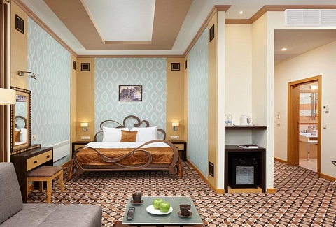 В номере: диван, кровать двуспальная, набор мягкой мебели, стол, стулья, шкаф, кондиционер, мини-холодильник, сейф, телевизор, телефон, чайная станция