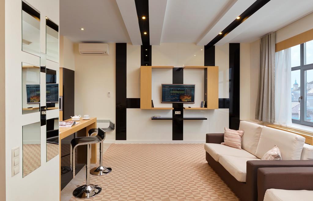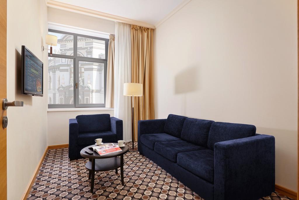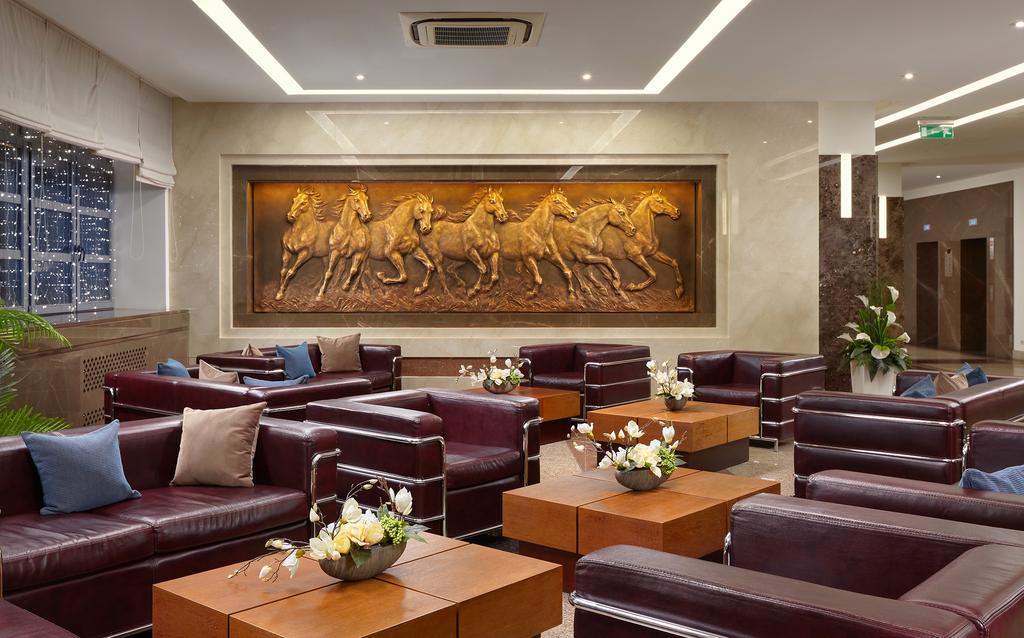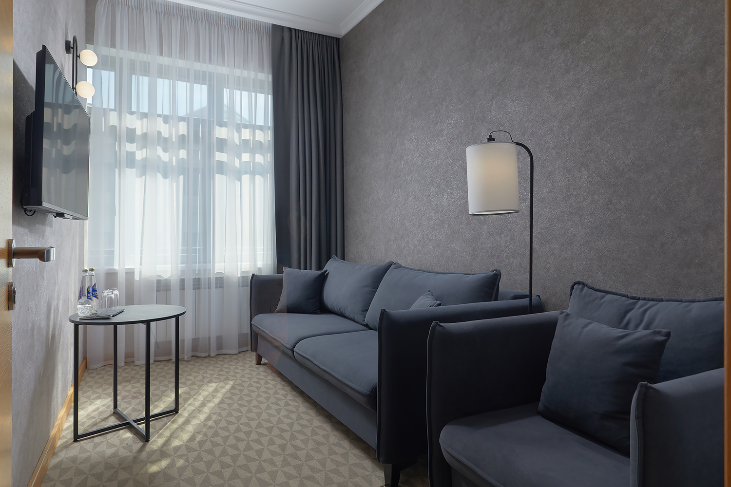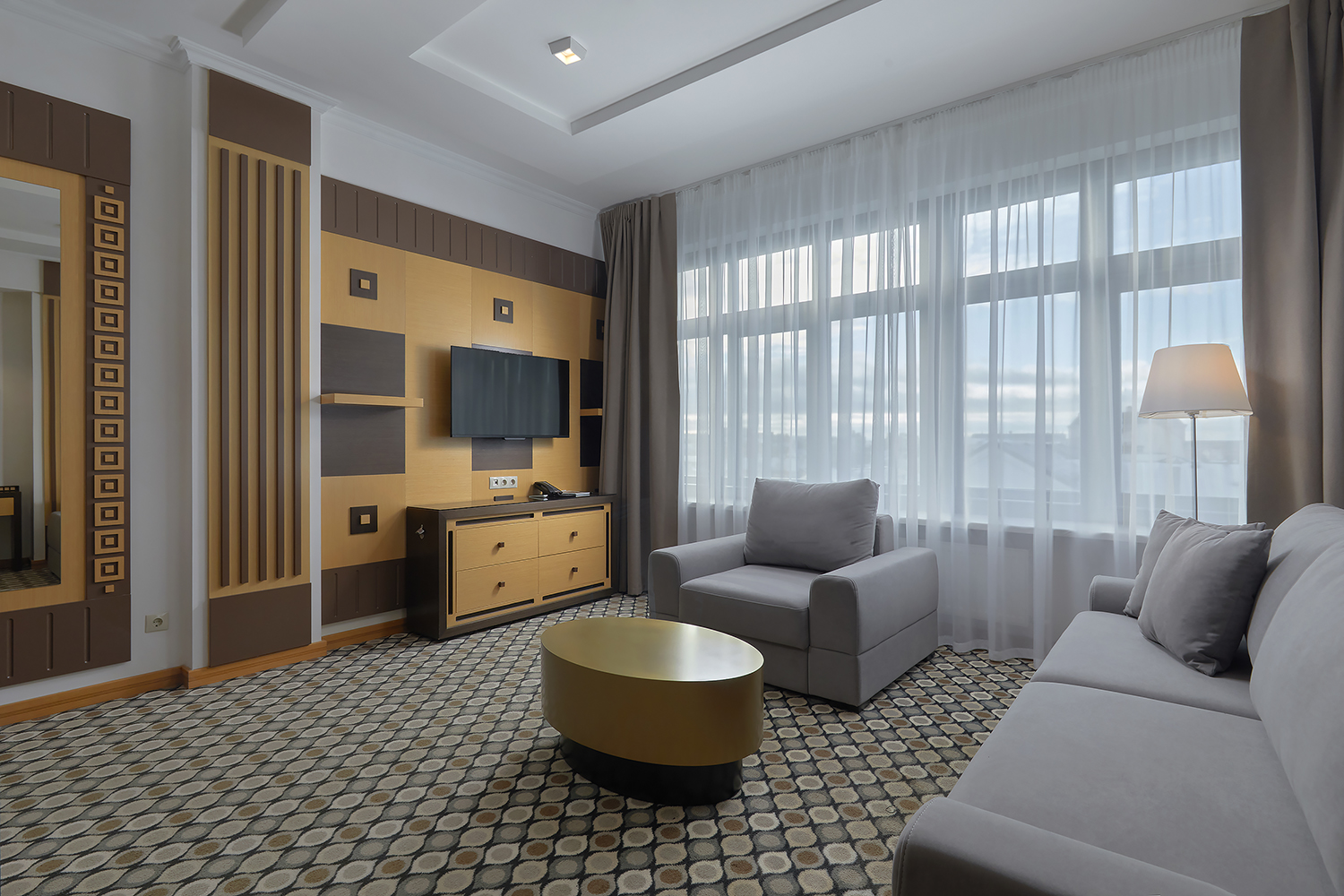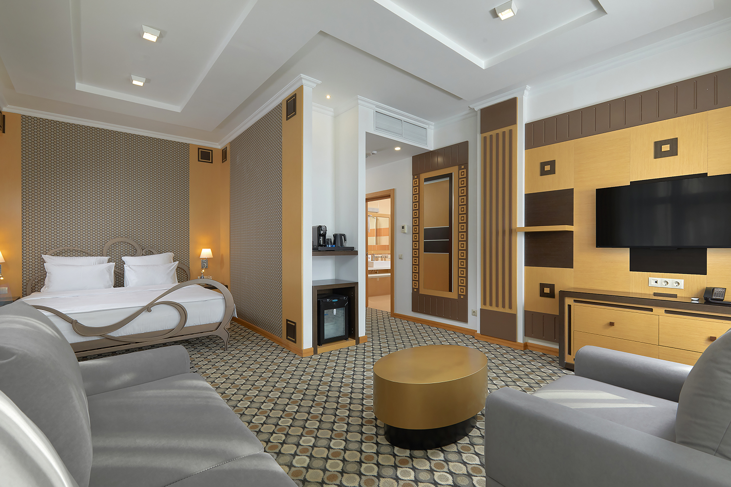 В номере: диван, кровать двуспальная, набор мягкой мебели, стол, стулья, шкаф, кондиционер, мини-холодильник, сейф, телевизор, телефон, чайная станция