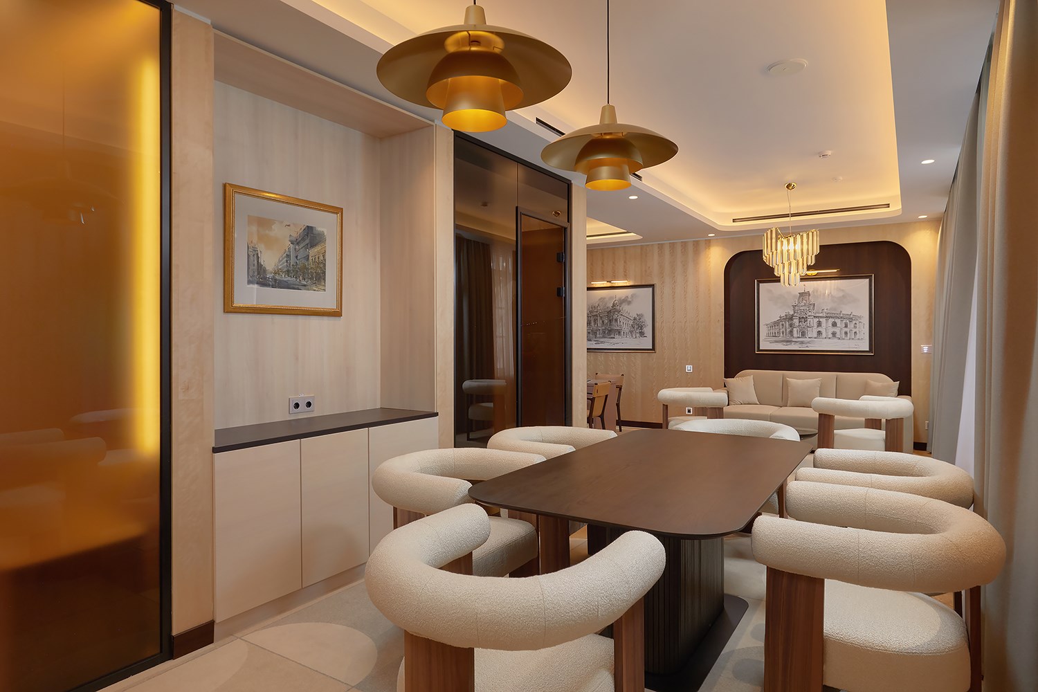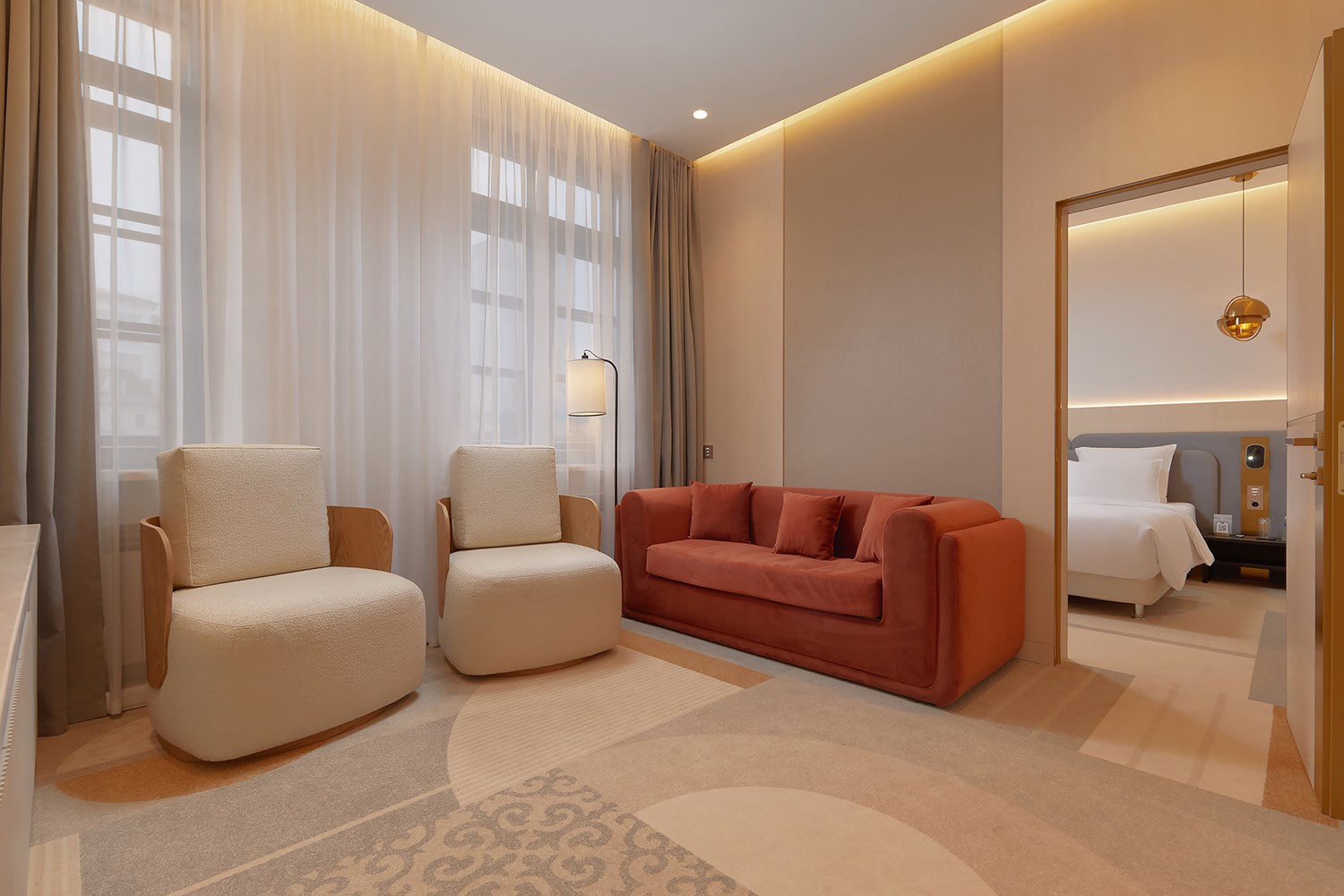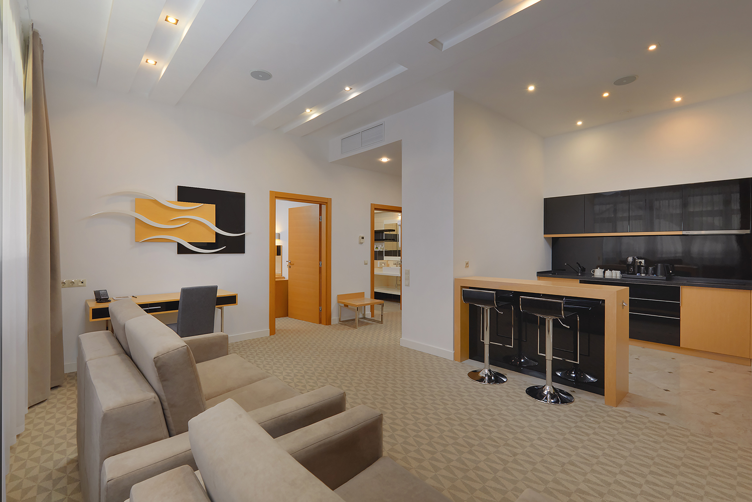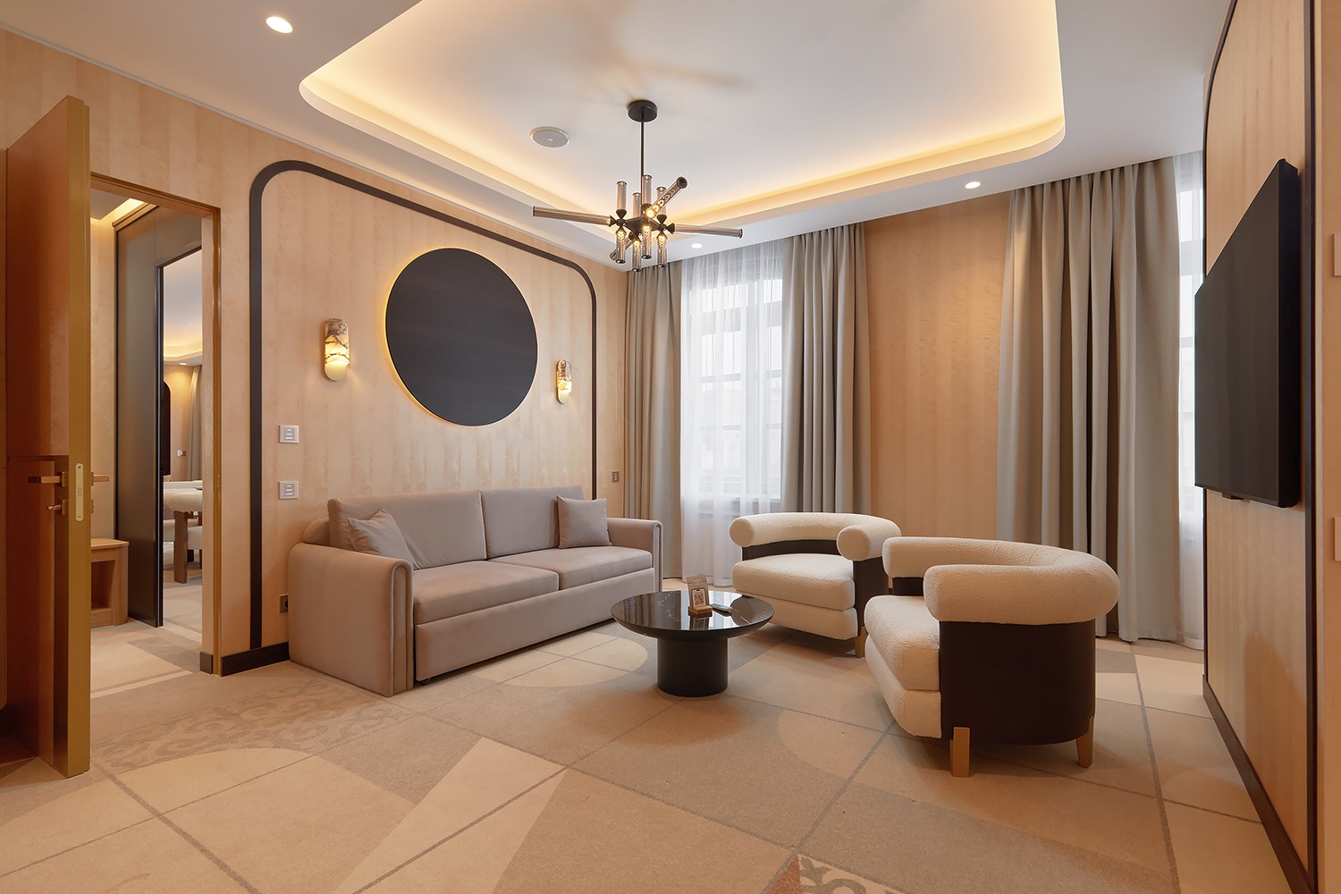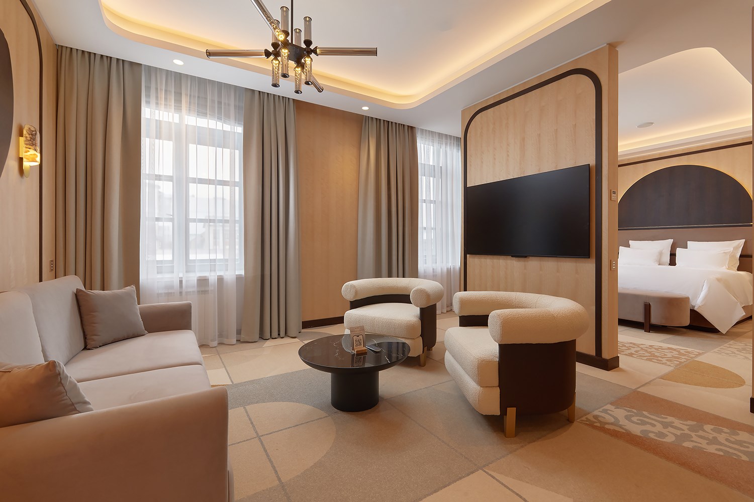 В номере: диван, кровать двуспальная, набор мягкой мебели, стол, стулья, шкаф, кондиционер, мини-холодильник, сейф, телевизор, телефон, чайная станция
