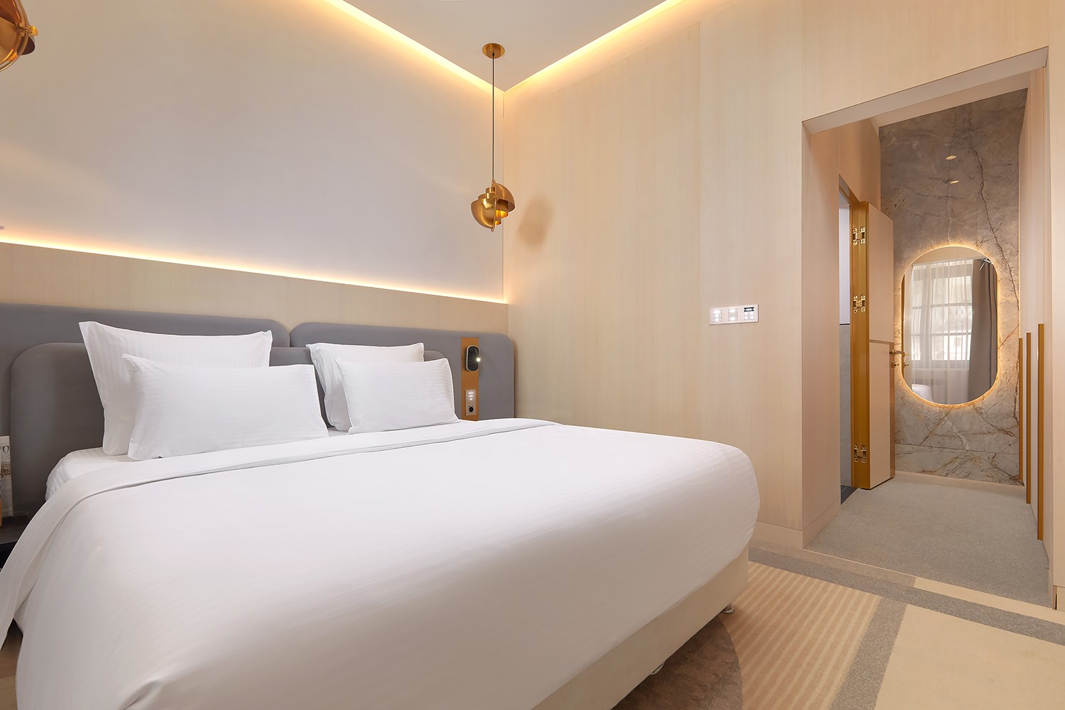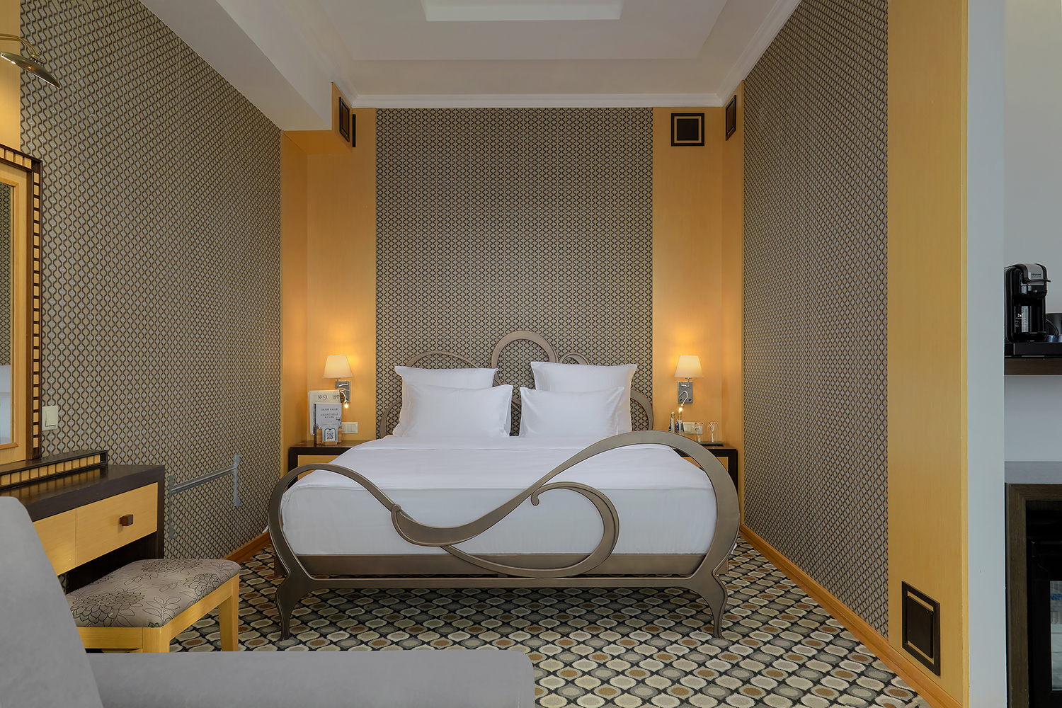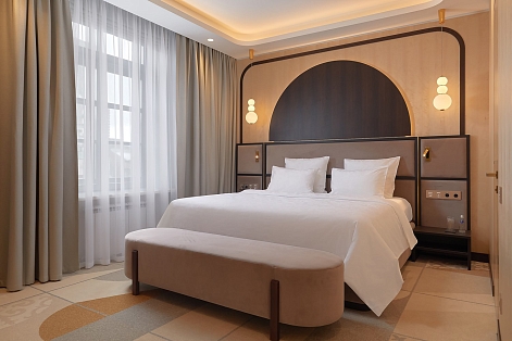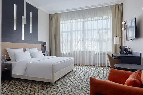 В номере: вешалка, диван раскладной, зеркало, кровать двуспальная, прикроватные тумбочки, стол, стул, шкаф, кондиционер, сейф, телевизор, телефон, чайный набор посуды, электрочайник