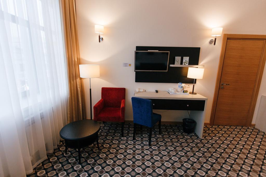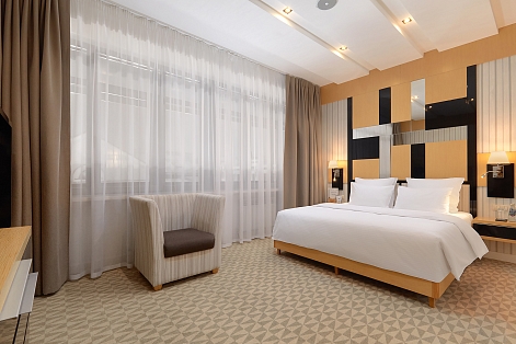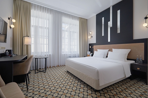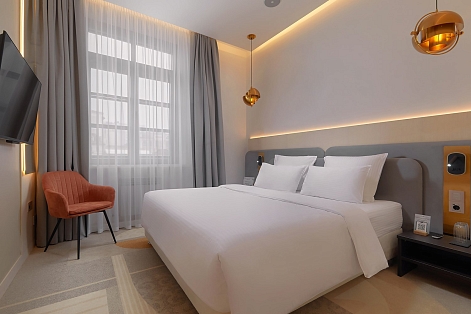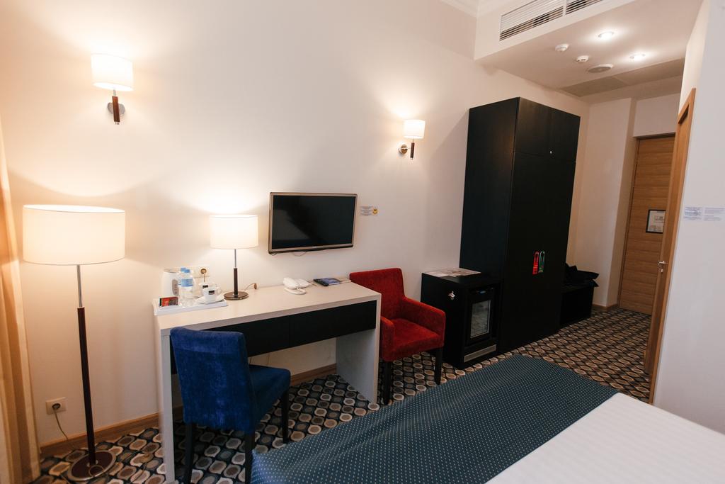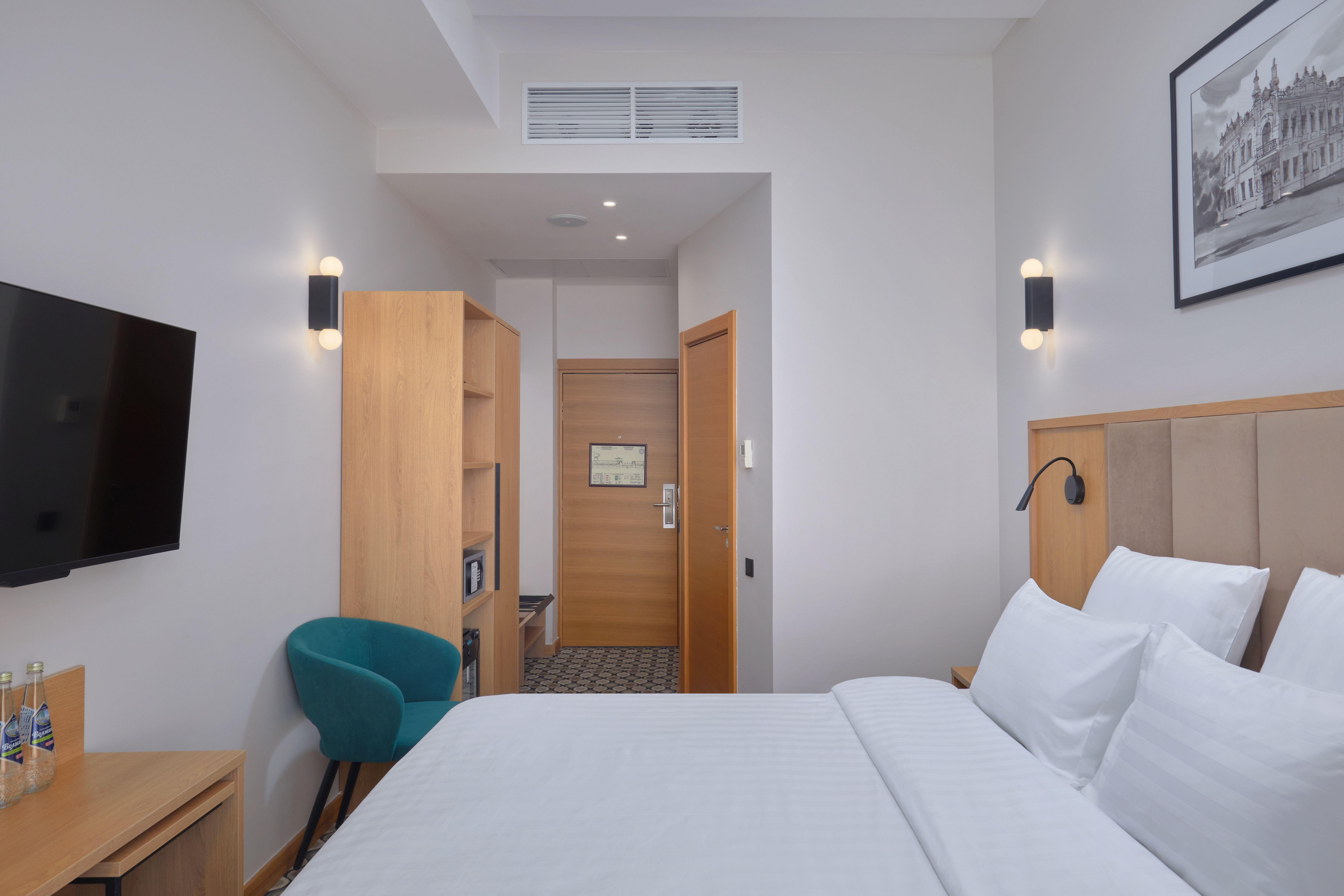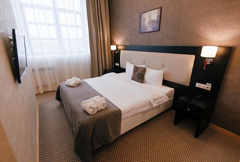 В номере: вешалка, зеркало, кровать двуспальная, прикроватные тумбочки, стол, стулья, шкаф, кондиционер, мини-холодильник, телевизор, телефон, чайник