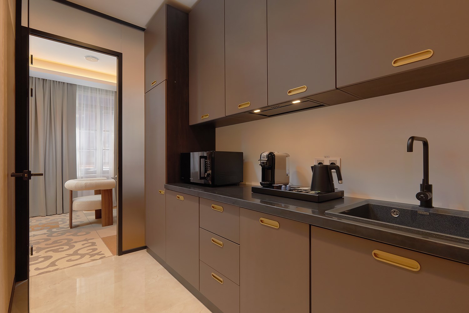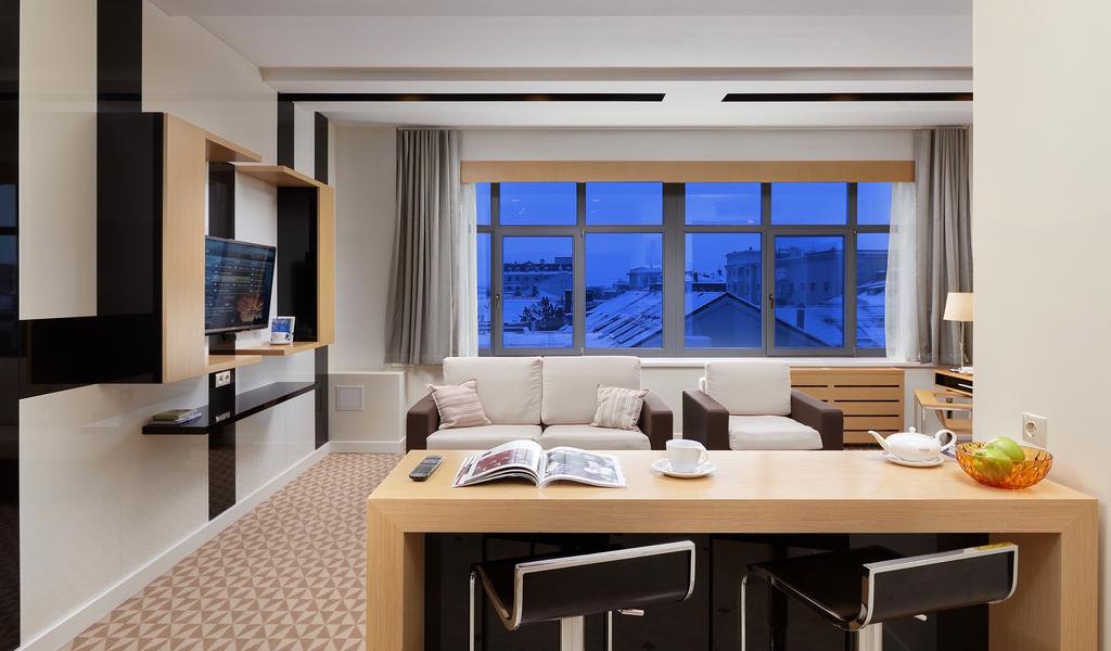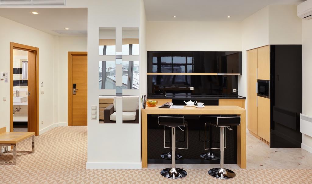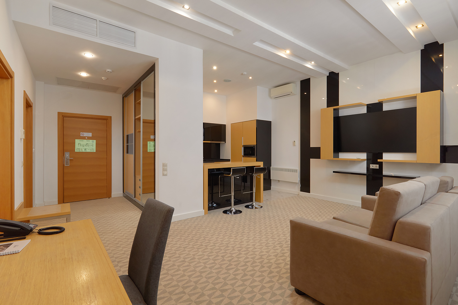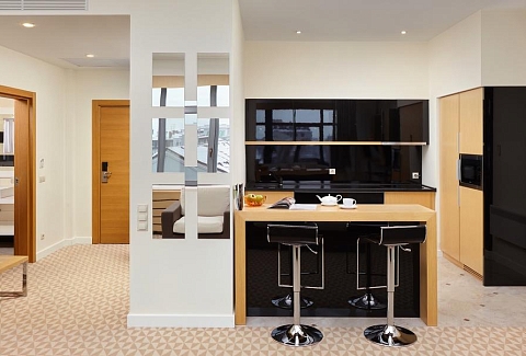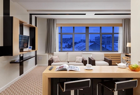В номере: вешалка, диван раскладной, зеркало, кровать двуспальная, кухонная мебель, стол, стулья, шкаф, кондиционер, микроволновая печь, сейф, телевизор, телефон, холодильник