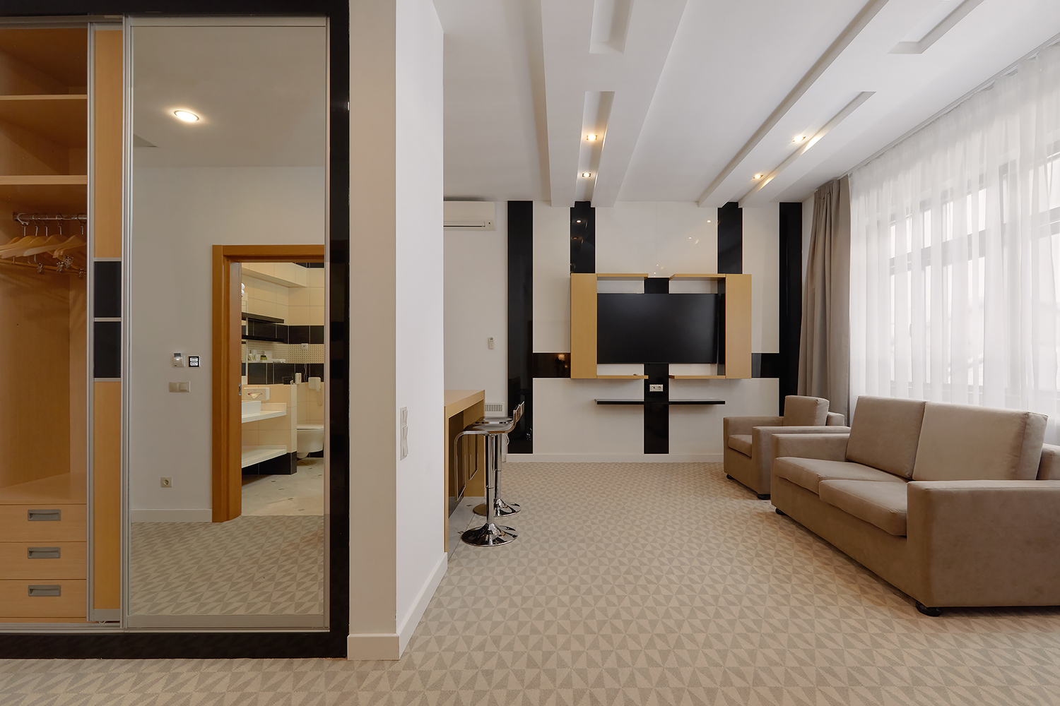 В номере: вешалка, диван раскладной, зеркало, кровать двуспальная, прикроватные тумбочки, стол, стулья, шкаф, кондиционер, сейф, телевизор, телефон, чайный набор посуды, электрочайник