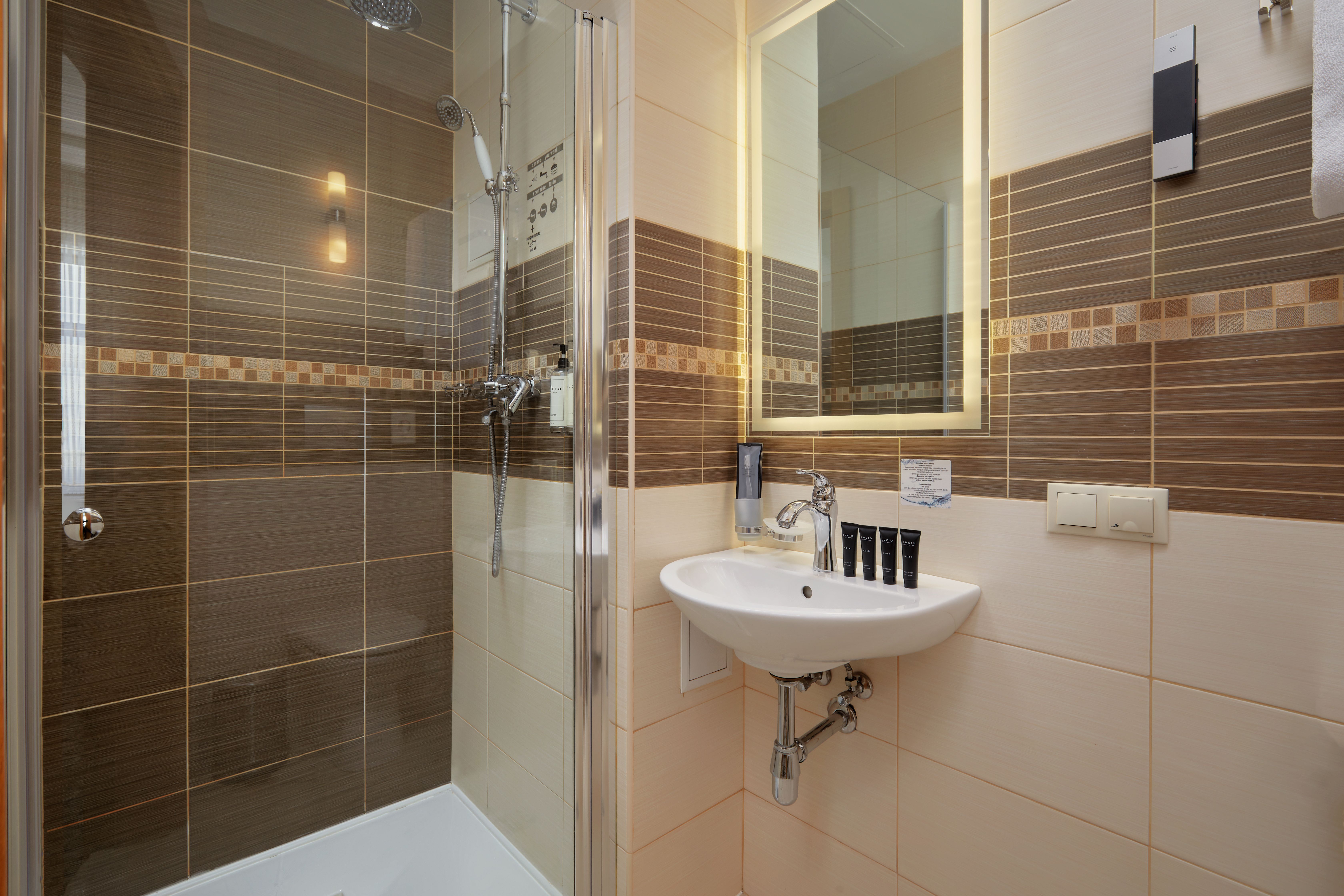 Санузел: с душевой кабиной, тапочки, туалетные принадлежности, фен