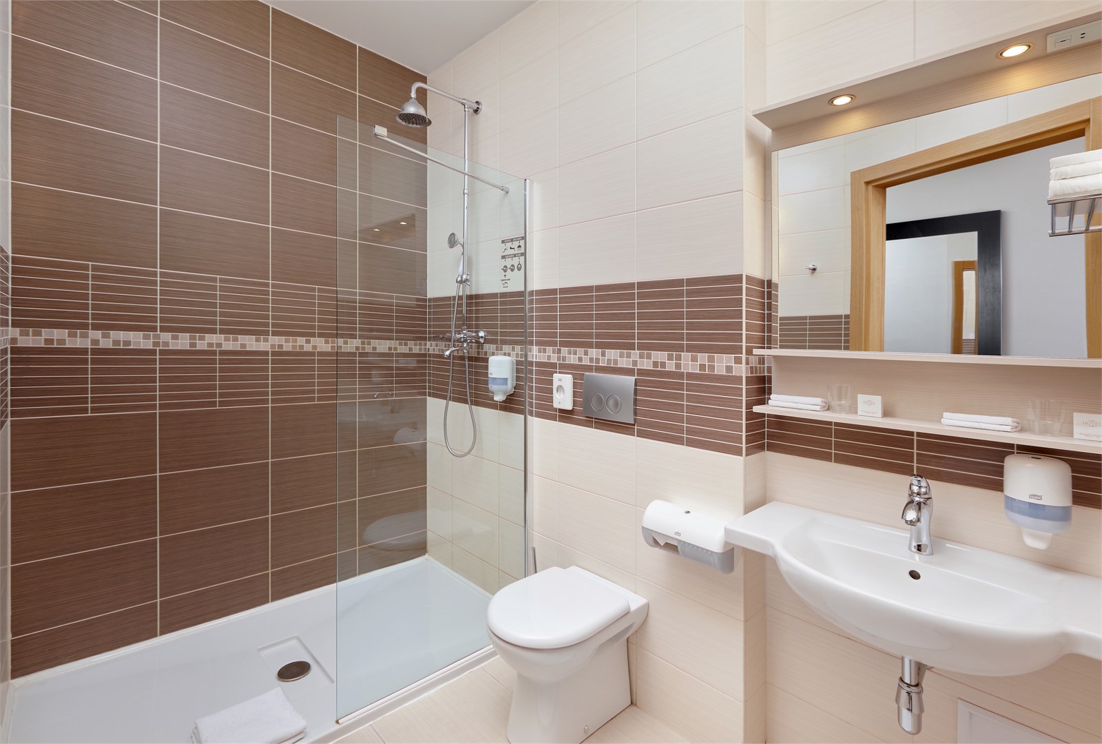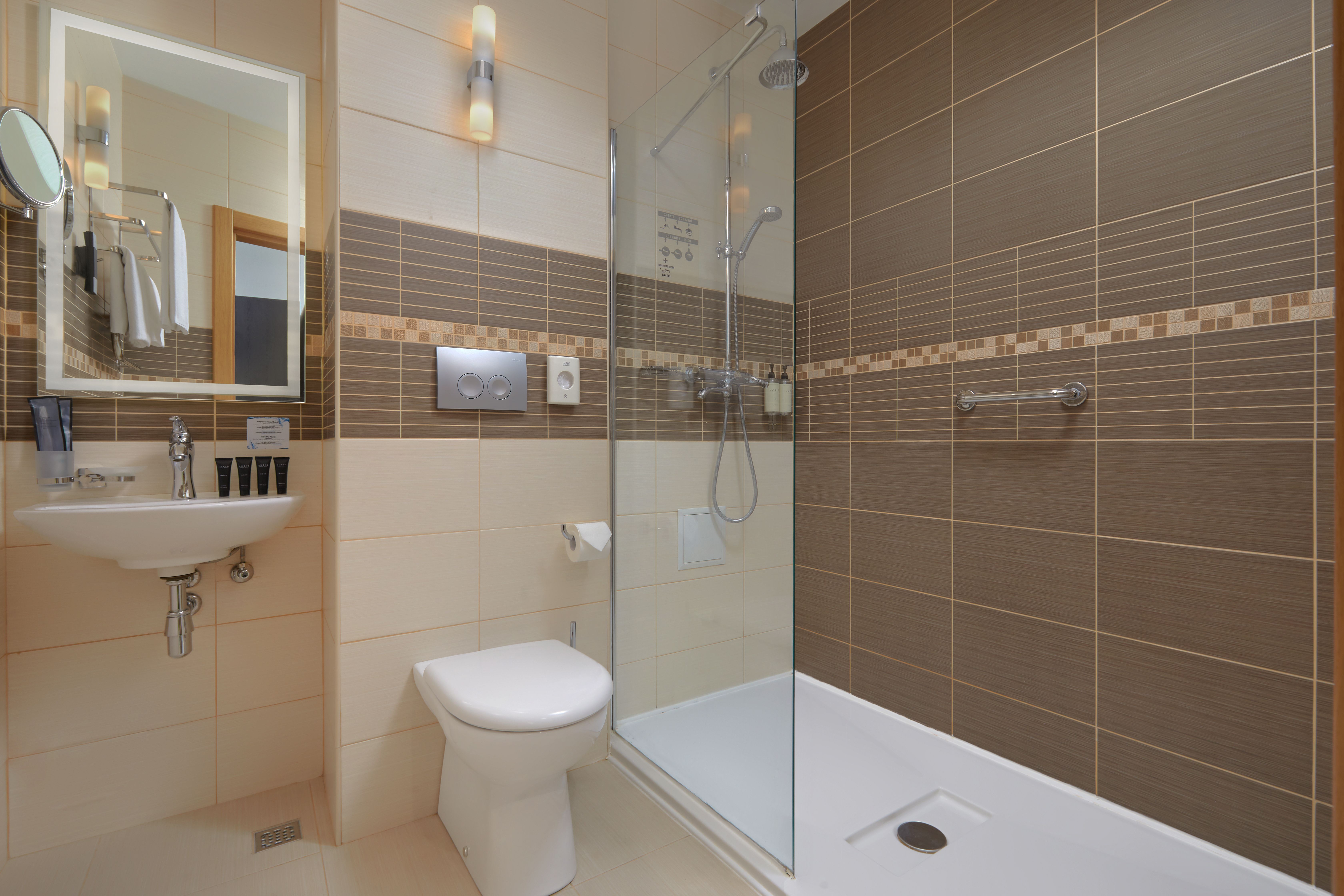 Санузел: с душем или ванной, тапочки, туалетные принадлежности, фен