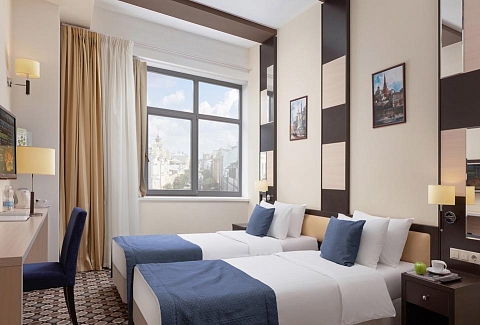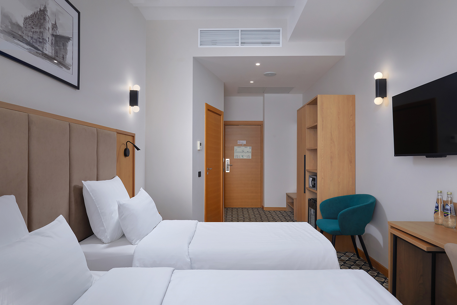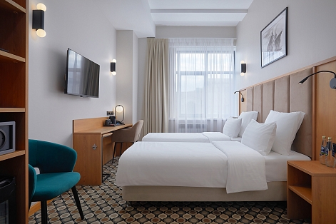 В номере: вешалка, зеркало, кровати односпальные, прикроватные тумбочки, стол, стул, шкаф, кондиционер, сейф, телевизор, телефон, чайный набор посуды, электрочайник