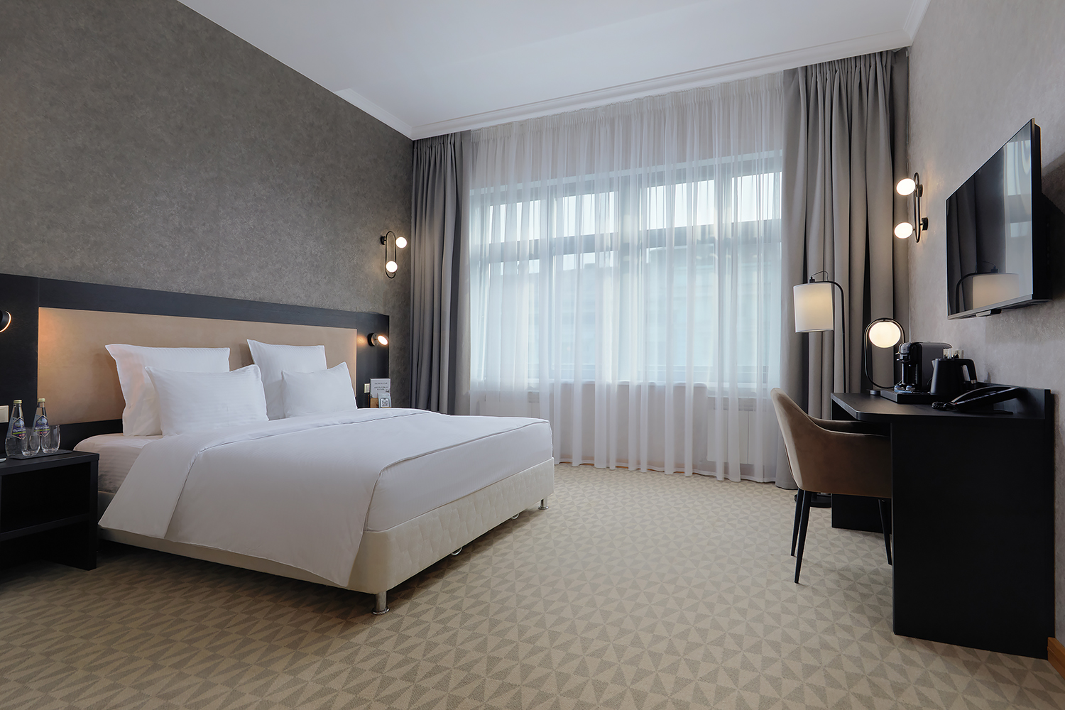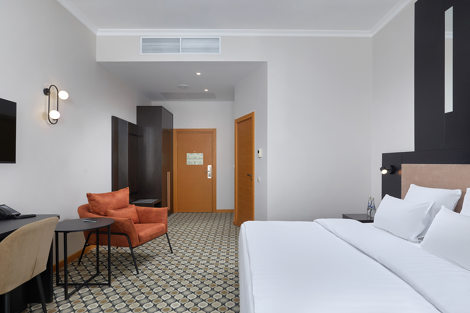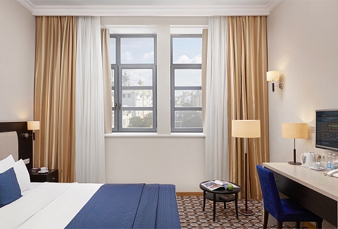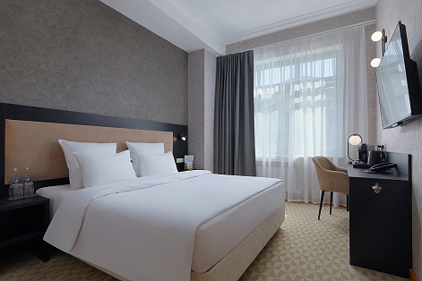 В номере: вешалка, зеркало, кровать двуспальная, прикроватные тумбочки, стол, стул, шкаф, кондиционер, сейф, телевизор, телефон, чайный набор посуды, электрочайник