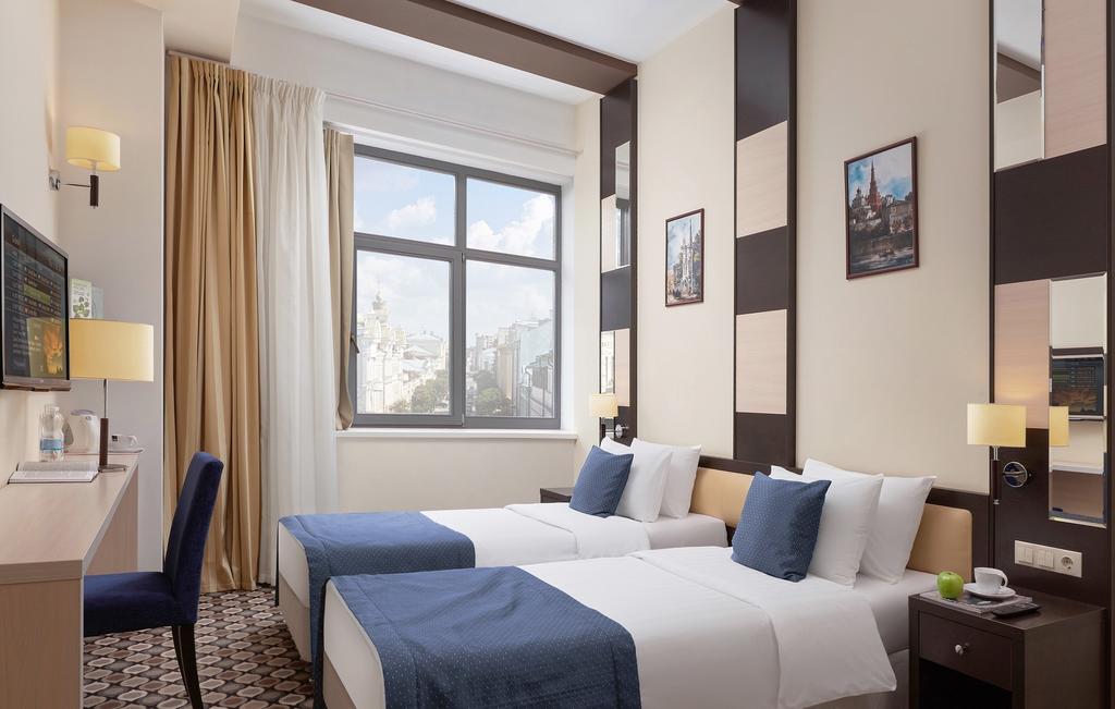 В номере: вешалка, зеркало, кровати односпальные, прикроватные тумбочки, стол, стулья, шкаф, кондиционер, сейф, телевизор, телефон, чайный набор посуды, электрочайник